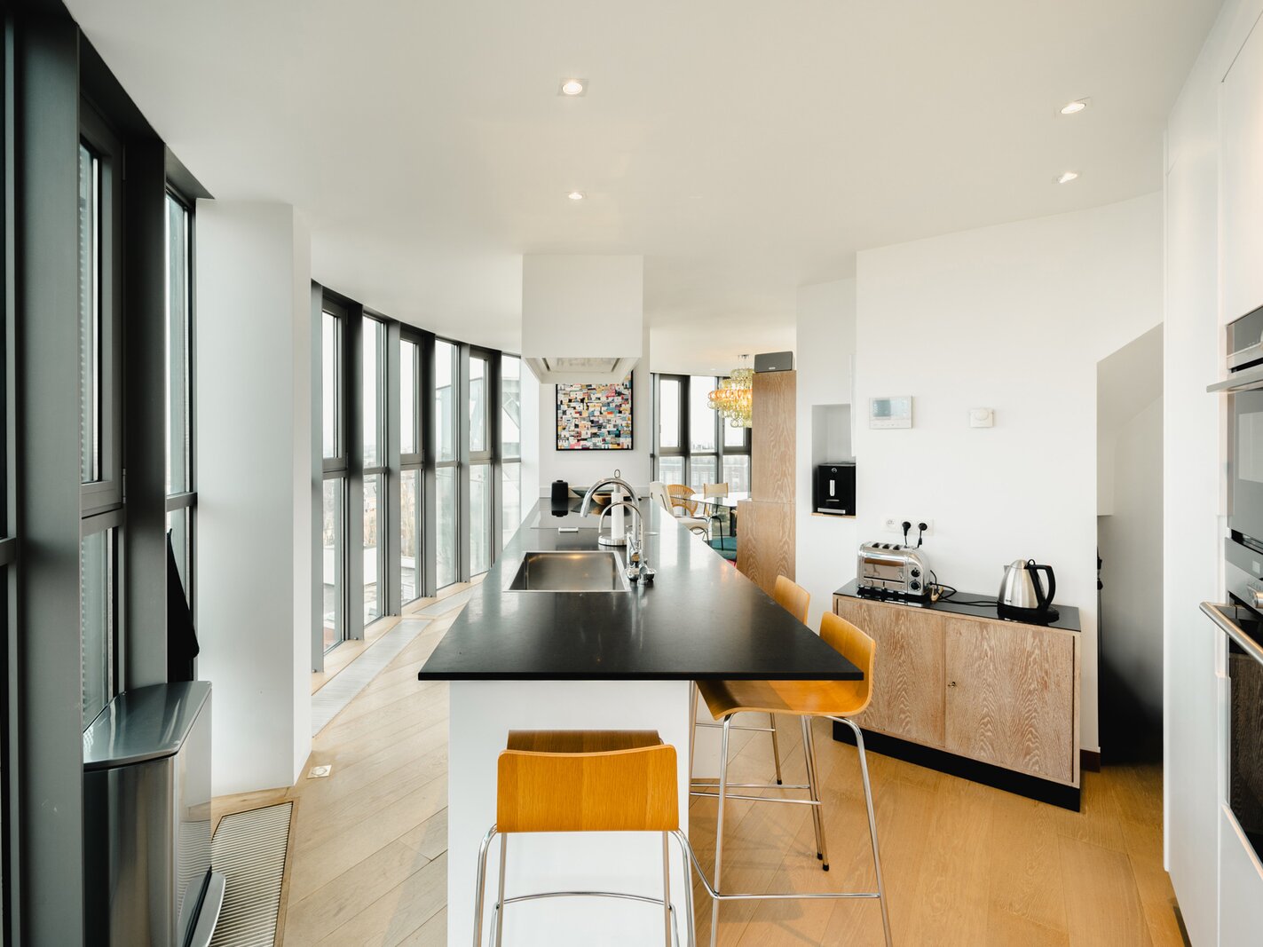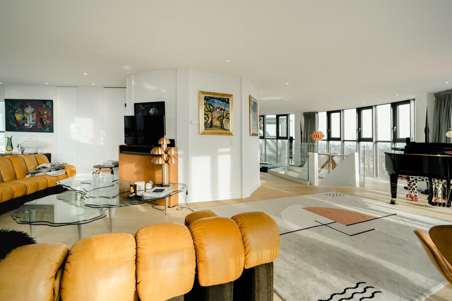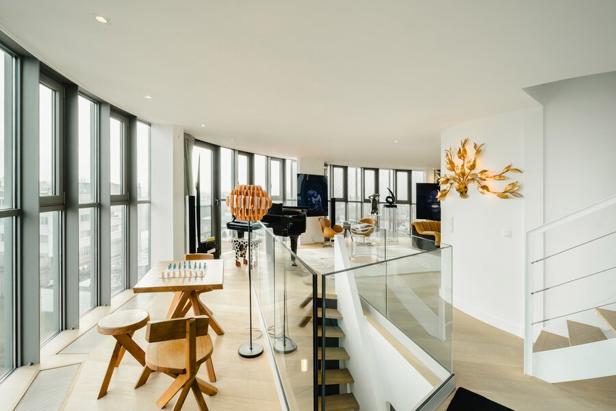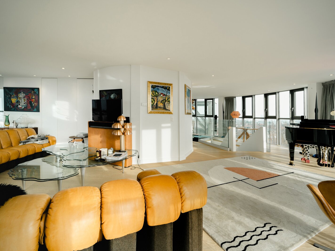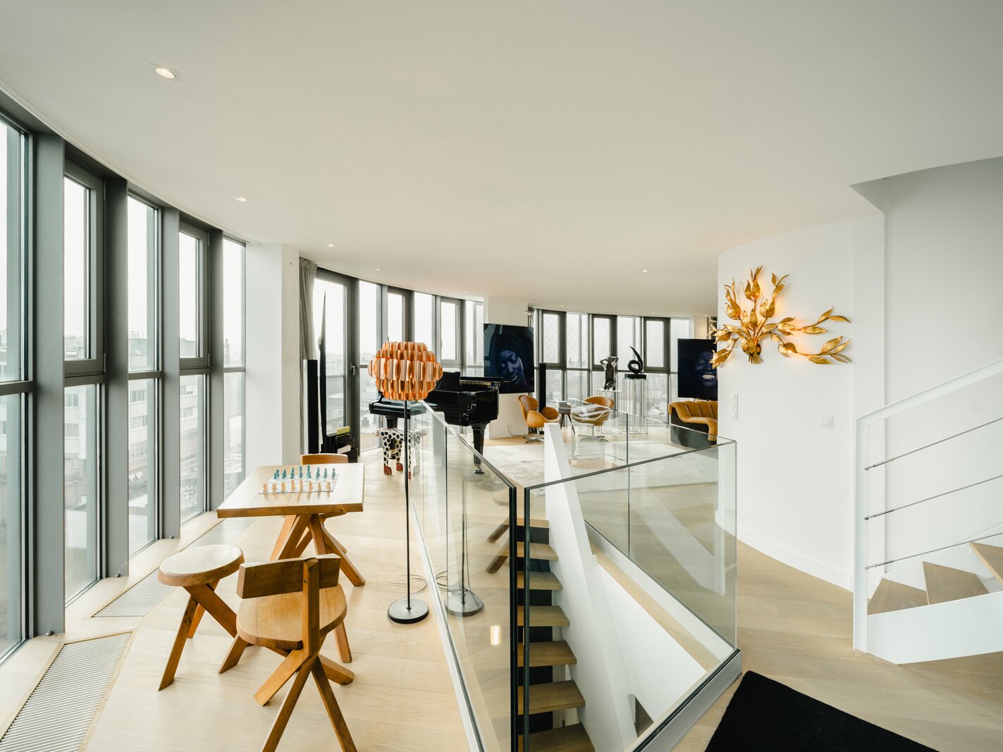 Dit resoluut industriële penthouse is via een loopbrug verbonden met een glazen buitenlift die ook de ondergrondse parkings bedient. Het is gebouwd rond een centrale kern en heeft op het eerste niveau een inkomhal met vestiaire die aan de ene kant leidt naar een gastenslaapkamer met aangrenzende doucheruimte, en aan de andere kant is een interne trap die leidt naar een open woonruimte met een open haard (cassette), een volledig uitgeruste keuken en een eetkamer waarvan het meubilair de rondingen en delen van de ruimte volgt. Het slaapgedeelte bestaat uit een studeer-/zitkamer, de ouderslaapkamer met gasinzet, kleedkamer en aangrenzende badkamer, en een tweede suite met kleedkamer en badkamer. Op het dakterras kun je genieten van het spektakel van de stad bij het ontwaken en het inslapen.