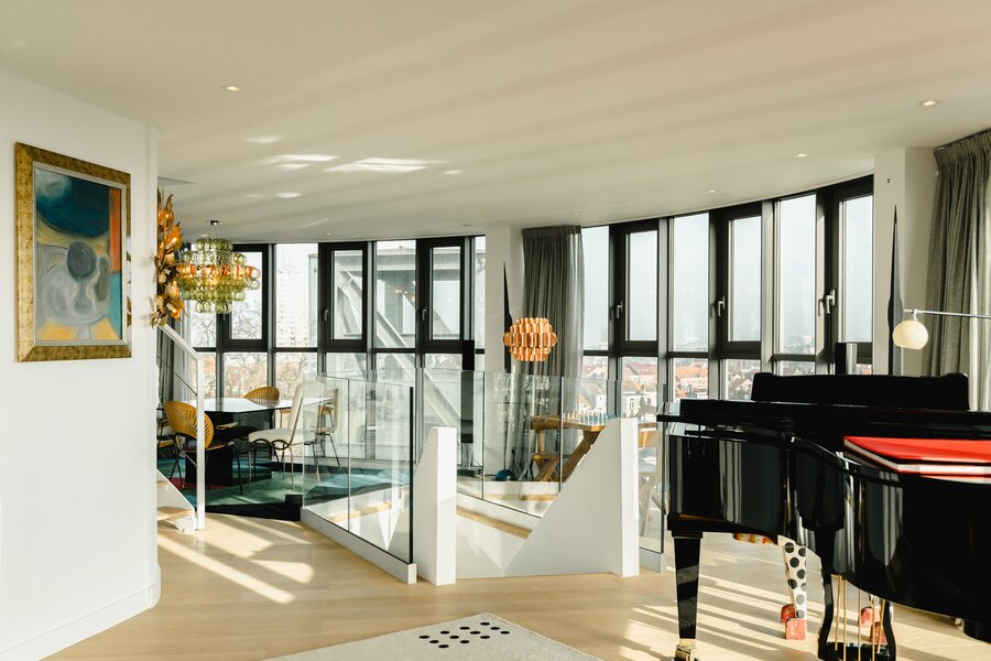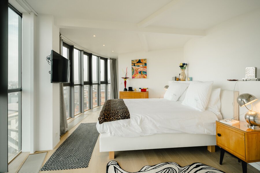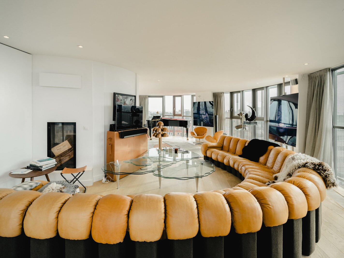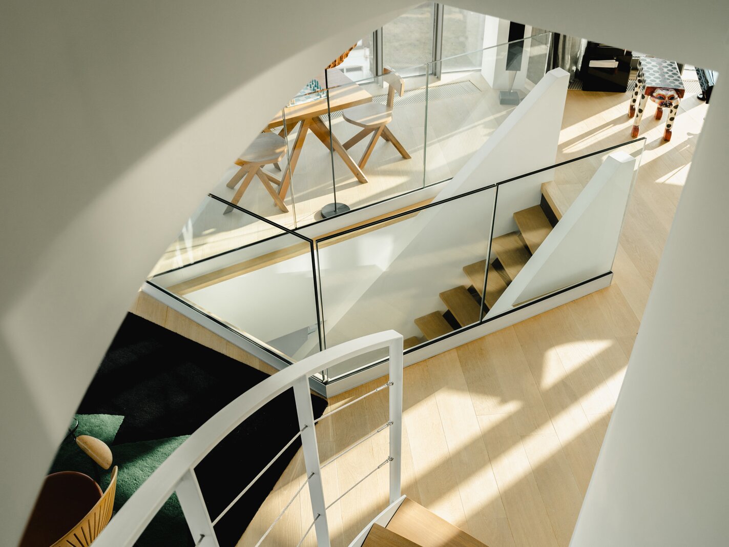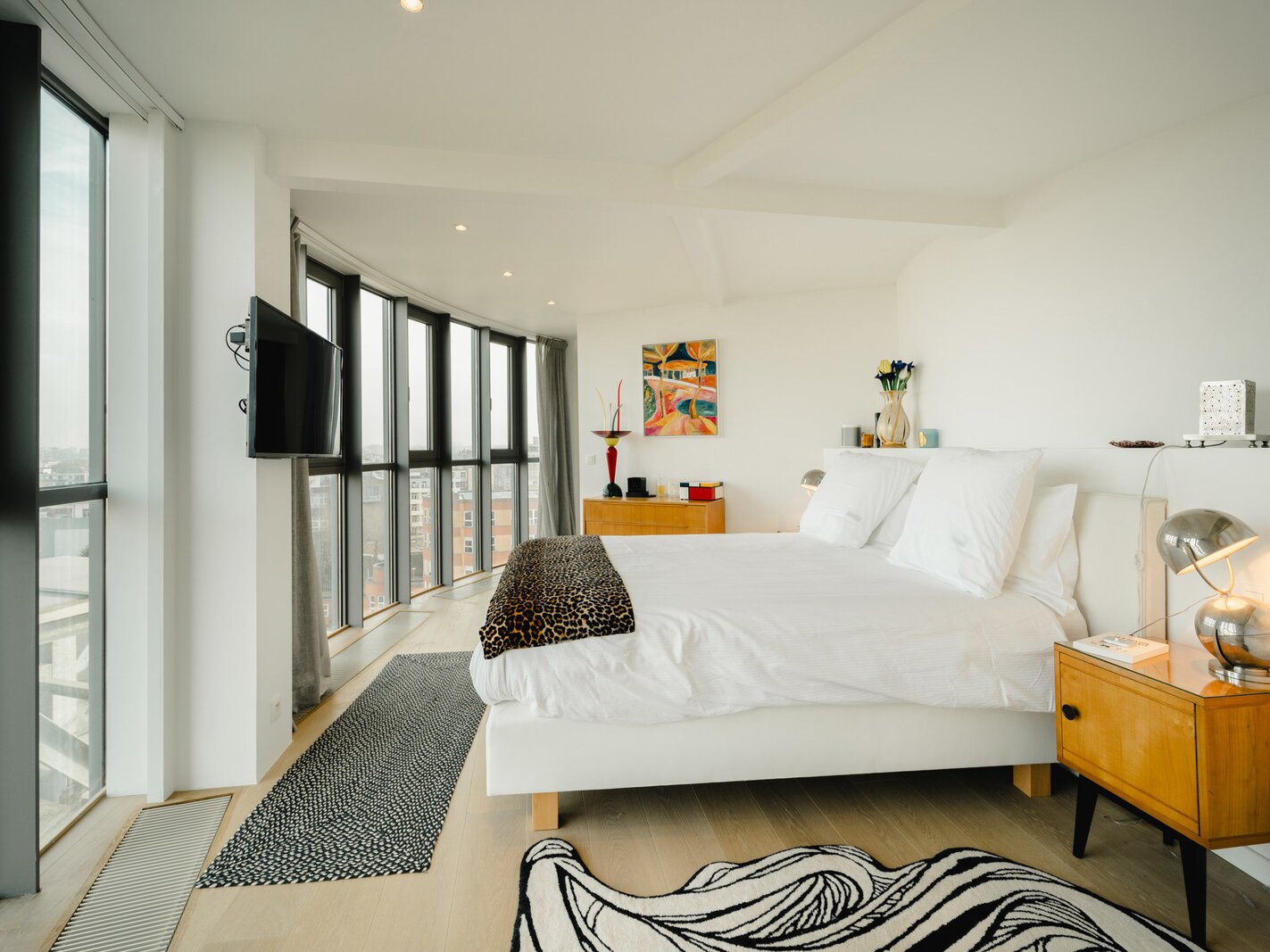 Dit resoluut industriële penthouse is via een loopbrug verbonden met een glazen buitenlift die ook de ondergrondse parkings bedient. Het is gebouwd rond een centrale kern en heeft op het eerste niveau een inkomhal met vestiaire die aan de ene kant leidt naar een gastenslaapkamer met aangrenzende doucheruimte, en aan de andere kant is een interne trap die leidt naar een open woonruimte met een open haard (cassette), een volledig uitgeruste keuken en een eetkamer waarvan het meubilair de rondingen en delen van de ruimte volgt. Het slaapgedeelte bestaat uit een studeer-/zitkamer, de ouderslaapkamer met gasinzet, kleedkamer en aangrenzende badkamer, en een tweede suite met kleedkamer en badkamer. Op het dakterras kun je genieten van het spektakel van de stad bij het ontwaken en het inslapen.