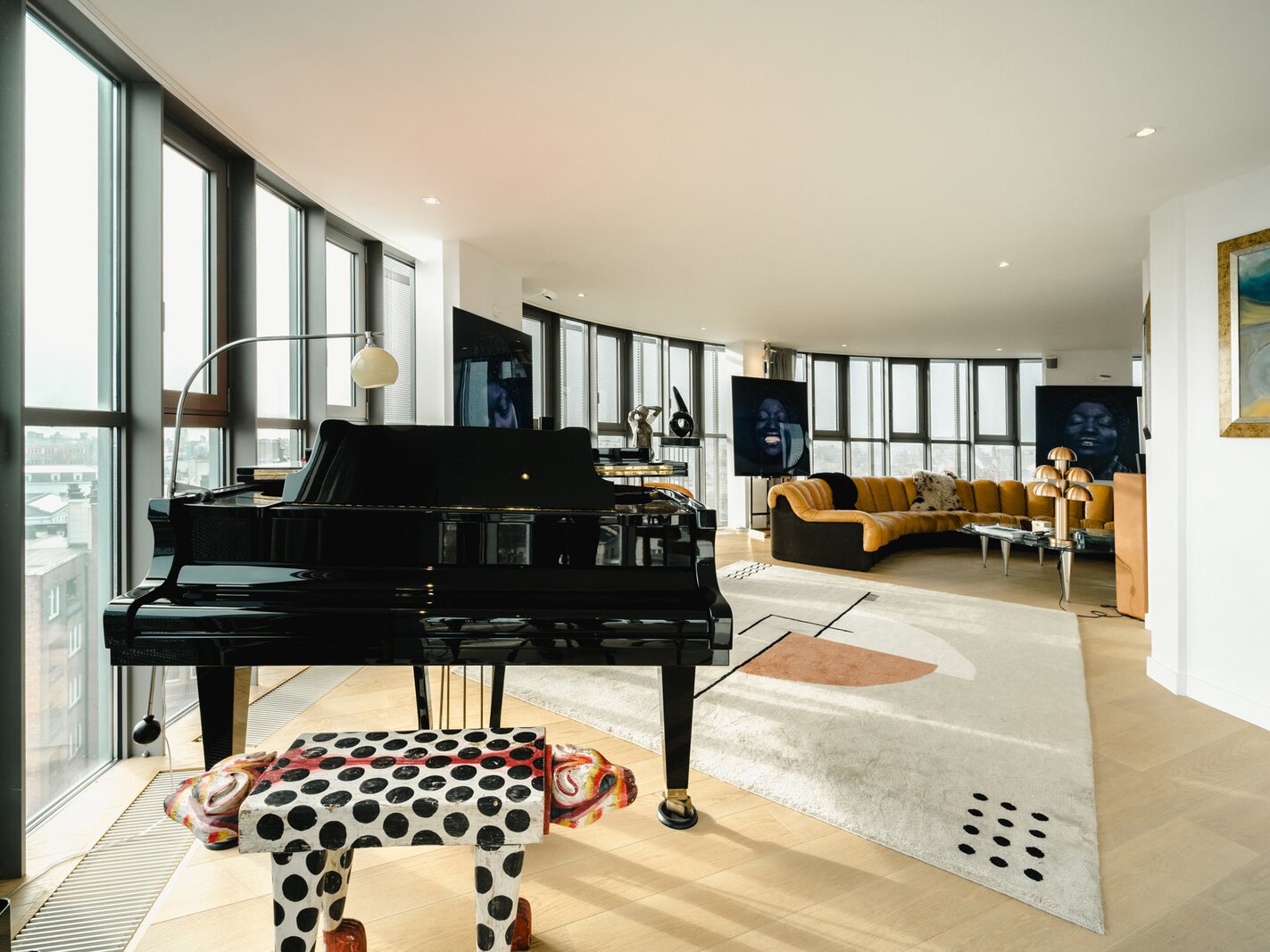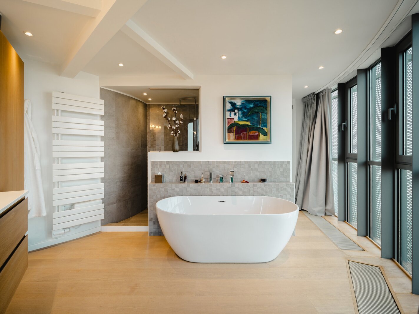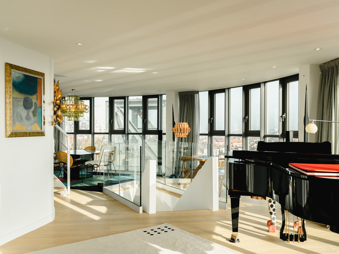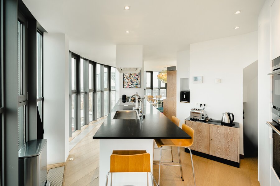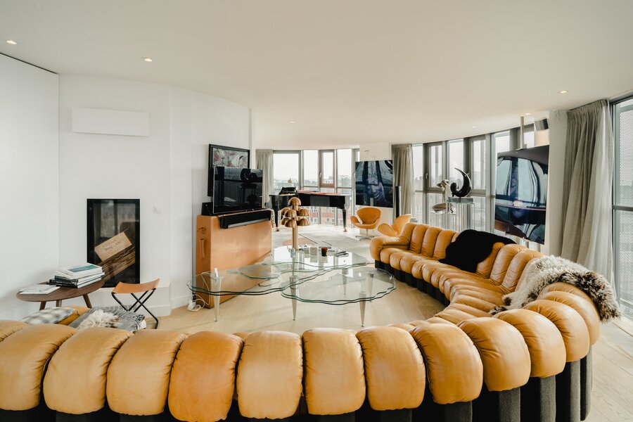 Dit resoluut industriële penthouse is via een loopbrug verbonden met een glazen buitenlift die ook de ondergrondse parkings bedient. Het is gebouwd rond een centrale kern en heeft op het eerste niveau een inkomhal met vestiaire die aan de ene kant leidt naar een gastenslaapkamer met aangrenzende doucheruimte, en aan de andere kant is een interne trap die leidt naar een open woonruimte met een open haard (cassette), een volledig uitgeruste keuken en een eetkamer waarvan het meubilair de rondingen en delen van de ruimte volgt. Het slaapgedeelte bestaat uit een studeer-/zitkamer, de ouderslaapkamer met gasinzet, kleedkamer en aangrenzende badkamer, en een tweede suite met kleedkamer en badkamer. Op het dakterras kun je genieten van het spektakel van de stad bij het ontwaken en het inslapen.