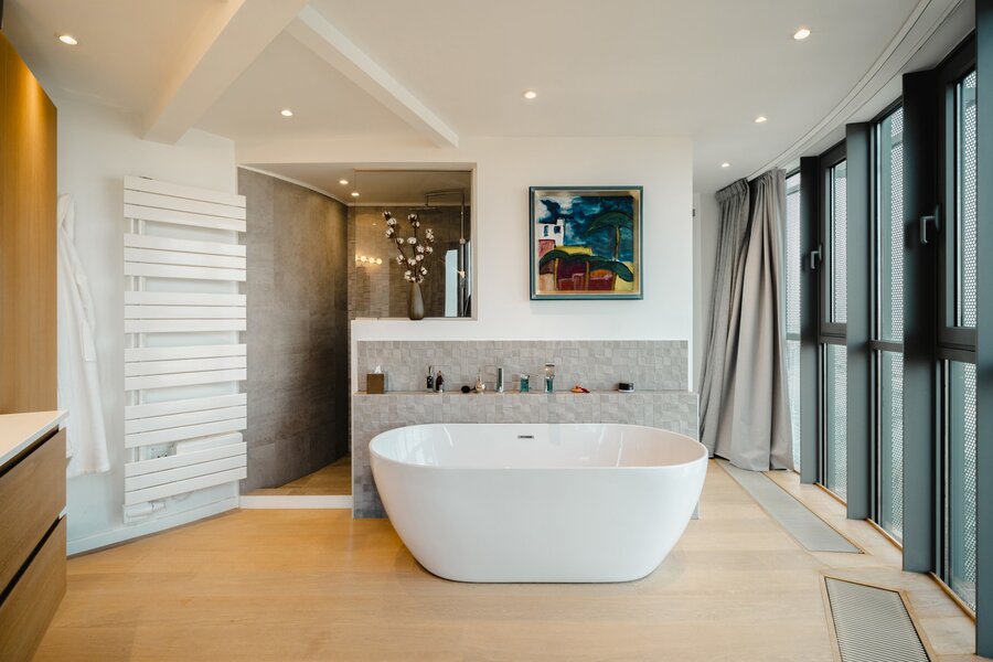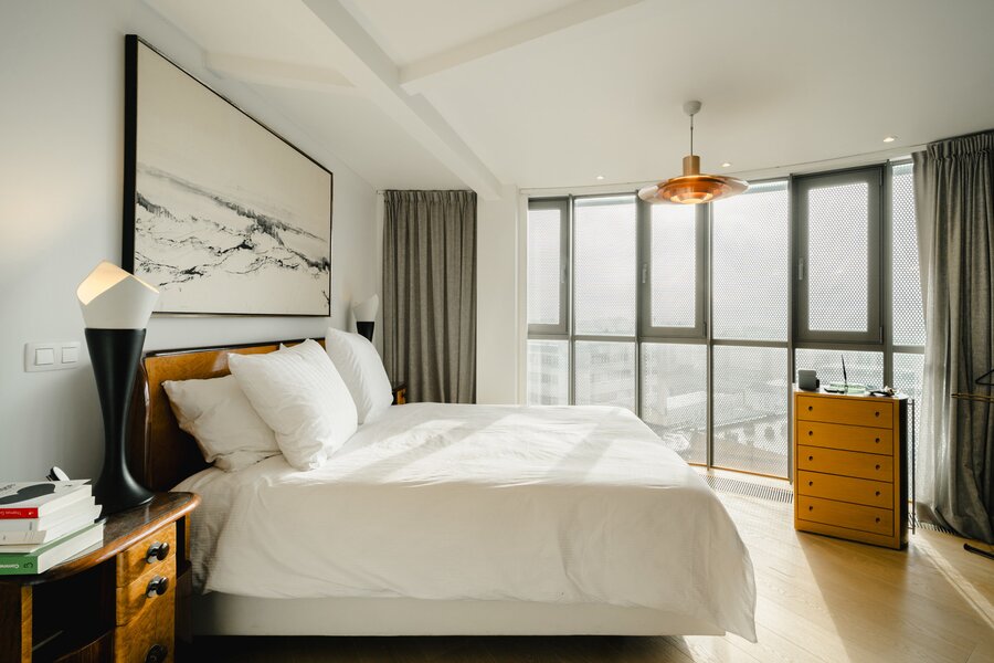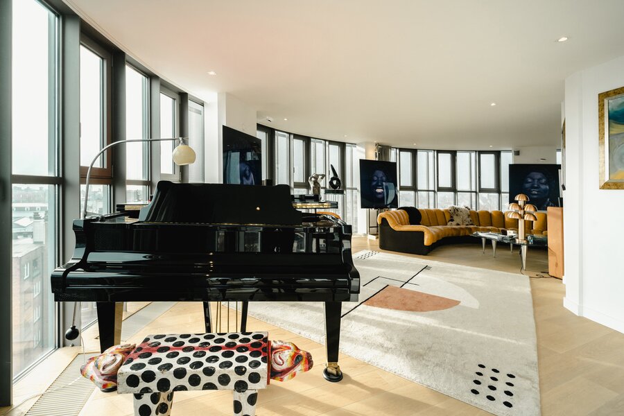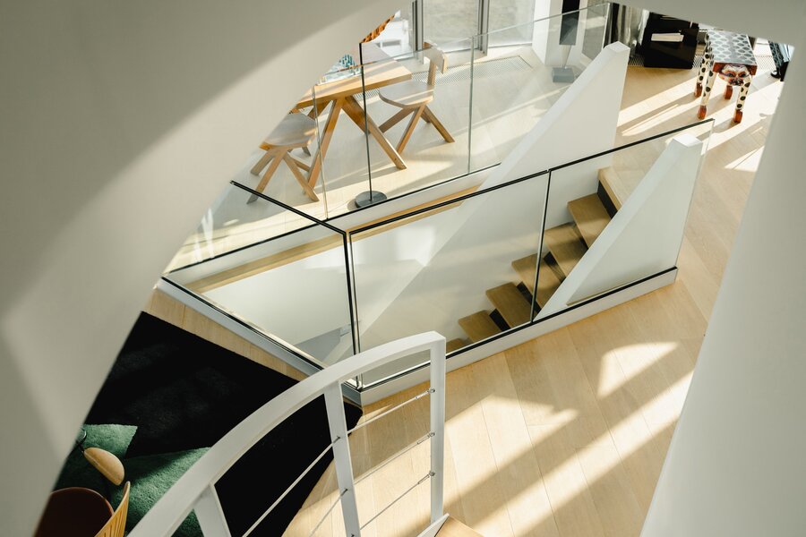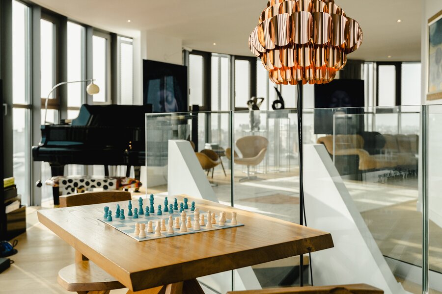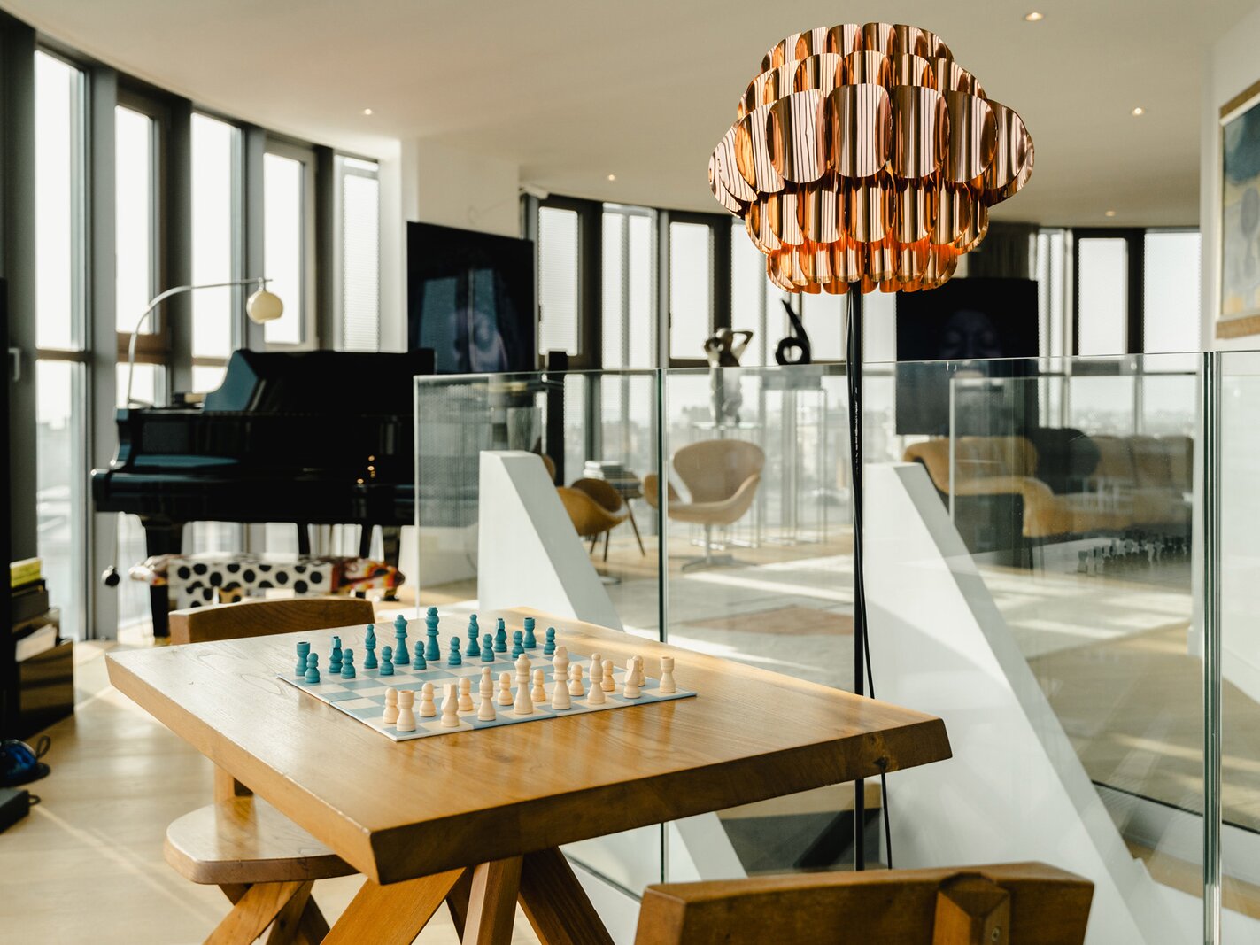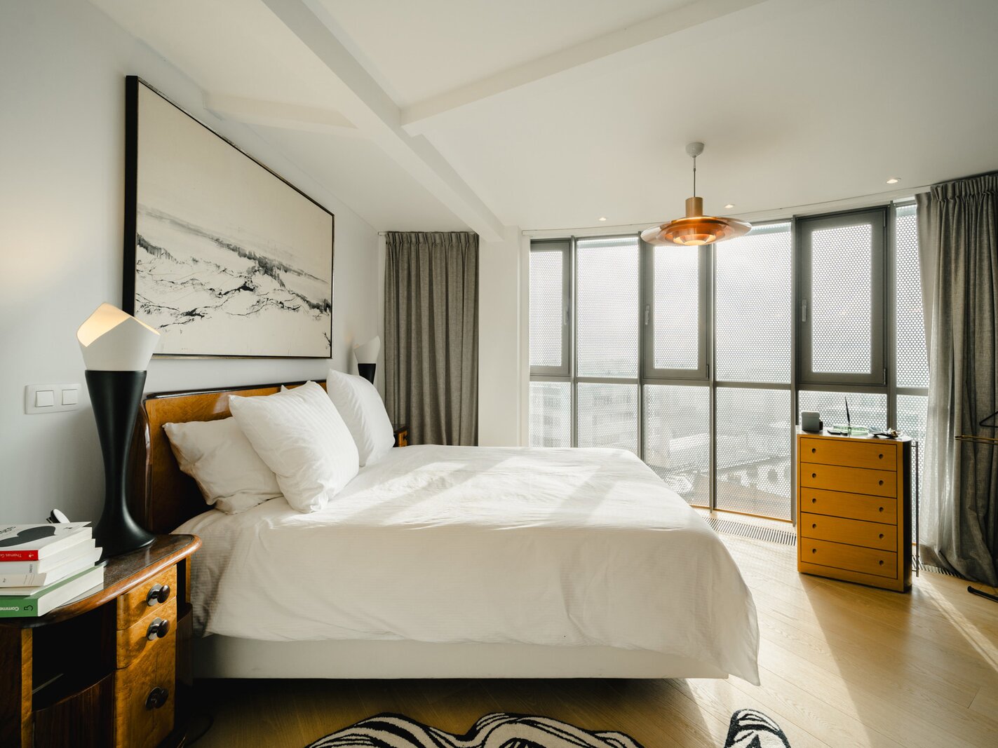 Dit resoluut industriële penthouse is via een loopbrug verbonden met een glazen buitenlift die ook de ondergrondse parkings bedient. Het is gebouwd rond een centrale kern en heeft op het eerste niveau een inkomhal met vestiaire die aan de ene kant leidt naar een gastenslaapkamer met aangrenzende doucheruimte, en aan de andere kant is een interne trap die leidt naar een open woonruimte met een open haard (cassette), een volledig uitgeruste keuken en een eetkamer waarvan het meubilair de rondingen en delen van de ruimte volgt. Het slaapgedeelte bestaat uit een studeer-/zitkamer, de ouderslaapkamer met gasinzet, kleedkamer en aangrenzende badkamer, en een tweede suite met kleedkamer en badkamer. Op het dakterras kun je genieten van het spektakel van de stad bij het ontwaken en het inslapen.