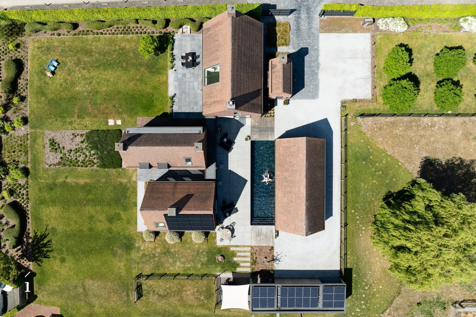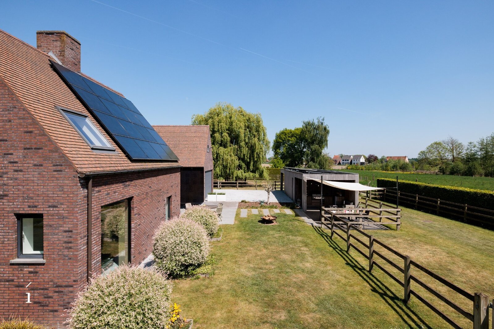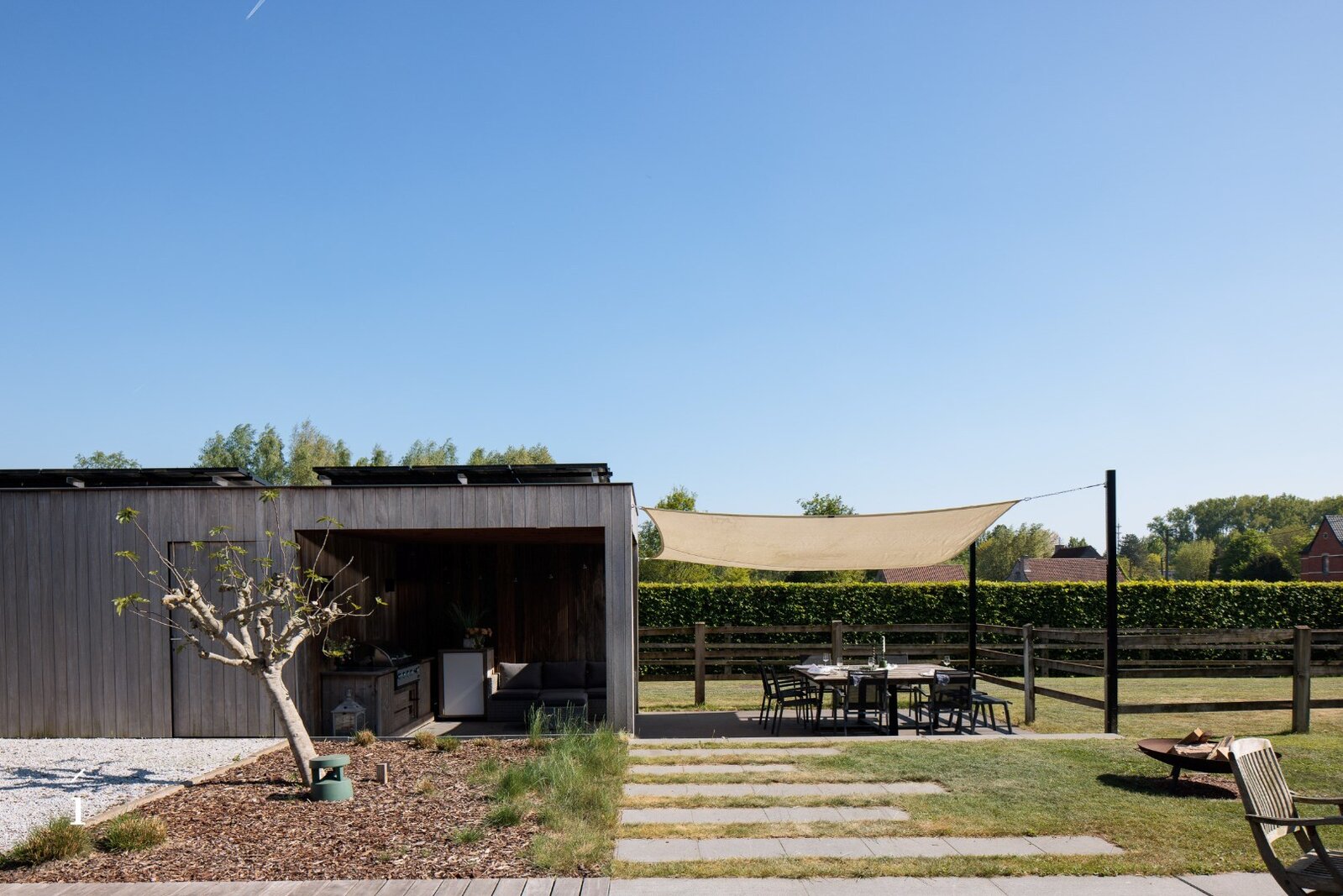 Rond deze moderne vierkantshoeve ligt een fraai aangelegde tuin die uitnodigt tot rust en verfijnd buitenleven. Geen overdaad, maar een ingetogen luxe die spreekt via natuurlijke materialen, doordachte zichtlijnen en gezellige hoekjes waar binnen en buiten harmonieus samenvloeien.