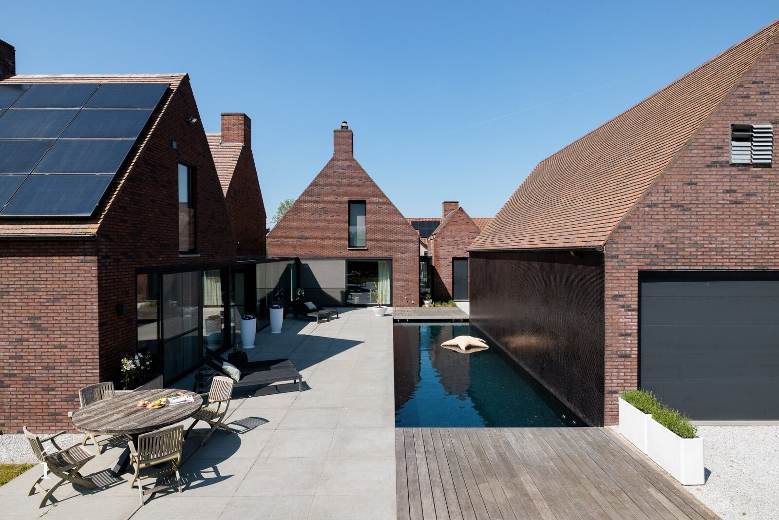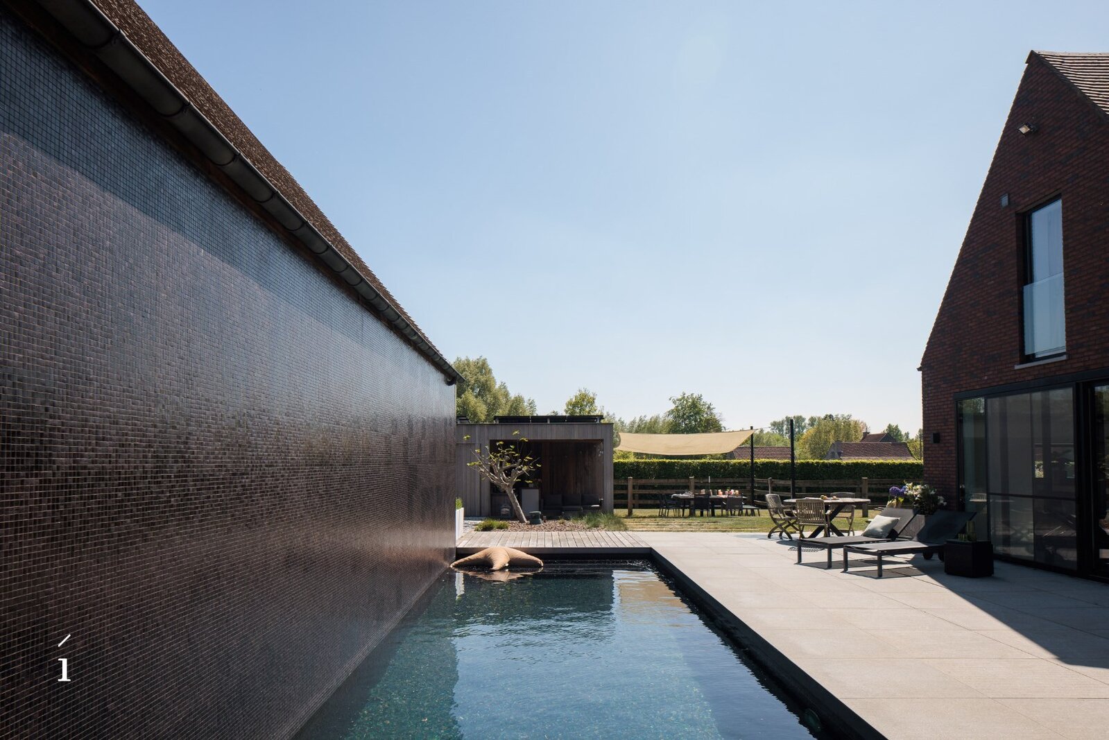 Centraal bevindt zich een stijlvol zwembad in mozaïek, omringd door zonneterrassen en loungeplekken. Het donkere water weerspiegelt de klasse van de architectuur en maakt van het binnenplein een serene plek van ontspanning en privacy.