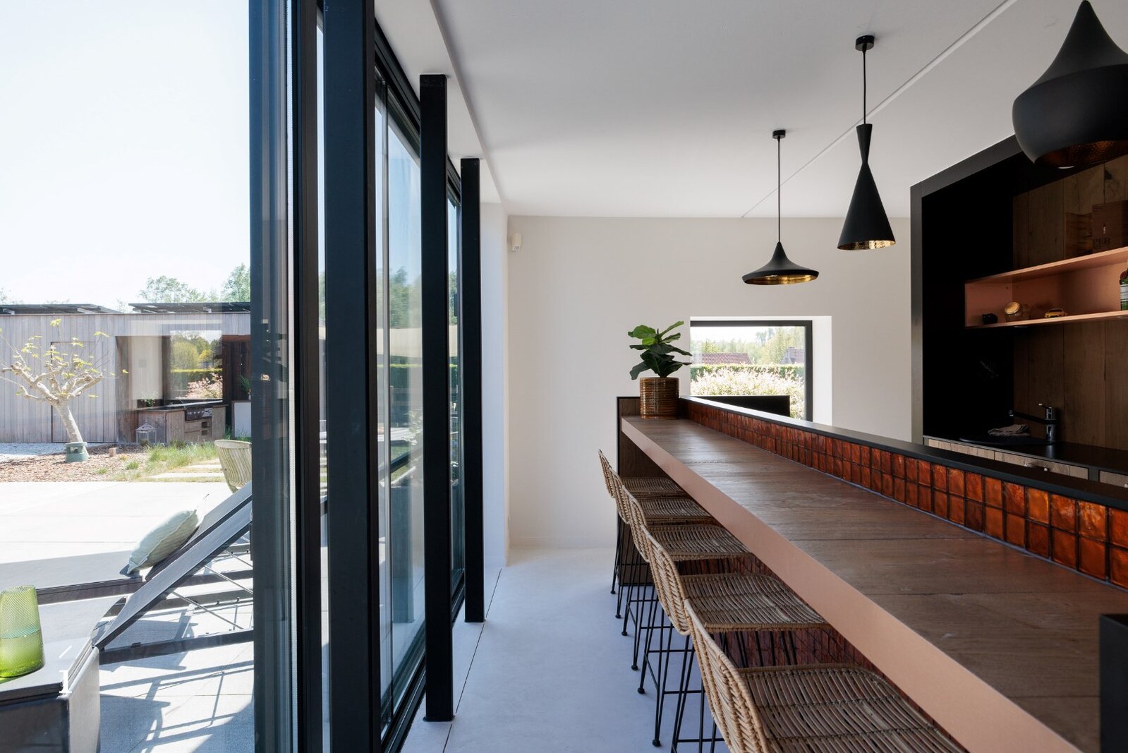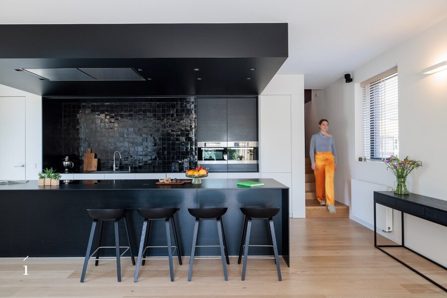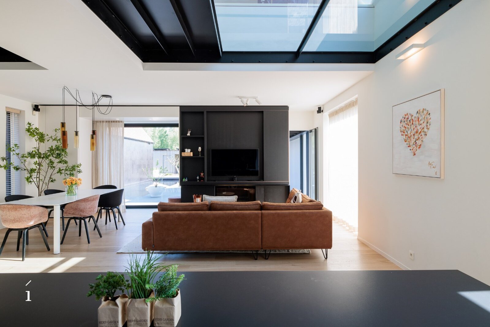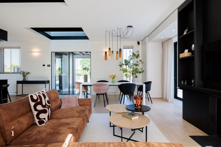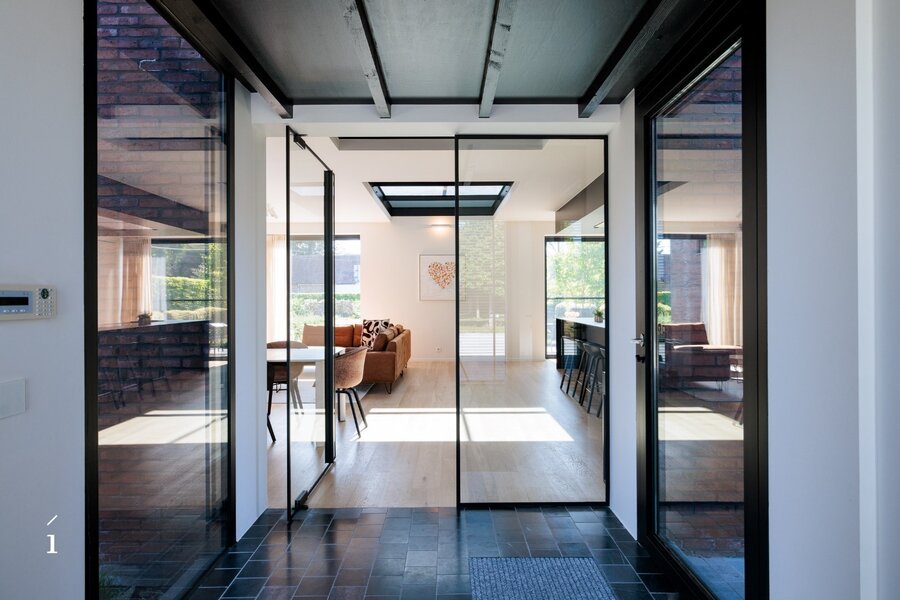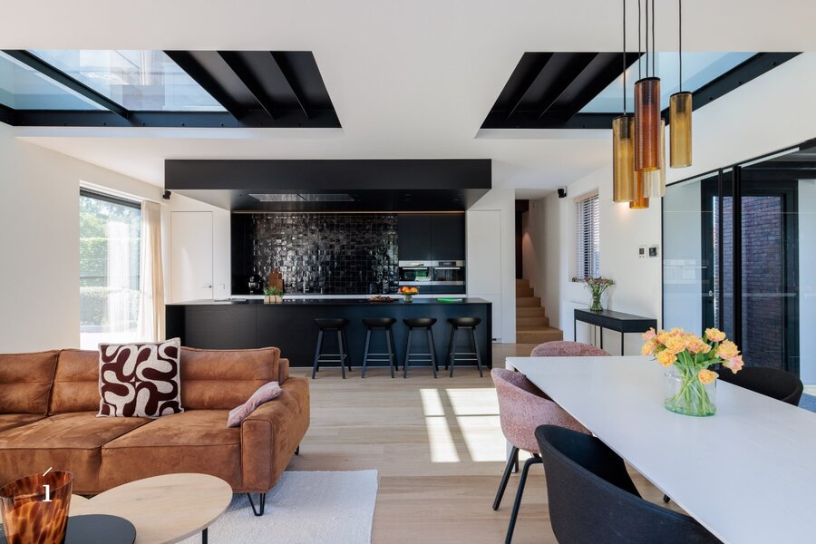Het hoofdgebouw omvat een open leefconcept waarin living, eetplaats en keuken moeiteloos in elkaar overvloeien. De hoge plafonds en grote glaspartijen zorgen voor een aangenaam ruimtegevoel en veel natuurlijk licht. De glazen vloer bovenin laat het daglicht nog dieper binnenvallen.