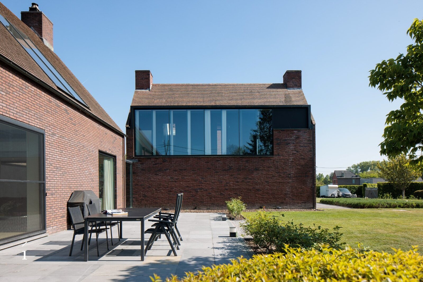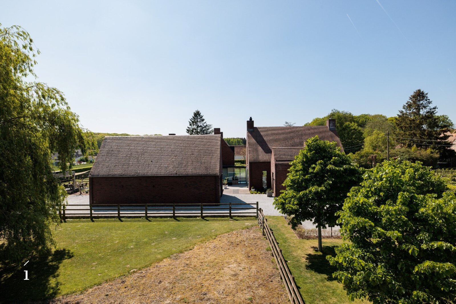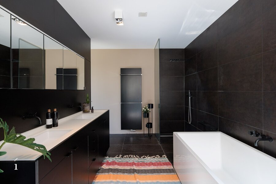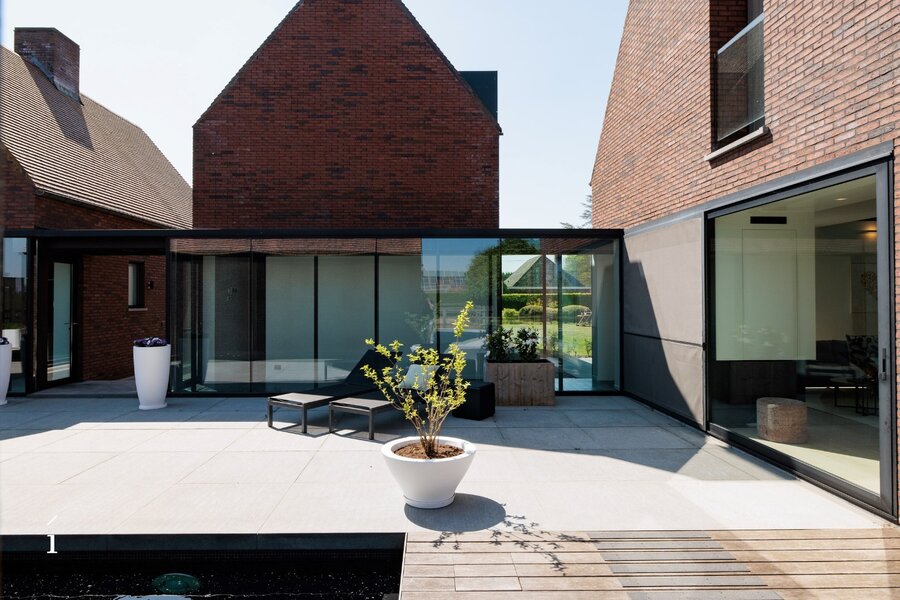 Via een glazen verbindingshal betreden we de tweede vleugel van het hoofdgebouw. Ook hier zorgen de grote raampartijen voor een mooi doorzicht naar de tuin en een sterk gevoel van openheid. Op het gelijkvloers bevindt zich de masterbedroom, die uitkijkt over het groen en aansluit op een dressing en een elegante badkamer met inloopdouche, ligbad en dubbele wastafel.