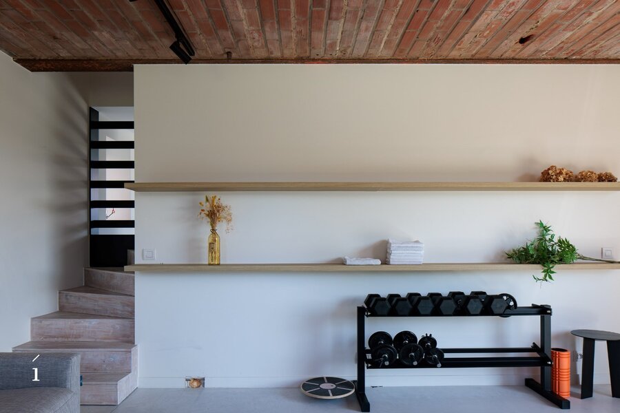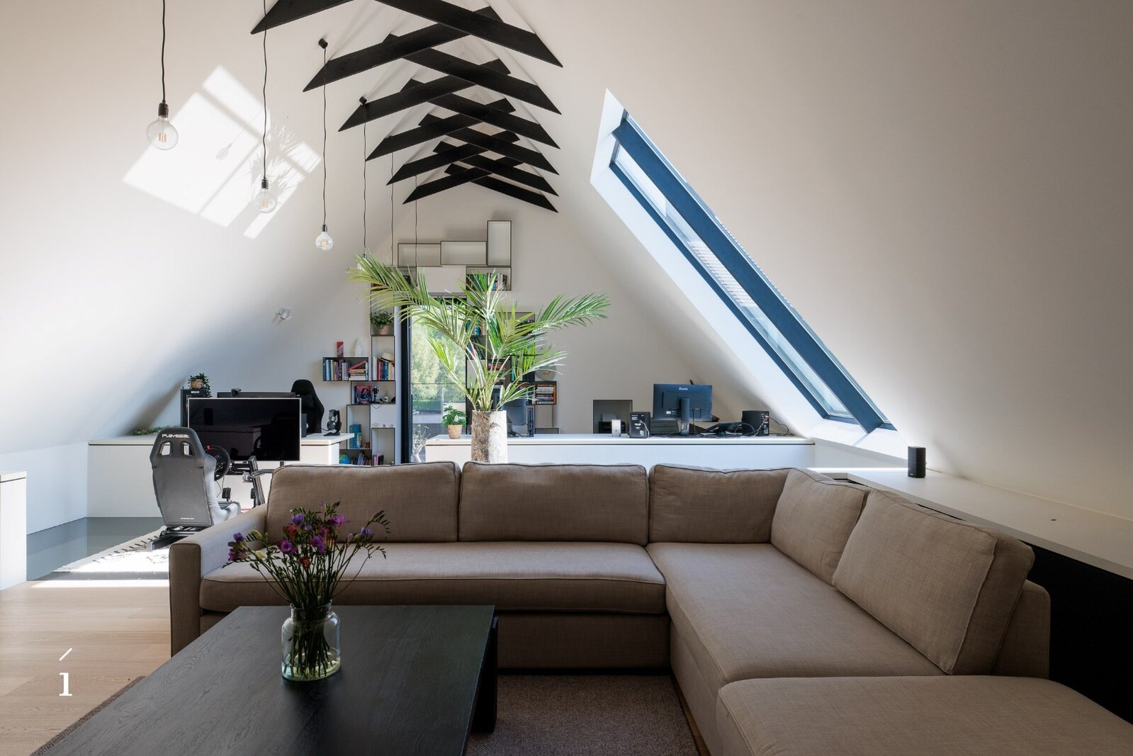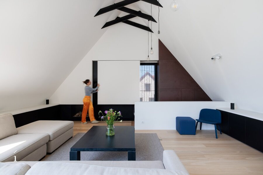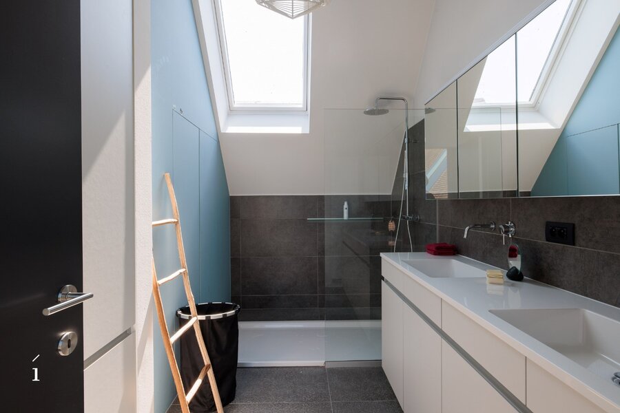 De verdieping onder het dak is opengewerkt tot in de nok en biedt een ruime, lichtrijke polyvalente ruimte. Momenteel is deze ingericht als dubbele bureauruimte met een salon, maar ze leent zich perfect voor uiteenlopende invullingen.