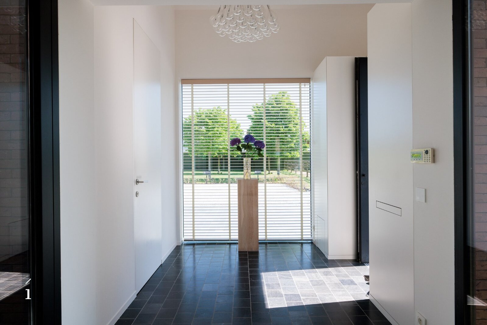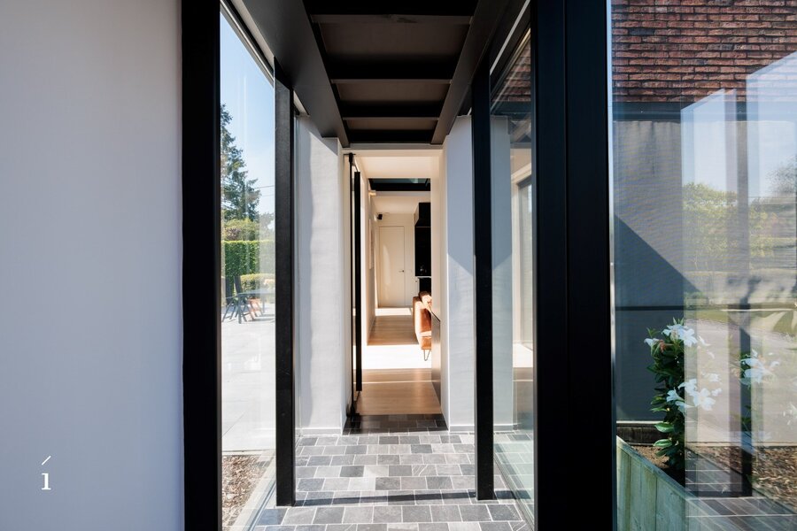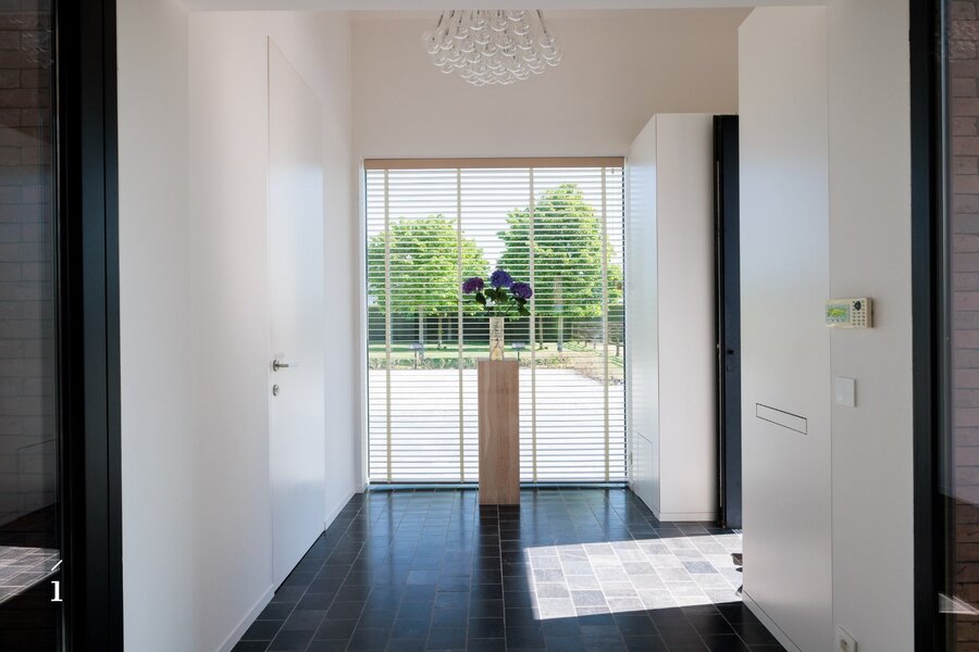Aansluitend aan de keuken bevindt zich een praktische bijkeuken met wasplaats, uitgerust met de nodige technieken. De inkomhal, afgewerkt met dubbele glazen deuren en wanden, voelt open en verwelkomend aan. Hier vinden we ook een apart gastentoilet en ingebouwde vestiairekasten die functionaliteit combineren met een strak lijnenspel.
