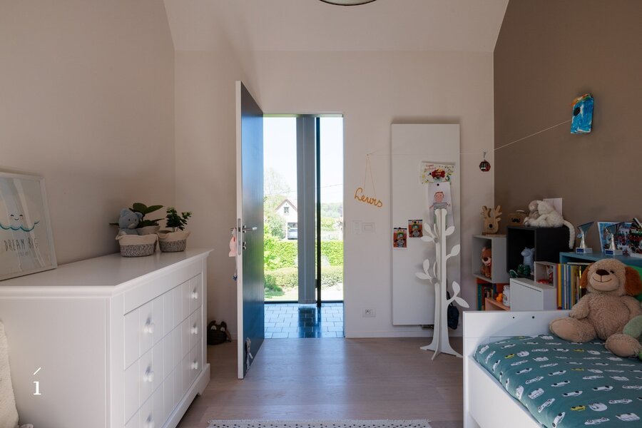 Op de verdieping vinden we een nachthal met een opvallende glazen wand die het zicht op de tuin maximaal benut. Hier zijn twee kinderkamers ondergebracht, samen met een centrale badkamer. Helemaal achteraan bevindt zich nog een apart toilet.