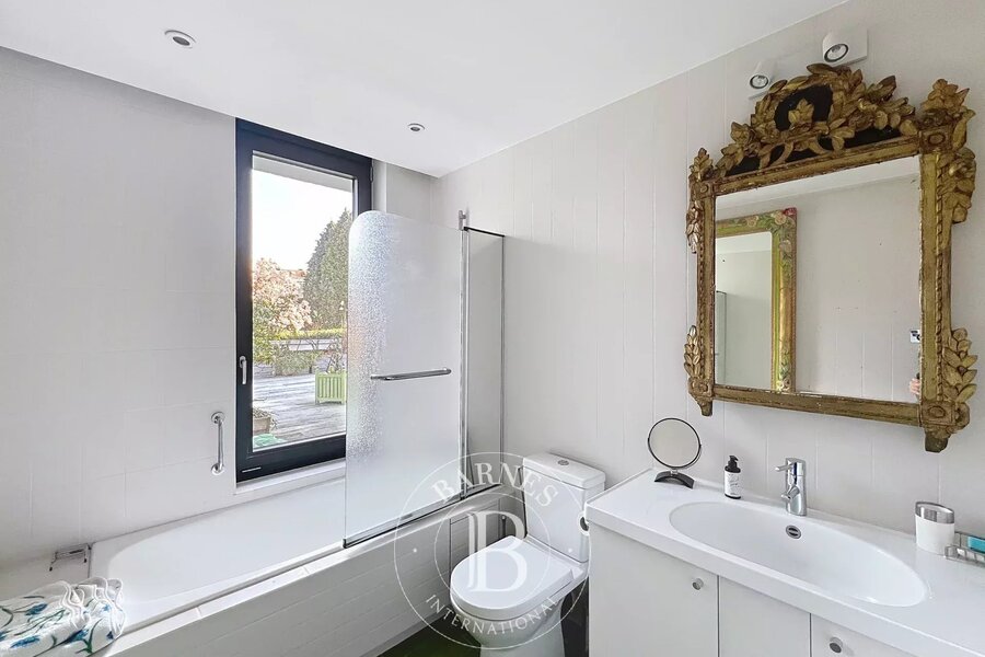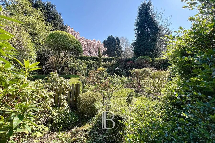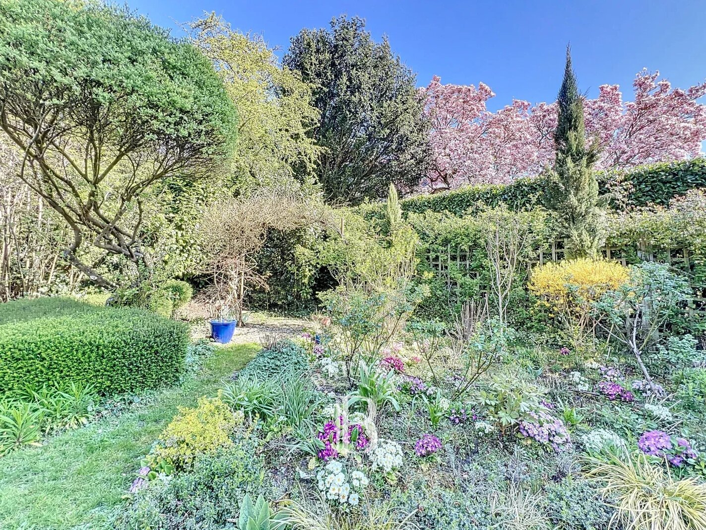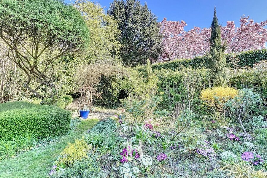 Op de begane grond een hal met een garderobe en een gastentoilet, grote, lichte ontvangstruimten met een open haard, die uitkomen op een mooi aangelegde tuin, een eetkamer, een aparte keuken, een grote slaapkamer met een kleedkamer en een eigen badkamer.
