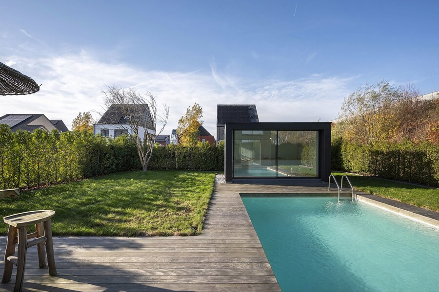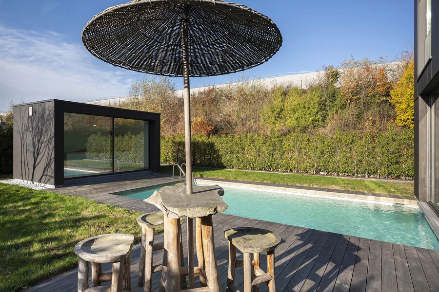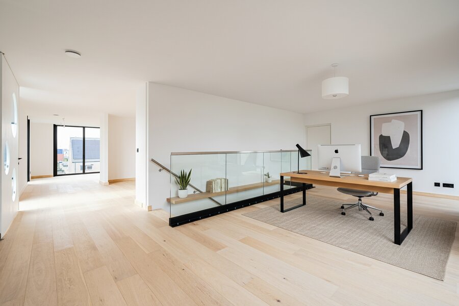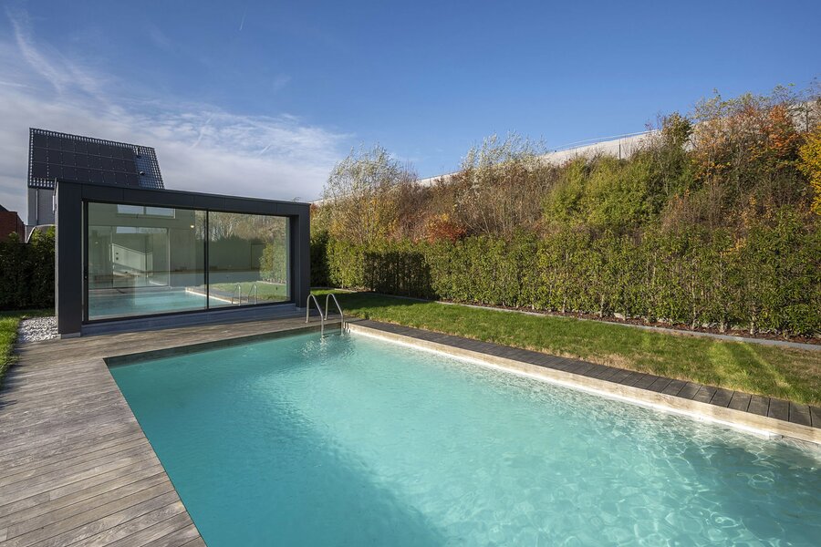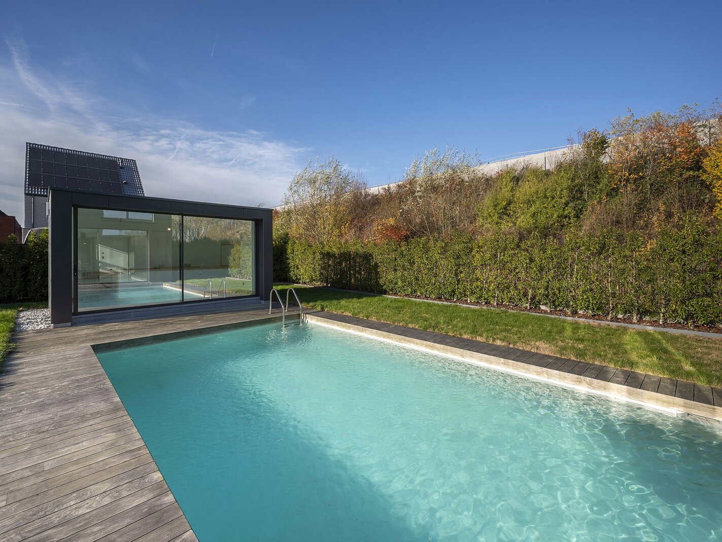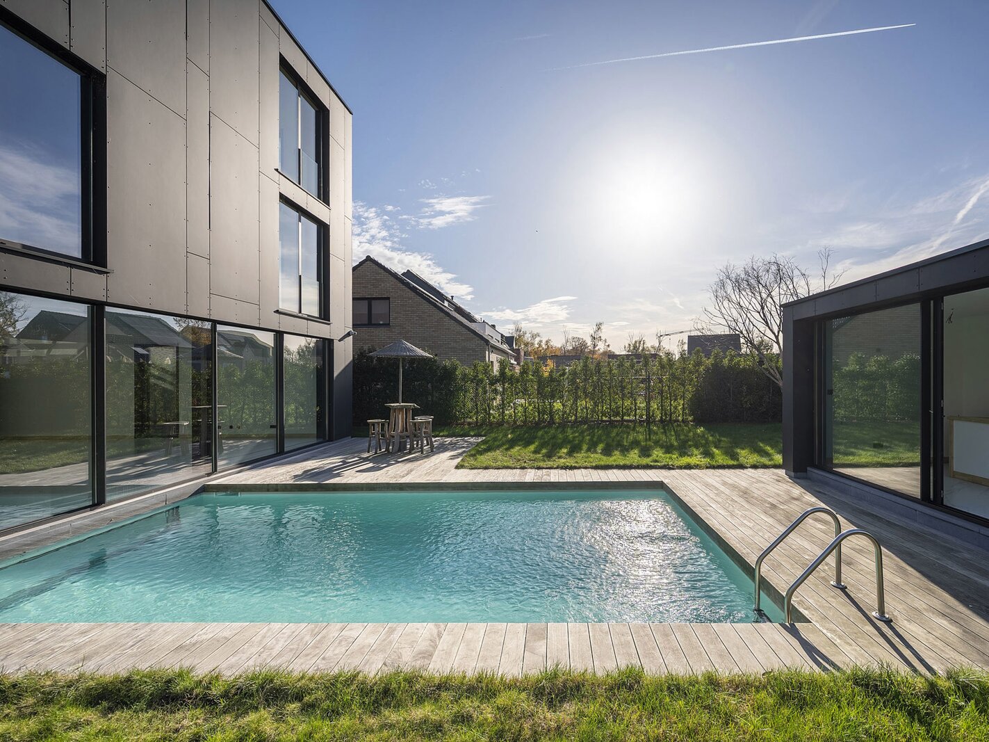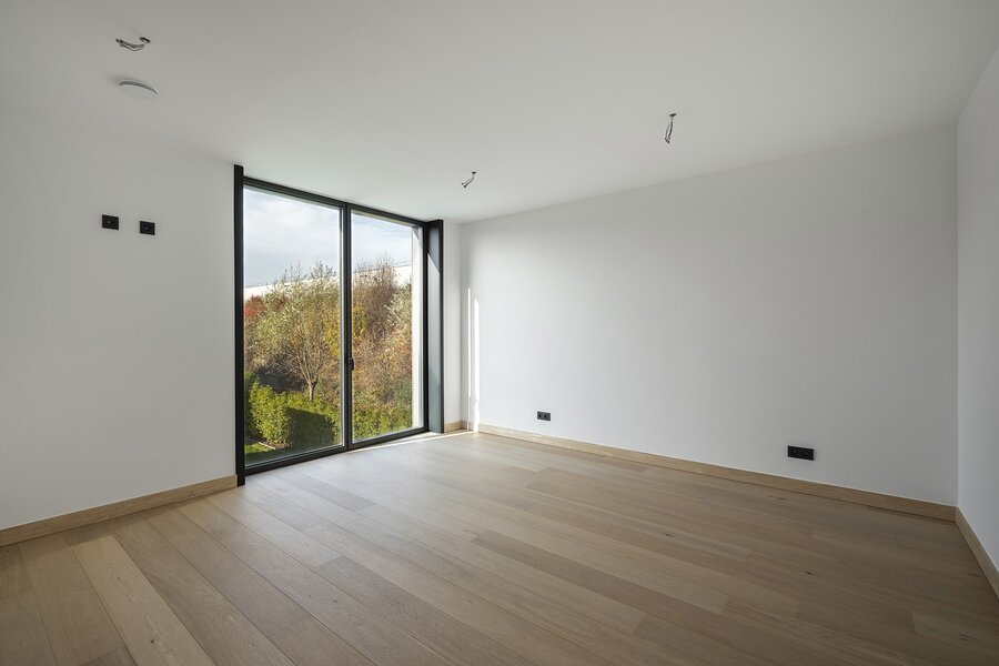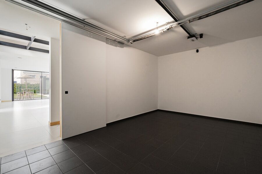 Bij binnenkomst leidt een ruime hal naar een woonkamer met een open salon en eetkamer. Grote raampartijen bieden een rustgevend uitzicht op de aangelegde tuin met zwembad en zorgen voor een vloeiende overgang tussen binnen en buiten. De keuken is nog volledig naar eigen wens aan te passen en in te richten. Op de eerste verdieping bevinden zich drie ruime slaapkamers en een badkamer. De master suite beslaat de volledige tweede verdieping en omvat een dressing, een badkamer met jacuzzi en een lounge- of werkkamer. Op de tuinverdieping is een wellnessruimte met sauna, die dankzij een raam met uitzicht op de bodem van het zwembad geniet van subtiel natuurlijk licht.