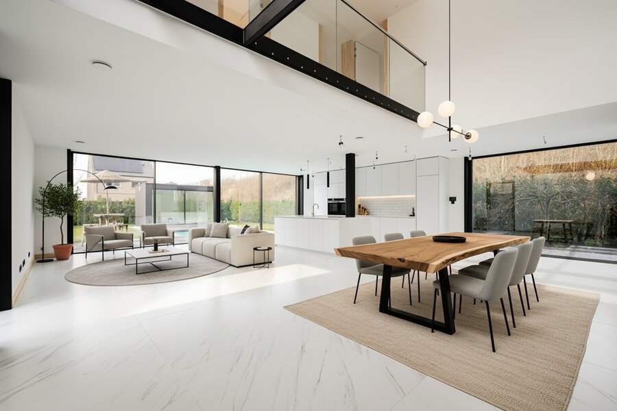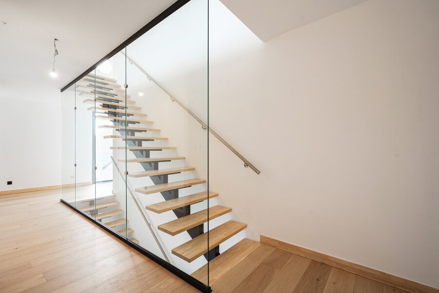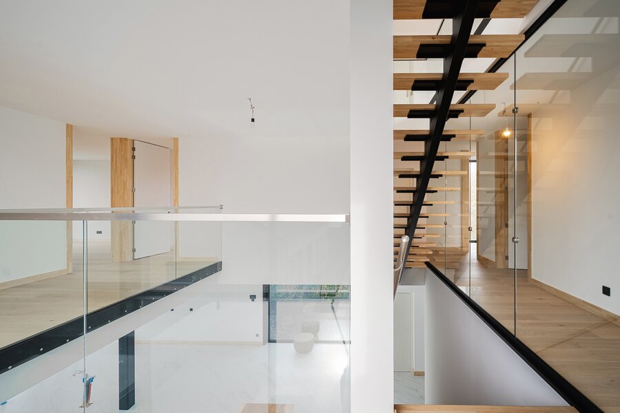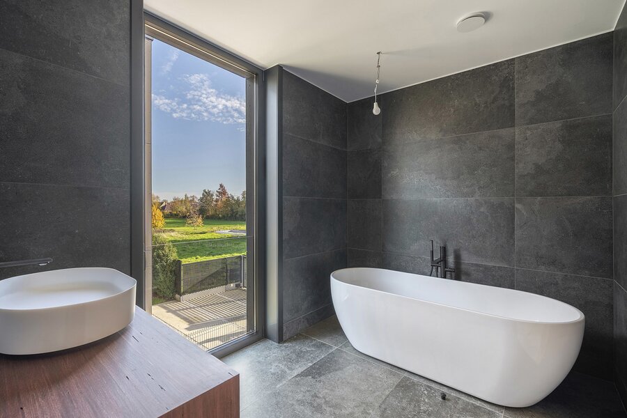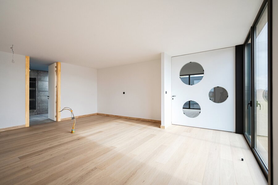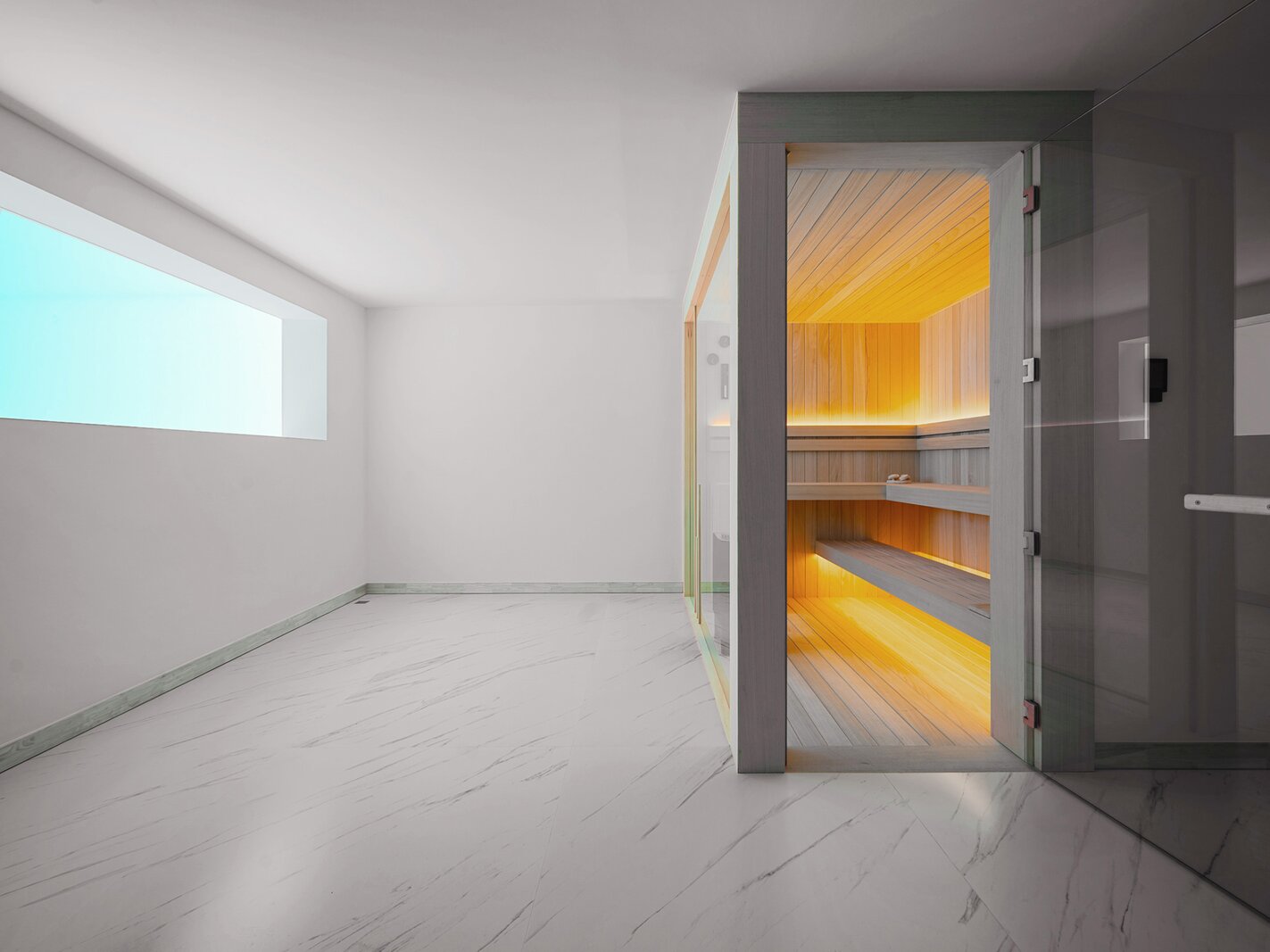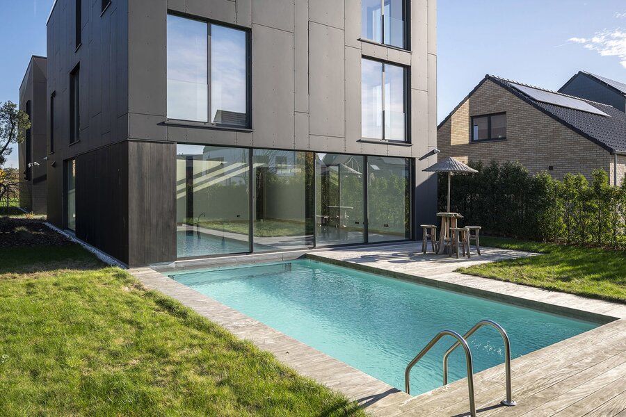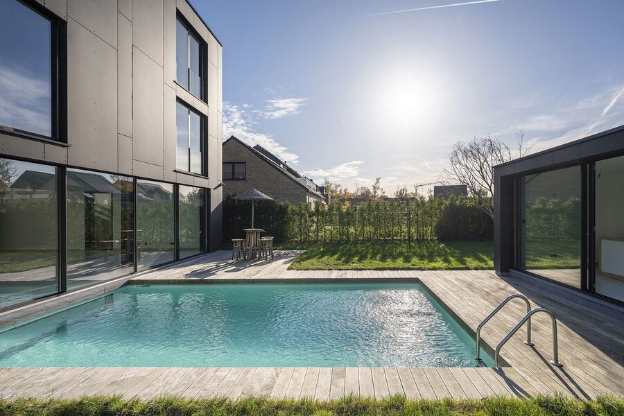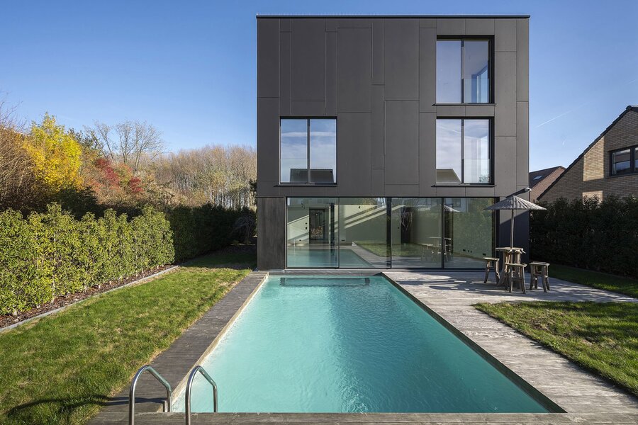 Bij binnenkomst leidt een ruime hal naar een woonkamer met een open salon en eetkamer. Grote raampartijen bieden een rustgevend uitzicht op de aangelegde tuin met zwembad en zorgen voor een vloeiende overgang tussen binnen en buiten. De keuken is nog volledig naar eigen wens aan te passen en in te richten. Op de eerste verdieping bevinden zich drie ruime slaapkamers en een badkamer. De master suite beslaat de volledige tweede verdieping en omvat een dressing, een badkamer met jacuzzi en een lounge- of werkkamer. Op de tuinverdieping is een wellnessruimte met sauna, die dankzij een raam met uitzicht op de bodem van het zwembad geniet van subtiel natuurlijk licht.