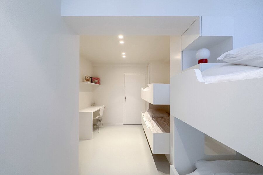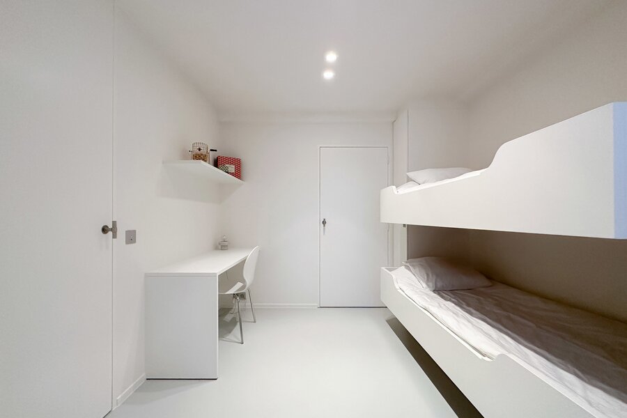 De indeling van het appartement omvat een inkomhal met vestiaire, een uiterst aangename en lichtrijke woonkamer, een eethoek met aansluitend een open keuken voorzien van een kookeiland. De zeer ruime hoofdslaapkamer is uitgerust met ingemaakte kasten, terwijl de open badkamer beschikt over een wastafelmeubel, een royale inloopdouche en toilet. De tweede slaapkamer (die over 2 stapelbedden beschikt), is voorzien van een bureauhoek en een eigen douchekamer met wastafel, douche en toilet. Een afzonderlijke berging herbergt de wasmachine en droogkast.