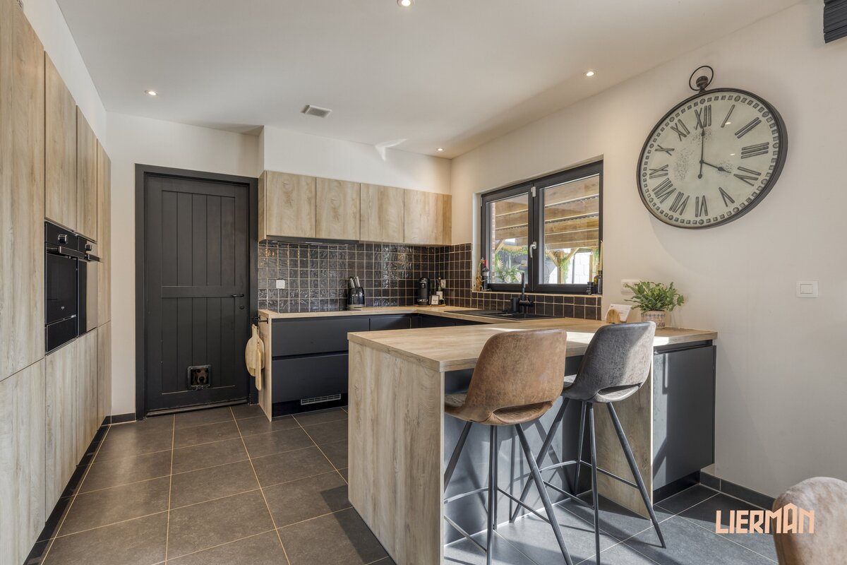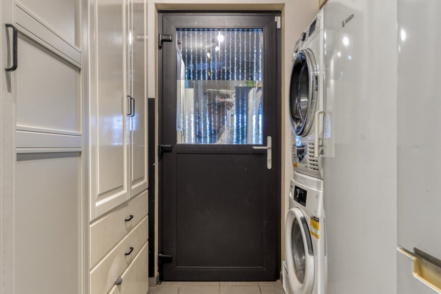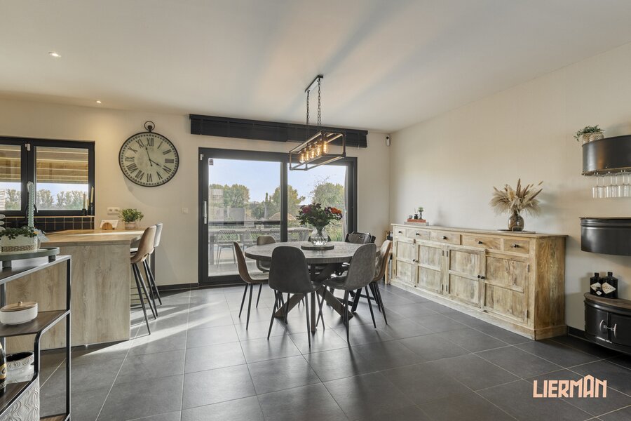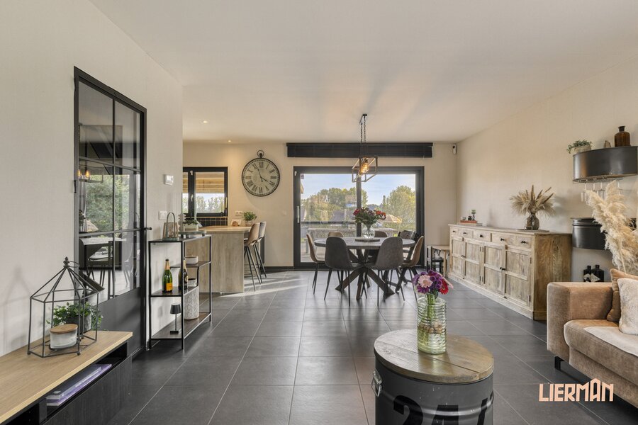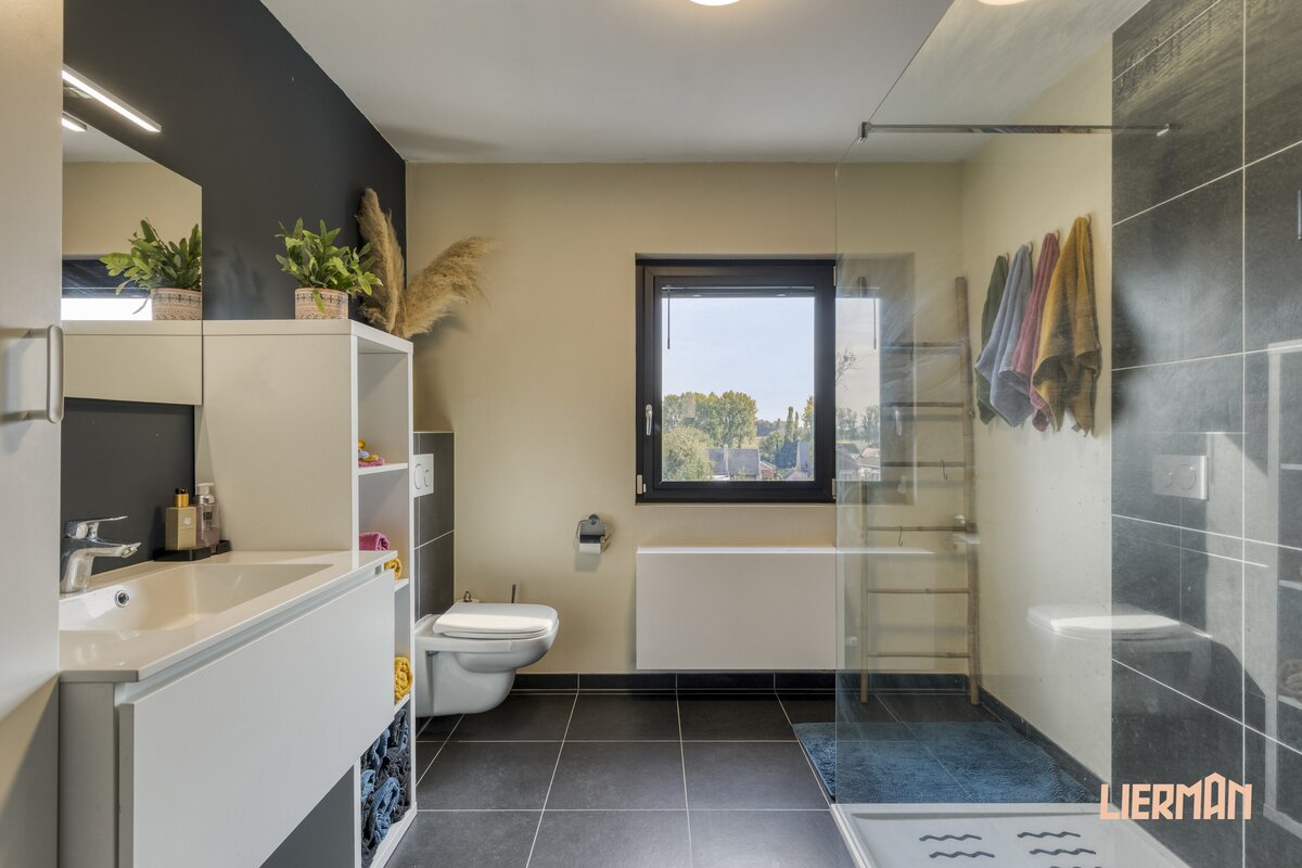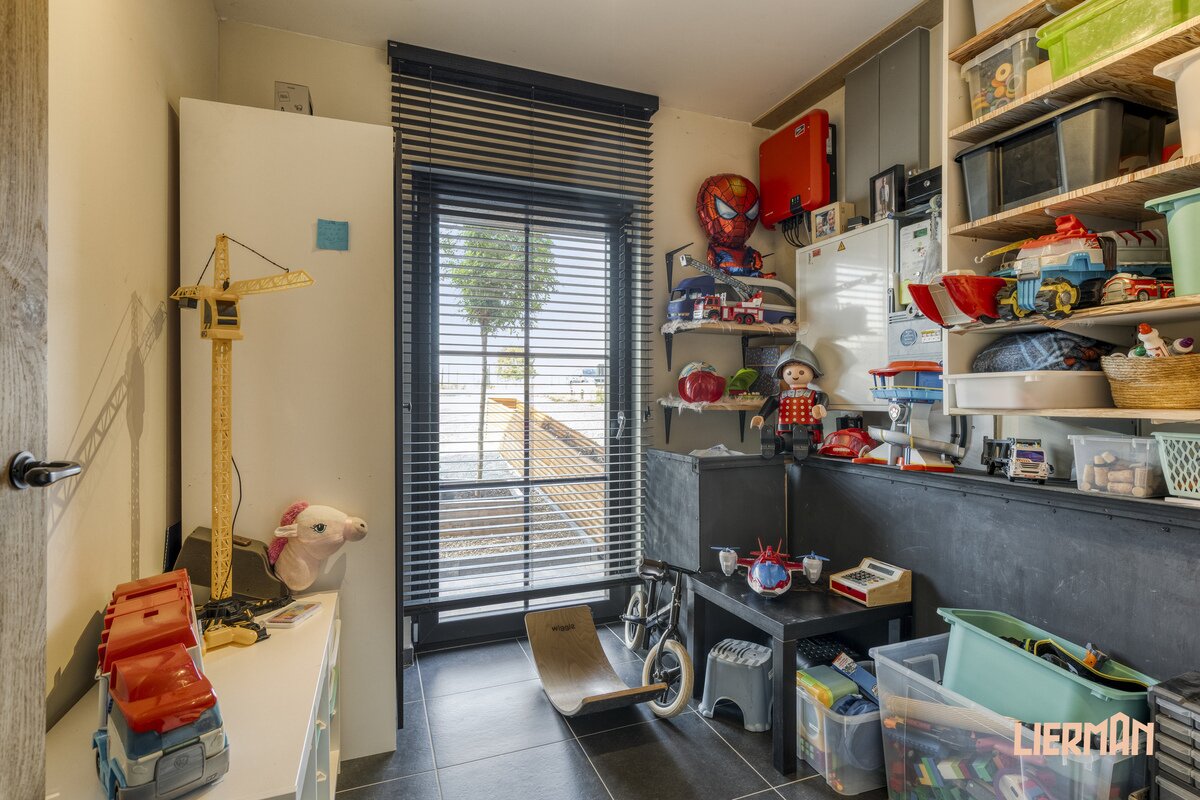 Binnenin wacht je een lichtrijke leefruimte met een volledig uitgeruste keuken met hoogwaardige toestellen en een aansluitende berging/wasplaats. Verder op het gelijkvloers: een inkom-/traphal, een apart toilet en een bureauruimte aan de voorzijde. Er is vloerverwarming aanwezig, aangedreven door een warmtepomp, in combinatie met 16 zonnepanelen.