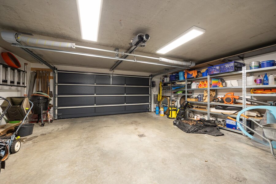 Kelderverdieping: grote kelder met garage en verwarmde helling naar garage, opslagruimte en extra bureauruimte