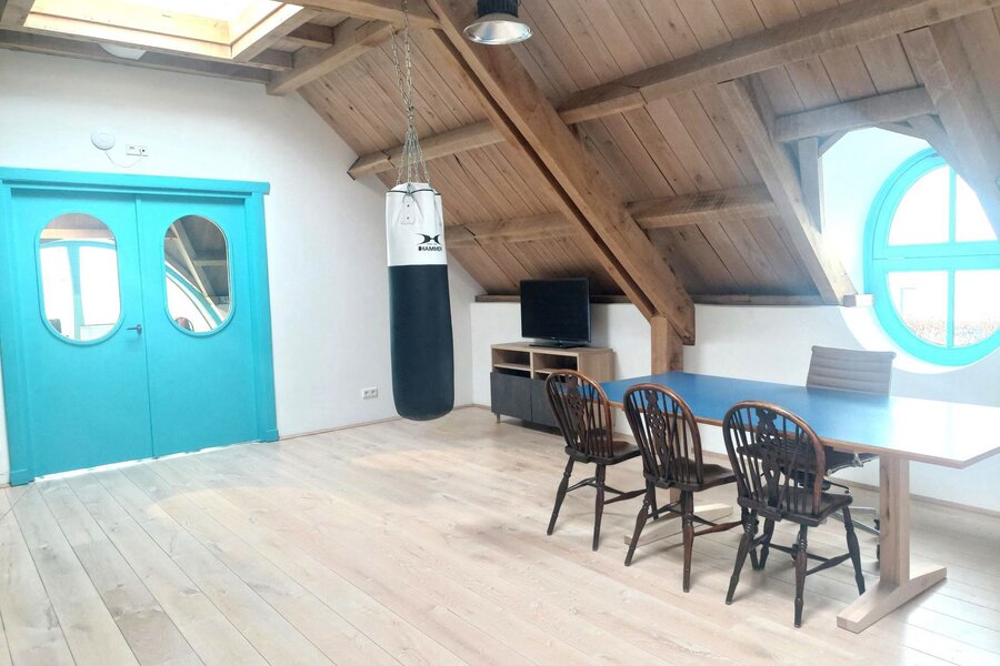 Indeling: Gelijkvloers: ruime woonkamer met open keuken, prachtige parket- en epoxyvloeren, veel lichtinval, badkamer met ligbad en wasplaats