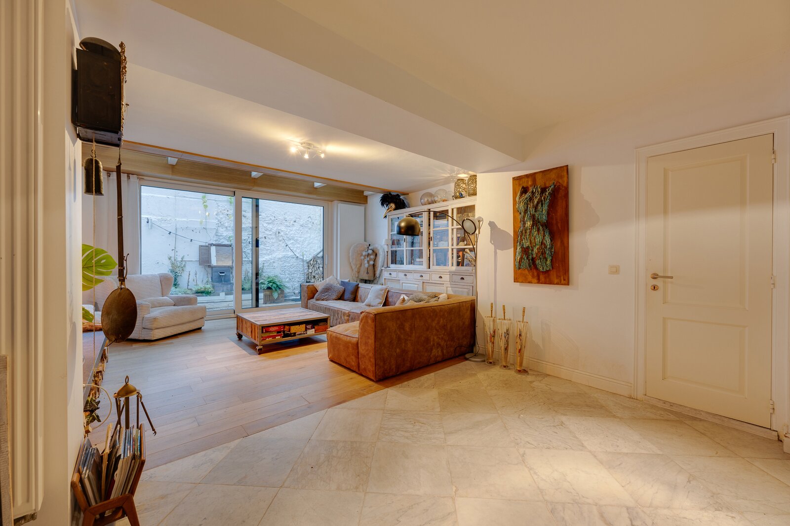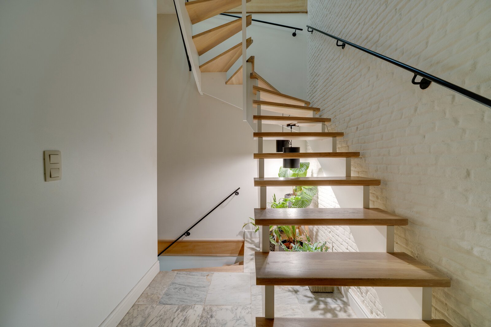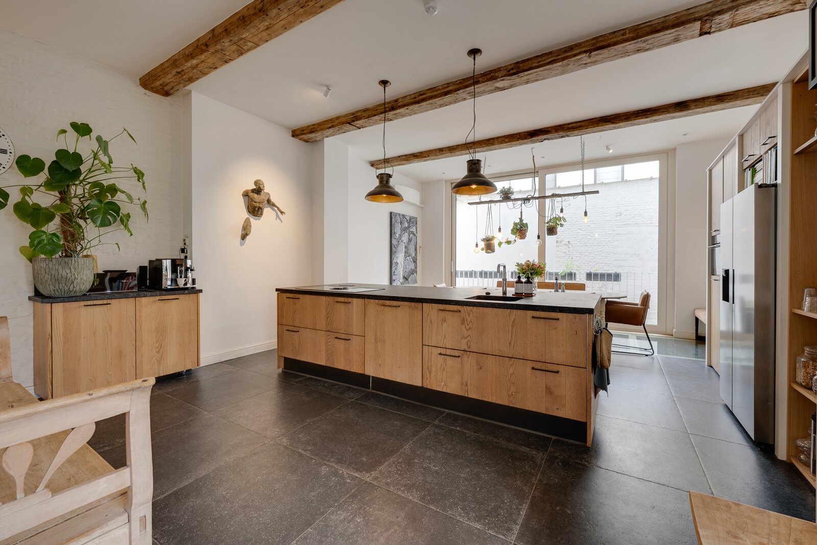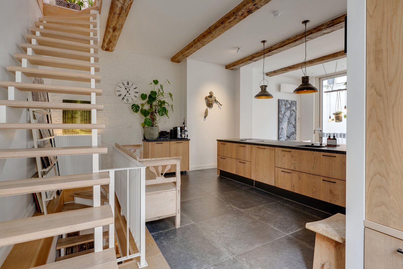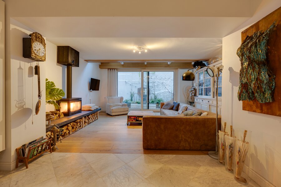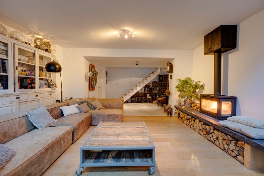 De woning strekt zich uit over meerdere verdiepingen. Het souterrain biedt een gezellige zithoek met houtkachel, een apart toilet en toegang tot een intieme buitenruimte. Op het gelijkvloers bevindt zich de volledig uitgeruste maatwerk leefkeuken met hoogwaardige toestellen, naadloos verbonden met de eetruimte.