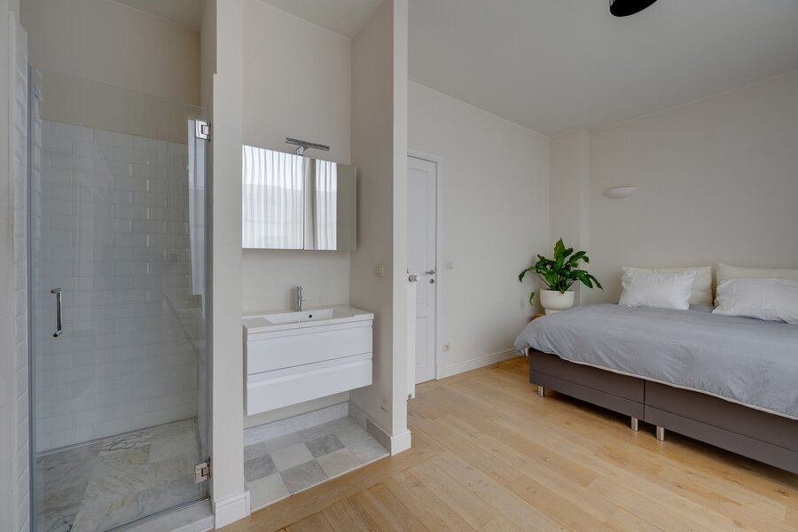 Op de eerste verdieping vind je de royale master bedroom met ensuite badkamer (bad en douche), een dressing, wasruimte/technische berging en een apart toilet.
