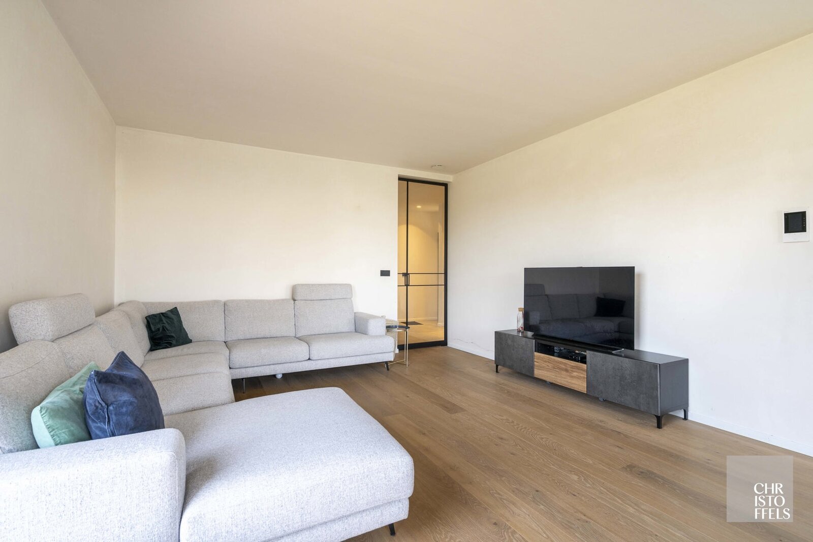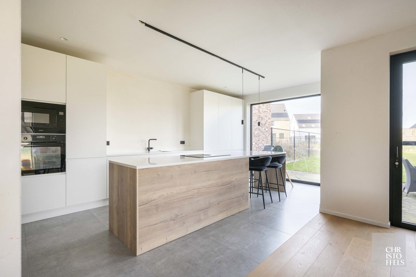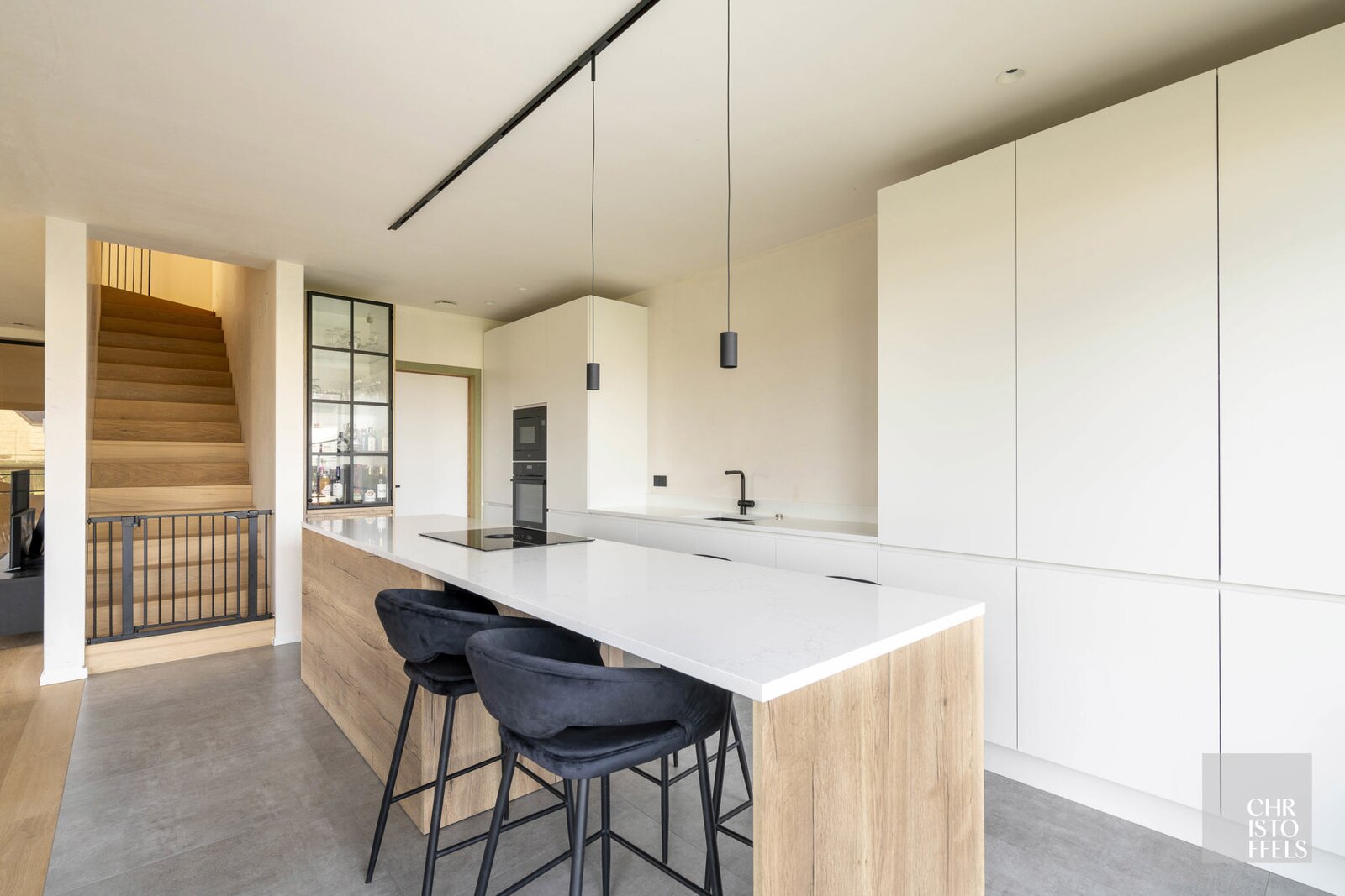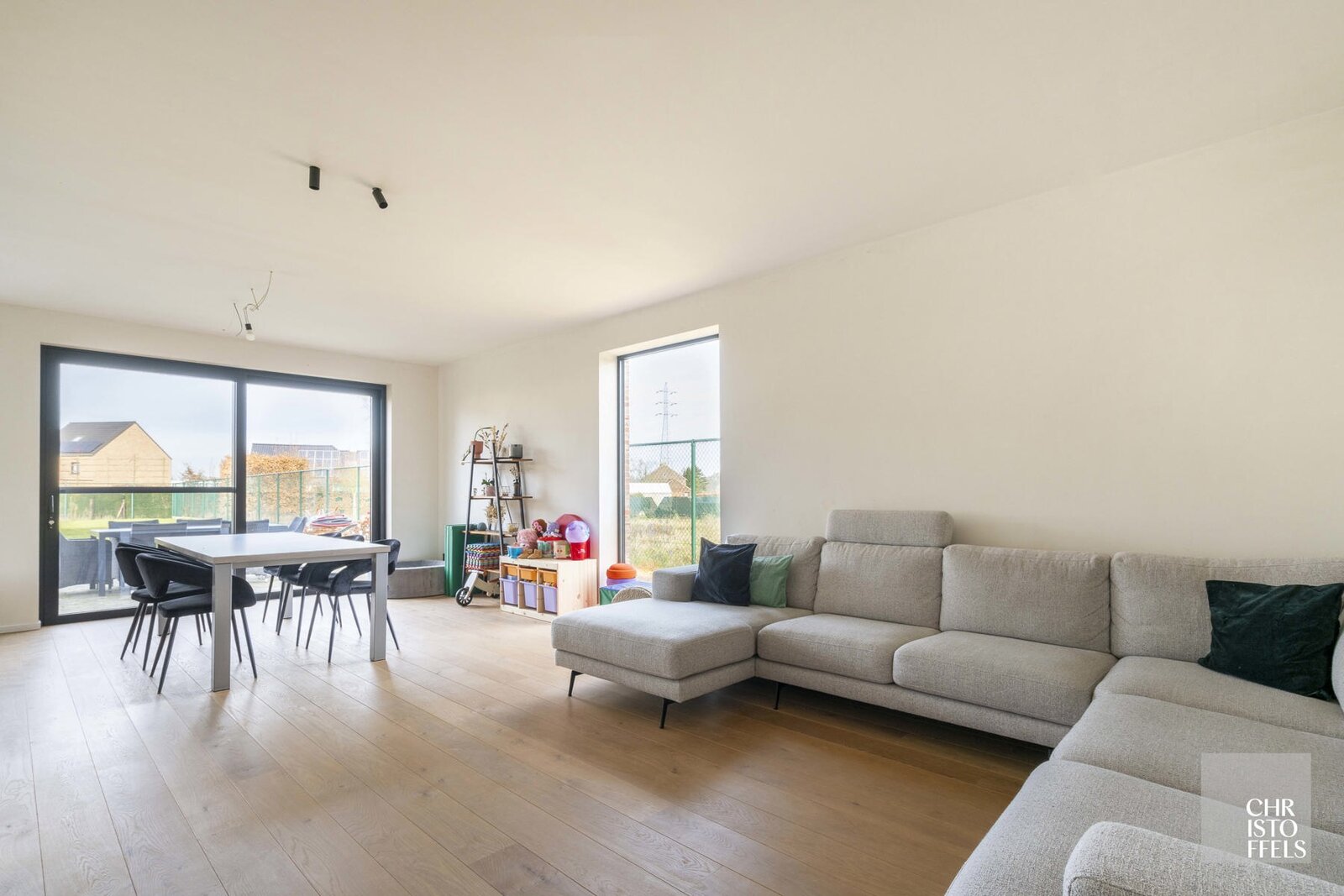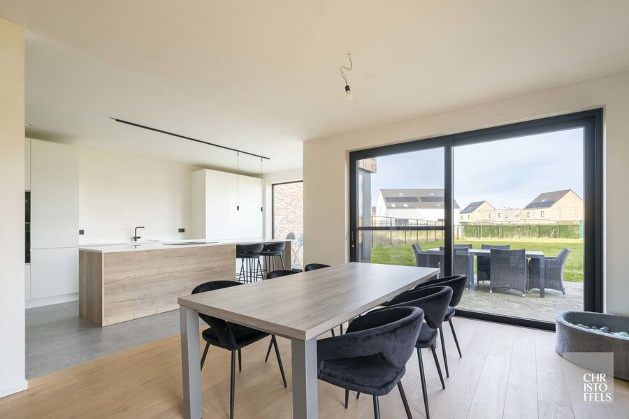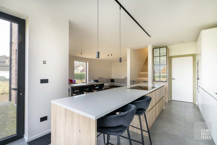 De royale, lichtrijke leefruimte met open keuken geniet van grote raampartijen en biedt een aangenaam wooncomfort.