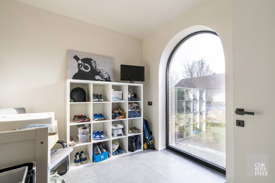 Bij het betreden van de woning kom je in een ruime inkomhal met toegang tot de leefruimte, het gastentoilet en een polyvalente ruimte van ca. 10 m², ideaal als bureau of voor een bijberoep.