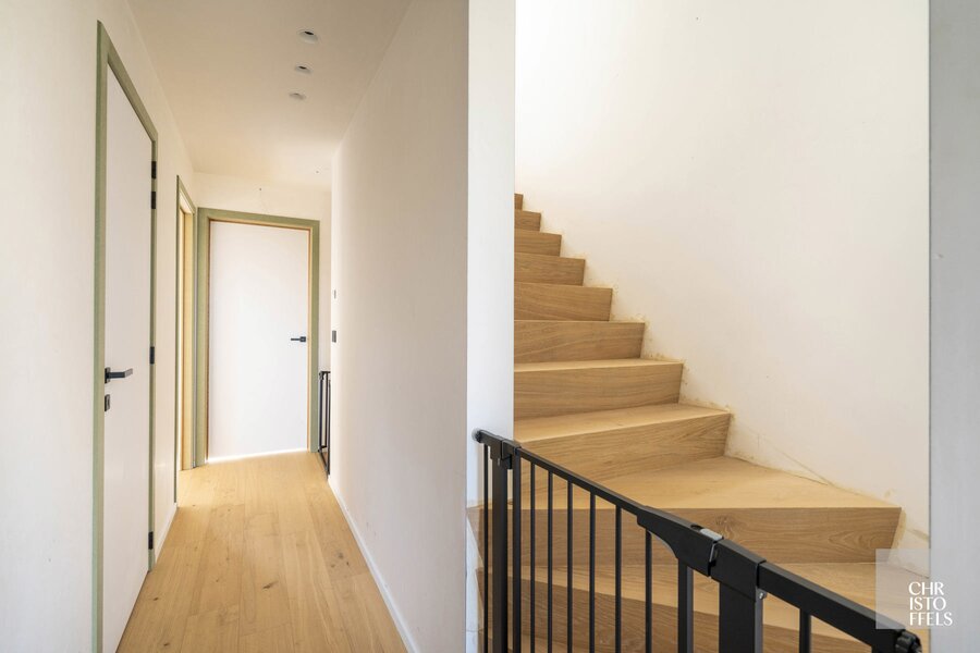 De volledig geïnstalleerde keuken is uitgerust met alle nodige toestellen. De woning werd afgewerkt met een stijlvolle en onderhoudsvriendelijke combinatie van parket en keramische tegels op alle verdiepingen.