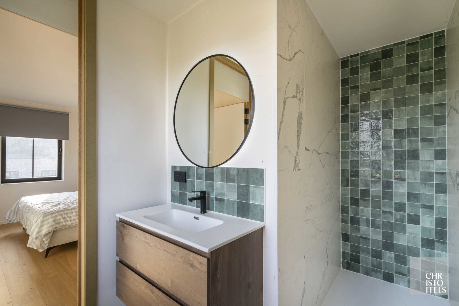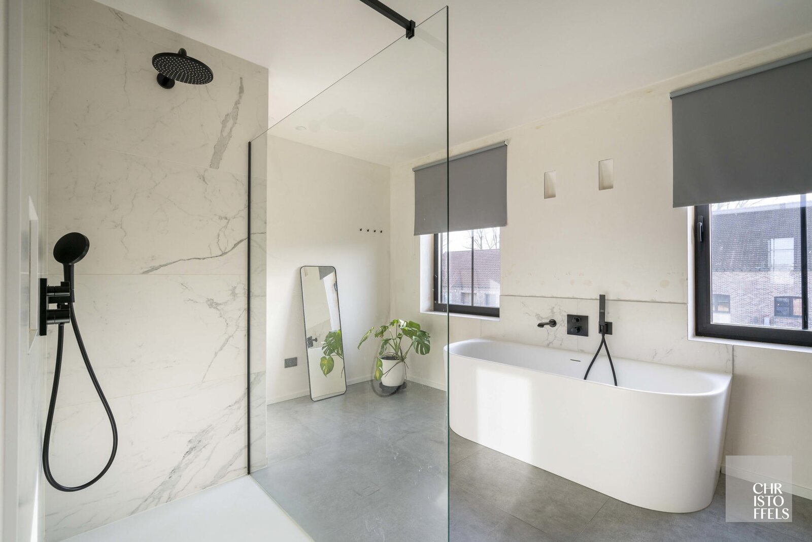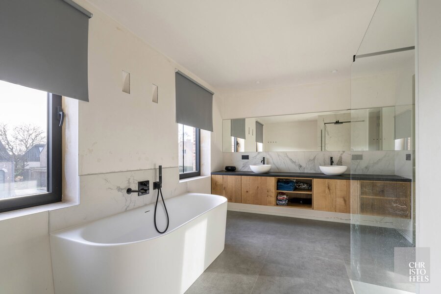 De eerste badkamer beschikt over een ligbad, aparte douche en dubbele wastafel, geïntegreerd in een praktisch badkamermeubel. De tweede badkamer is voorzien van een moderne inloopdouche en enkele wastafel.