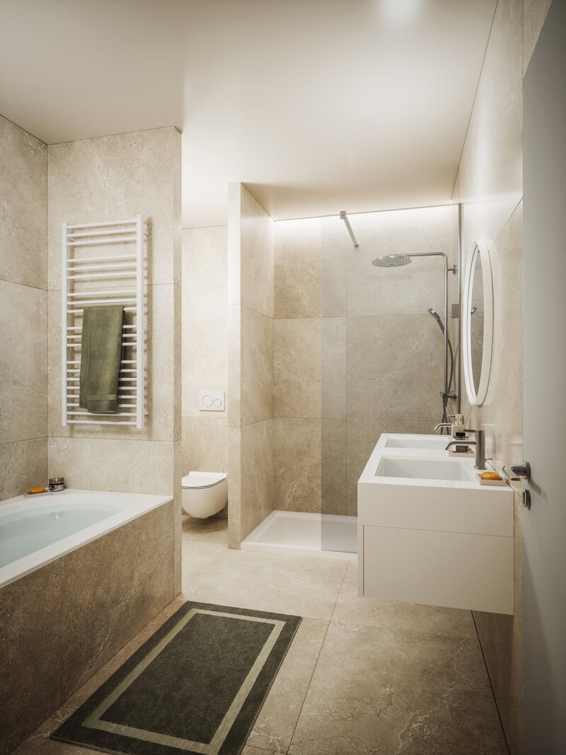 - 13,7 m² grote slaapkamer met aangrenzende badkamer (dubbele wastafel, bad, douche, WC)
