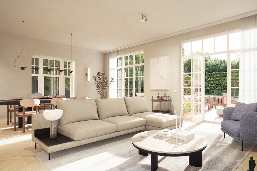 - Een ruime leef -en eetruimte met grote raampartijen en toegang naar het terras en de tuin
