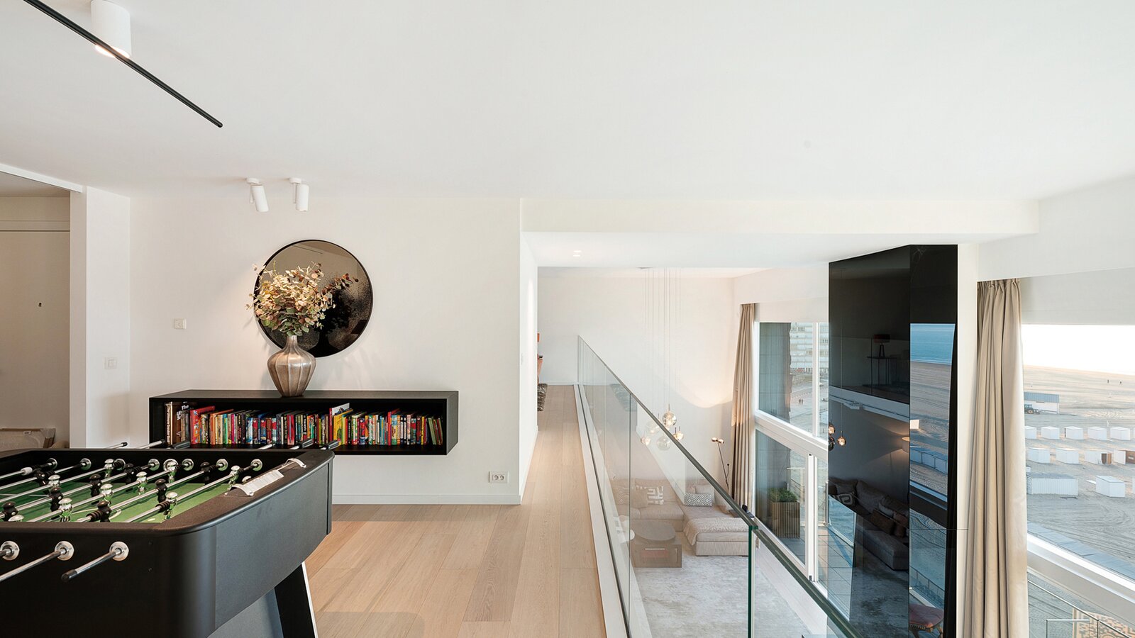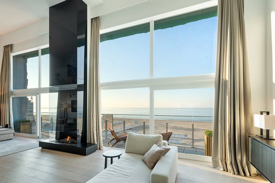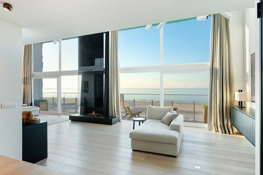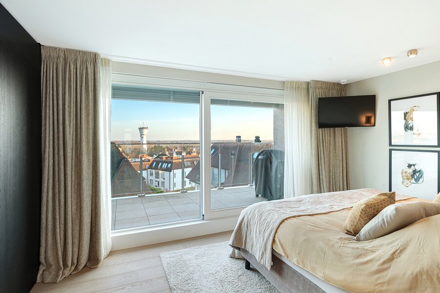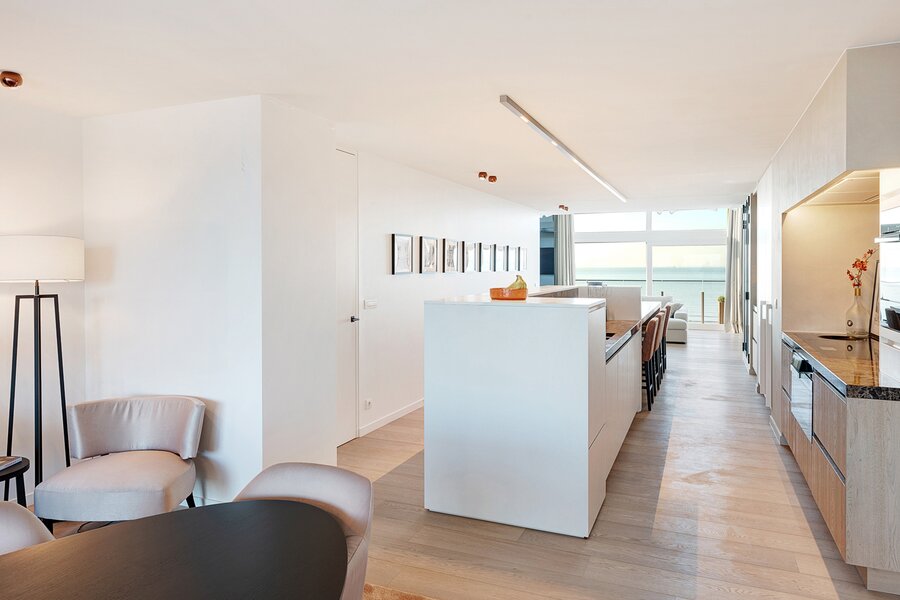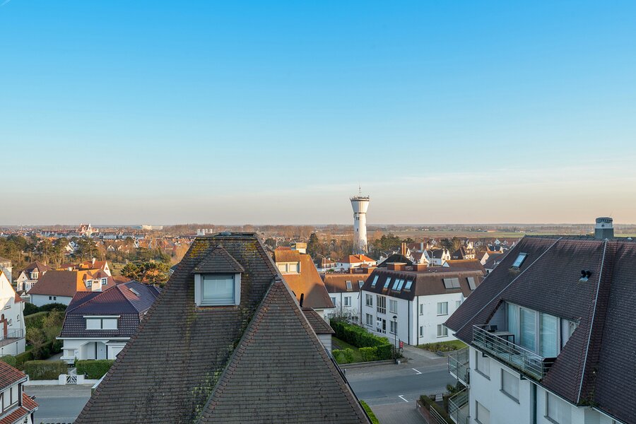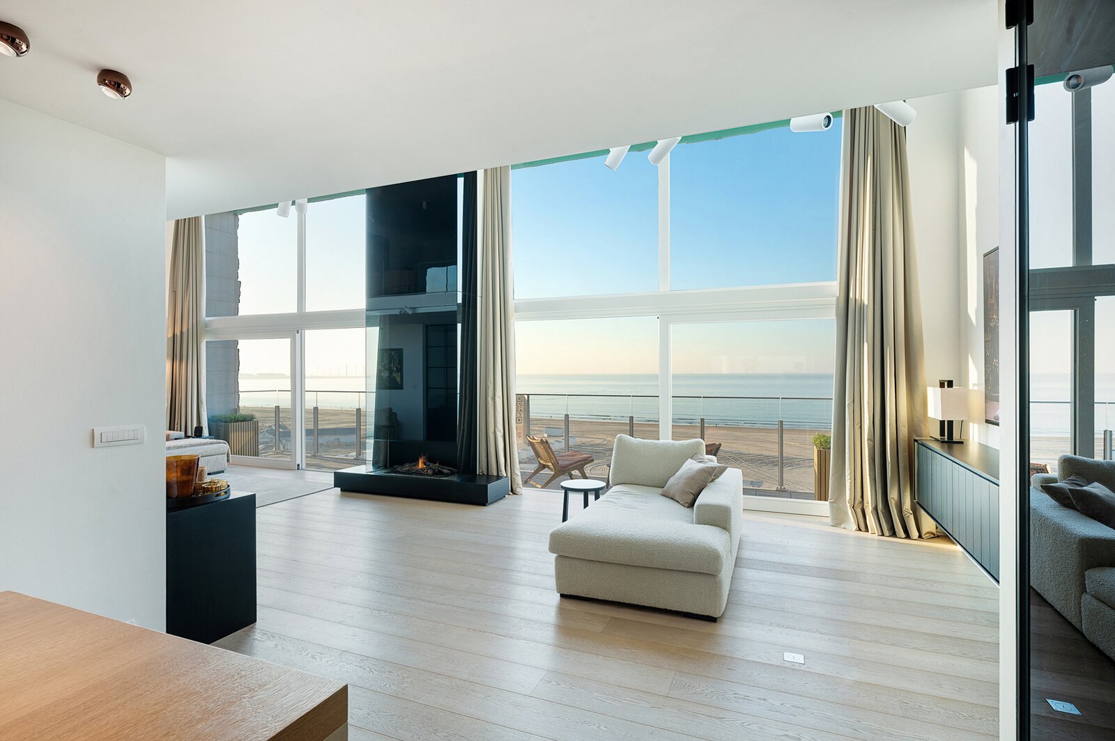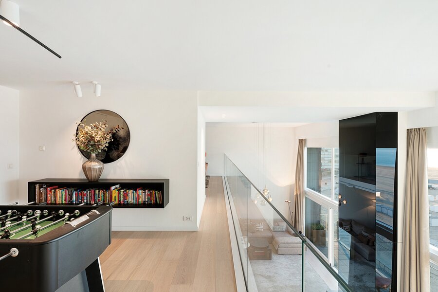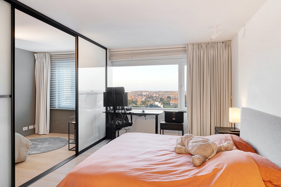 Dit appartement is afgewerkt met duurzame materialen die niet alleen visueel aantrekkelijk zijn, maar ook een warme en uitnodigende sfeer creëren. De inrichting is zorgvuldig samengesteld, waardoor een perfecte balans tussen stijl en comfort ontstaat. De indrukwekkende terrassen zijn zonder twijfel een van de grootste troeven van deze mezzanine. Het ruime terras aan de voorzijde biedt panoramisch zeezicht, waar u dagelijks kunt genieten van het rustgevende geluid van de golven. Daarnaast is er een terras met uitzicht over het hinterland, met een schilderachtig zicht op Duinbergen en de omliggende polders.
