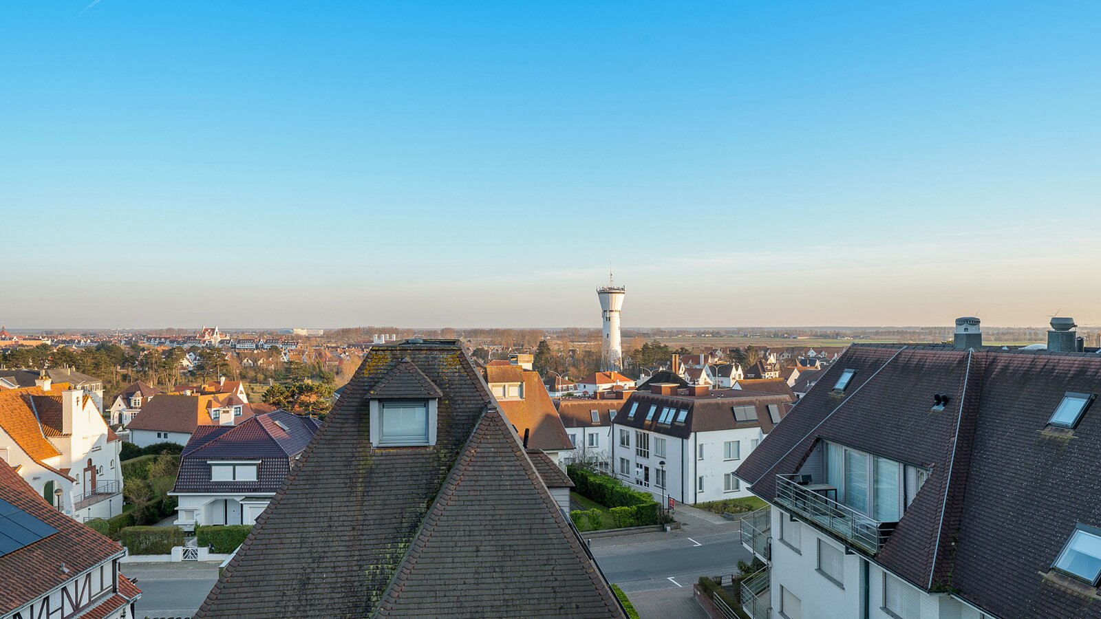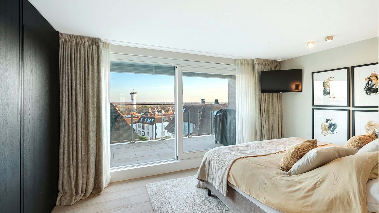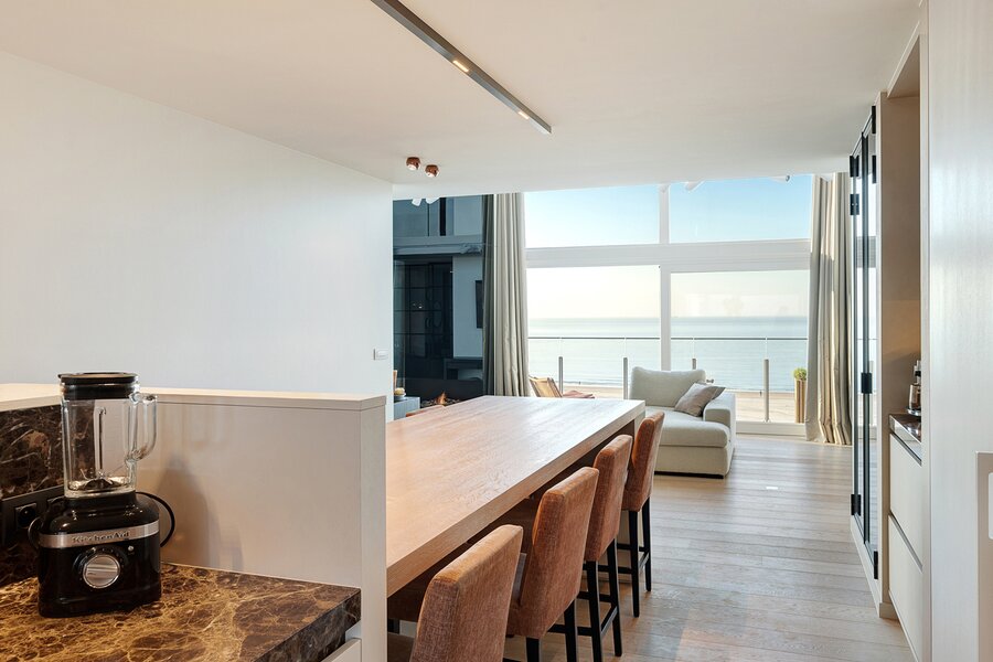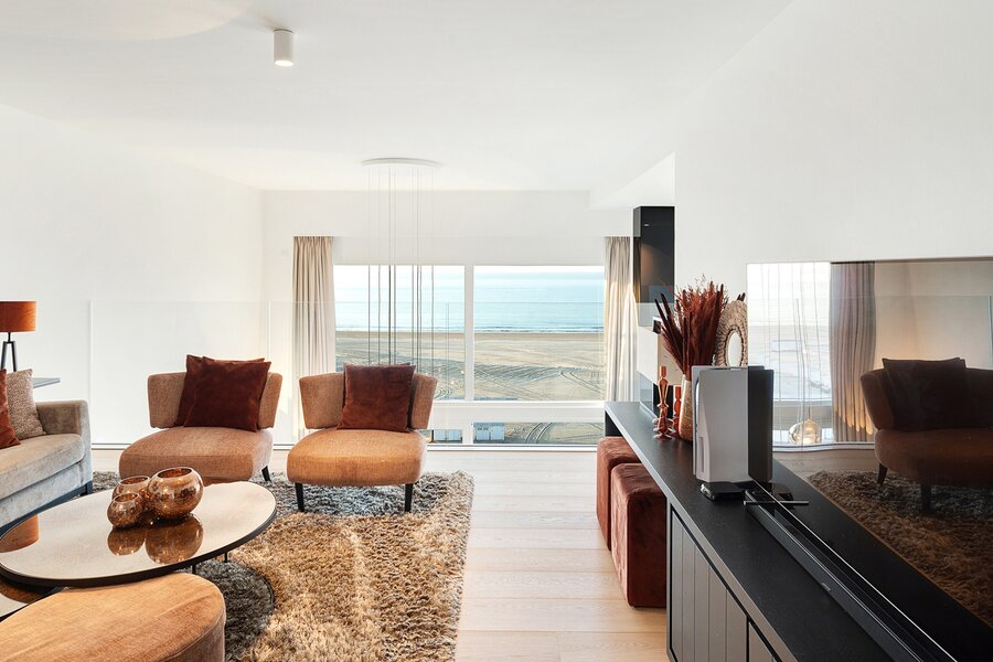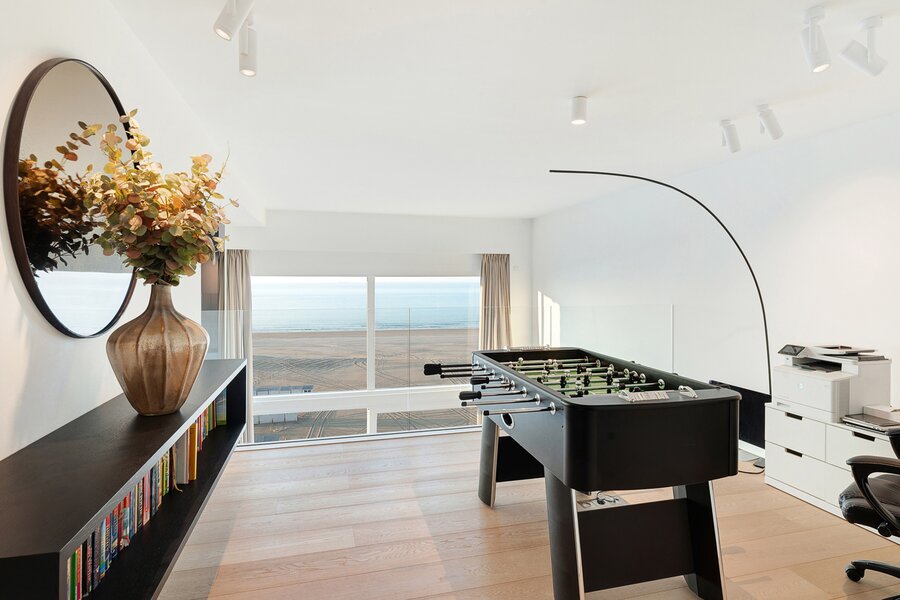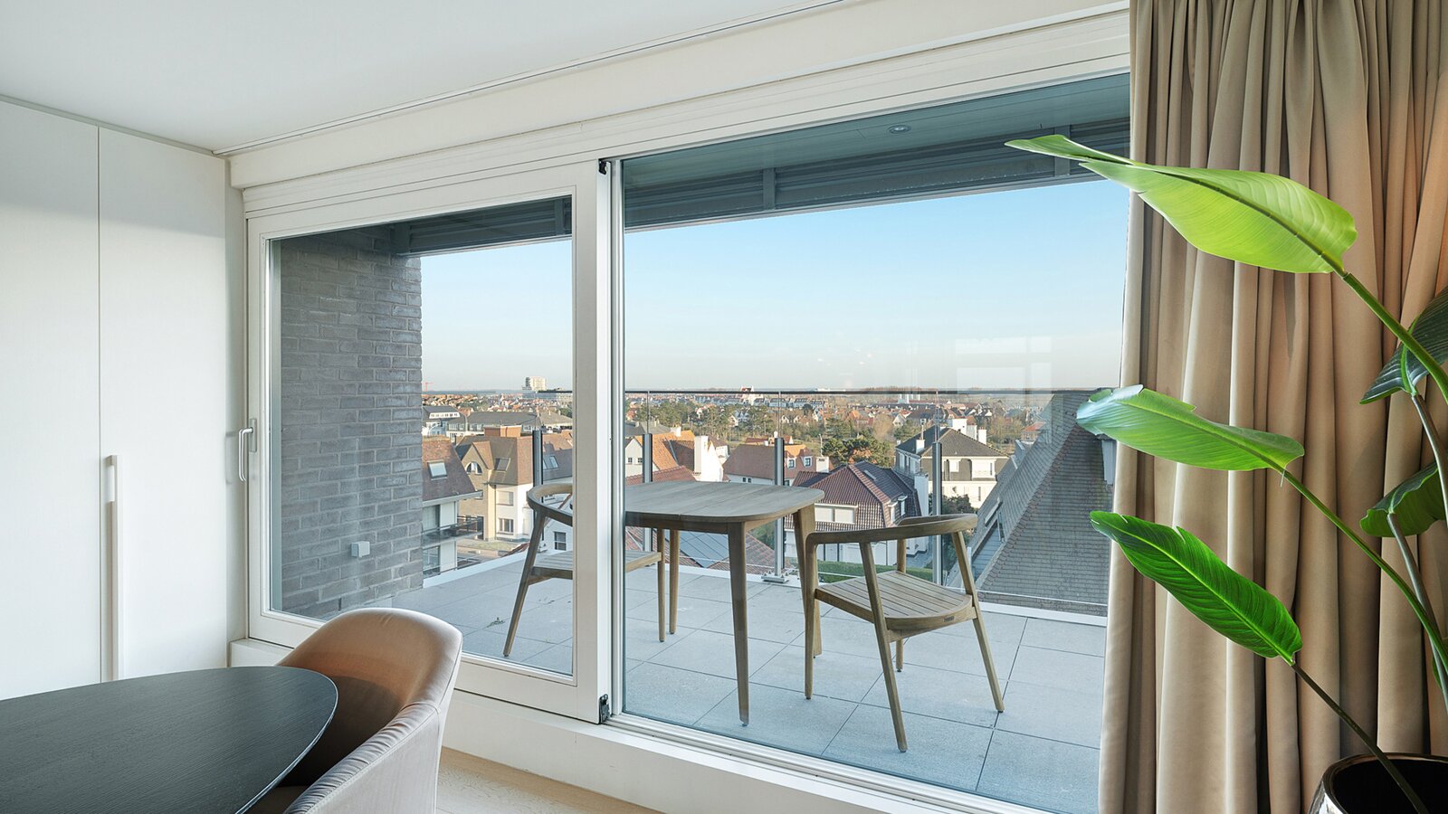Dit appartement is afgewerkt met duurzame materialen die niet alleen visueel aantrekkelijk zijn, maar ook een warme en uitnodigende sfeer creëren. De inrichting is zorgvuldig samengesteld, waardoor een perfecte balans tussen stijl en comfort ontstaat. De indrukwekkende terrassen zijn zonder twijfel een van de grootste troeven van deze mezzanine. Het ruime terras aan de voorzijde biedt panoramisch zeezicht, waar u dagelijks kunt genieten van het rustgevende geluid van de golven. Daarnaast is er een terras met uitzicht over het hinterland, met een schilderachtig zicht op Duinbergen en de omliggende polders.
