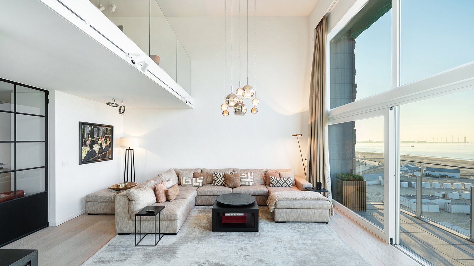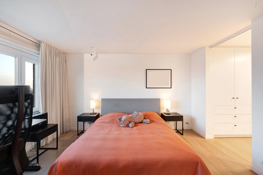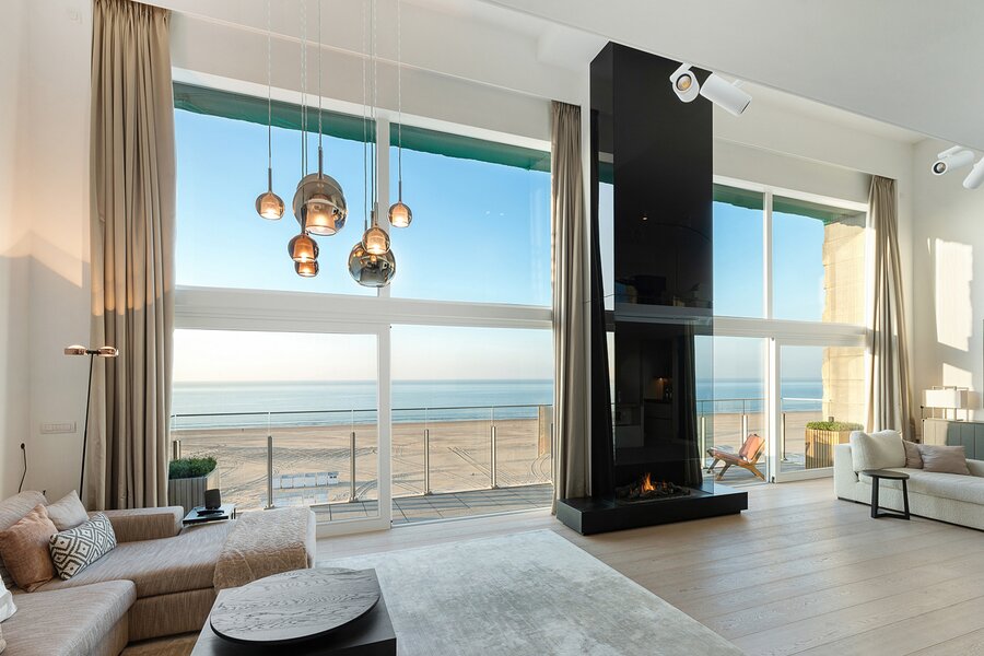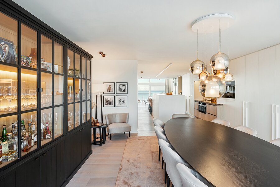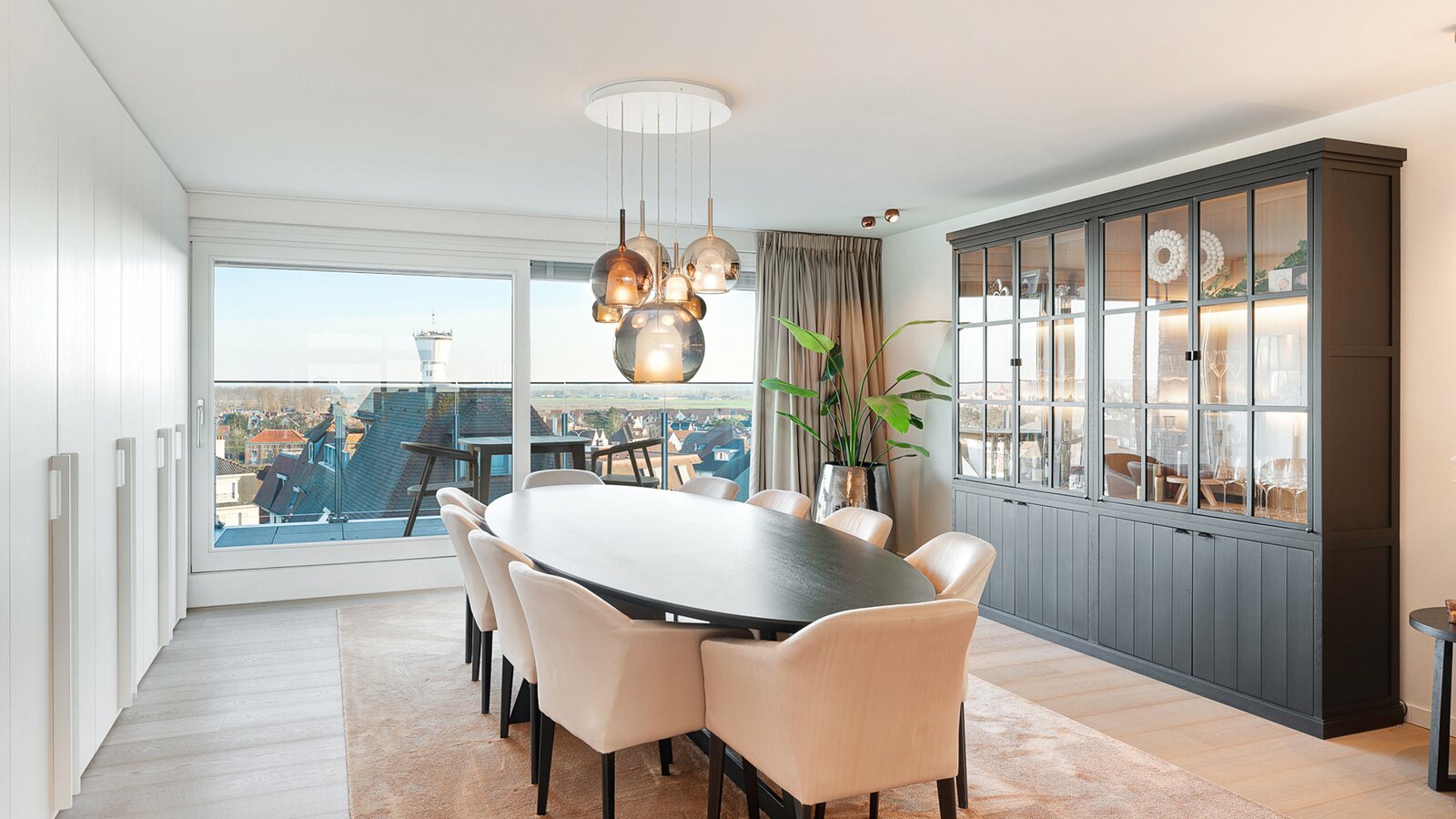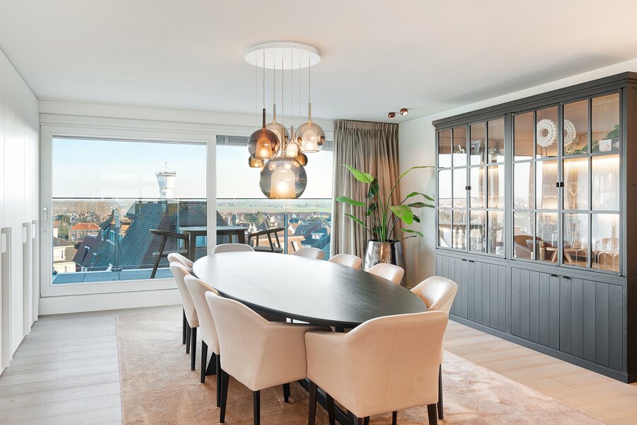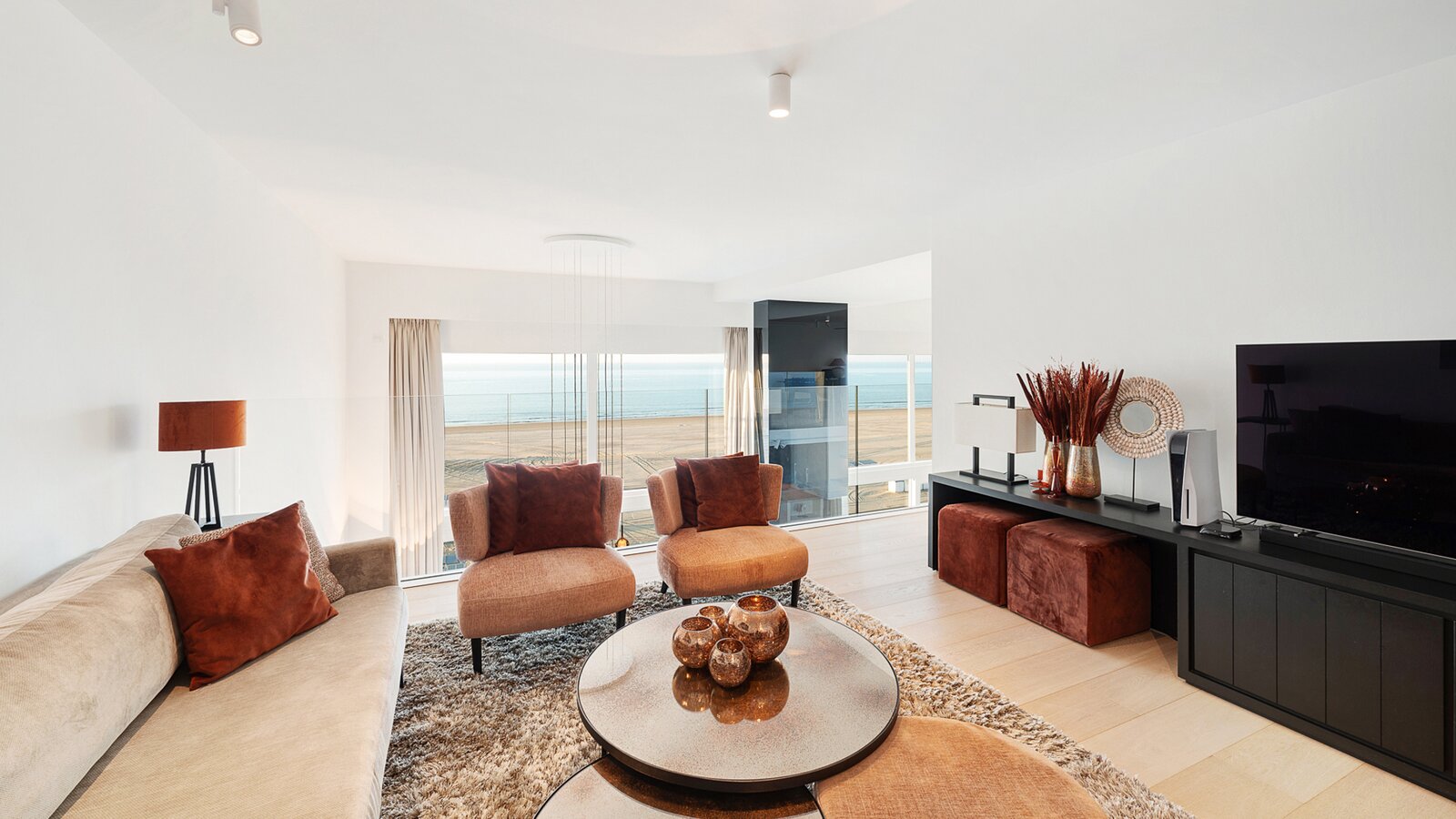Dit appartement is afgewerkt met duurzame materialen die niet alleen visueel aantrekkelijk zijn, maar ook een warme en uitnodigende sfeer creëren. De inrichting is zorgvuldig samengesteld, waardoor een perfecte balans tussen stijl en comfort ontstaat. De indrukwekkende terrassen zijn zonder twijfel een van de grootste troeven van deze mezzanine. Het ruime terras aan de voorzijde biedt panoramisch zeezicht, waar u dagelijks kunt genieten van het rustgevende geluid van de golven. Daarnaast is er een terras met uitzicht over het hinterland, met een schilderachtig zicht op Duinbergen en de omliggende polders.