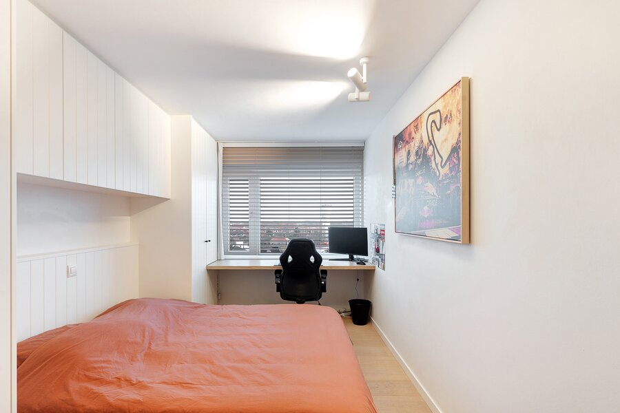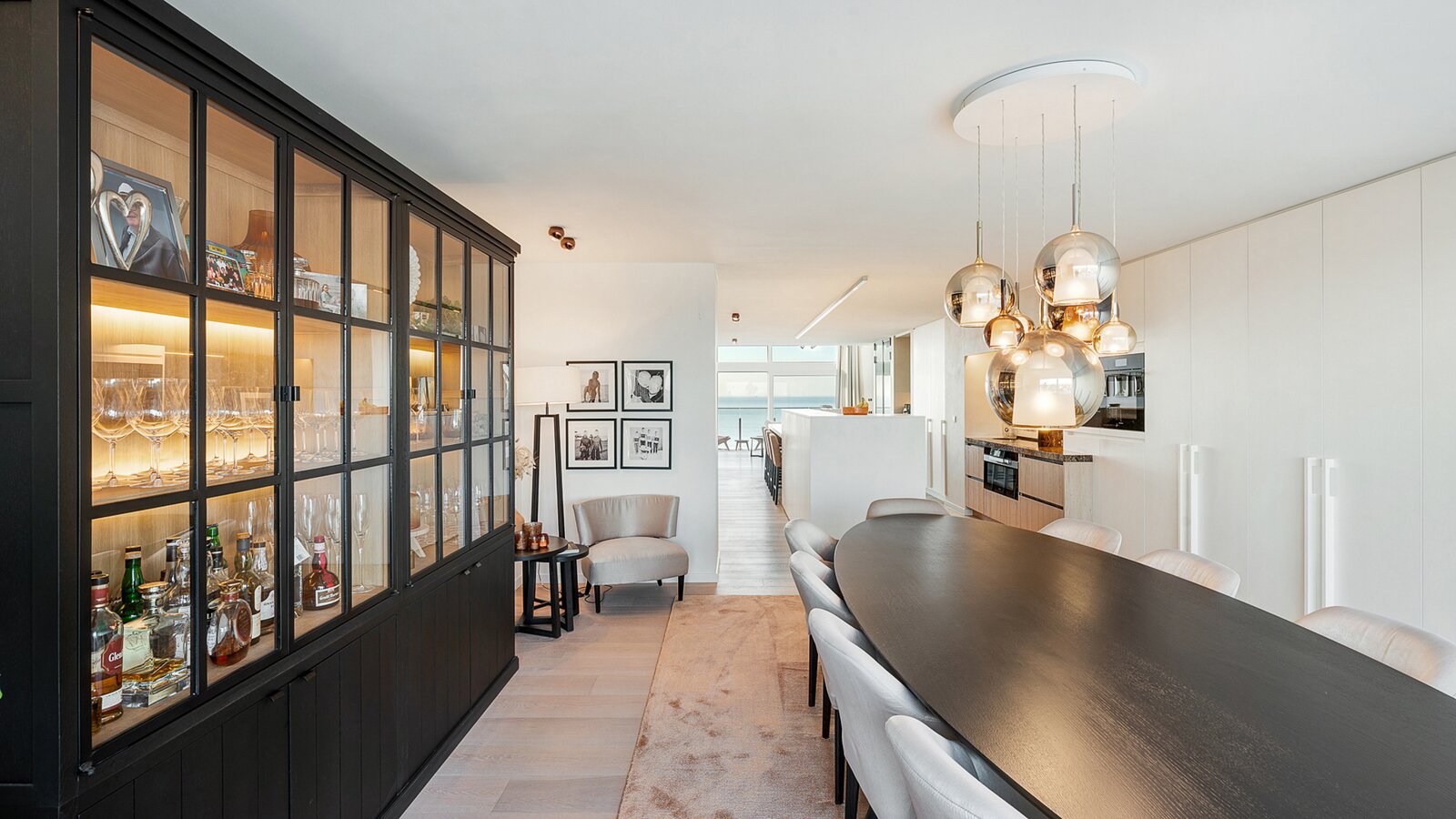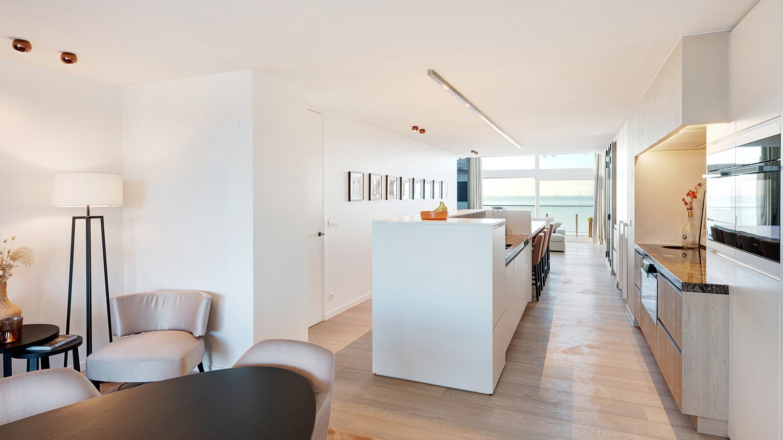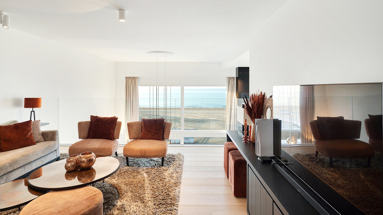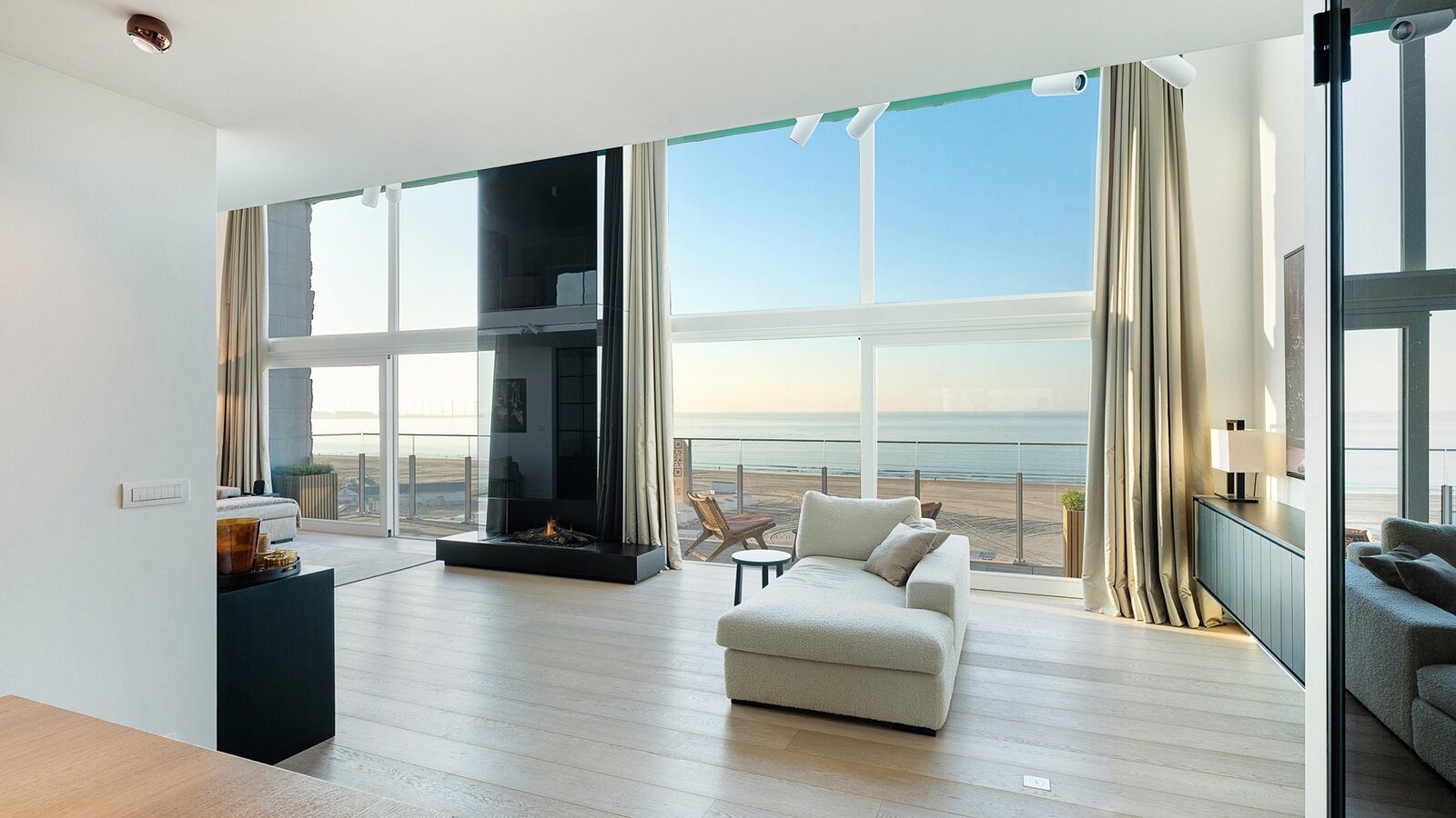 Dit appartement is afgewerkt met duurzame materialen die niet alleen visueel aantrekkelijk zijn, maar ook een warme en uitnodigende sfeer creëren. De inrichting is zorgvuldig samengesteld, waardoor een perfecte balans tussen stijl en comfort ontstaat. De indrukwekkende terrassen zijn zonder twijfel een van de grootste troeven van deze mezzanine. Het ruime terras aan de voorzijde biedt panoramisch zeezicht, waar u dagelijks kunt genieten van het rustgevende geluid van de golven. Daarnaast is er een terras met uitzicht over het hinterland, met een schilderachtig zicht op Duinbergen en de omliggende polders.