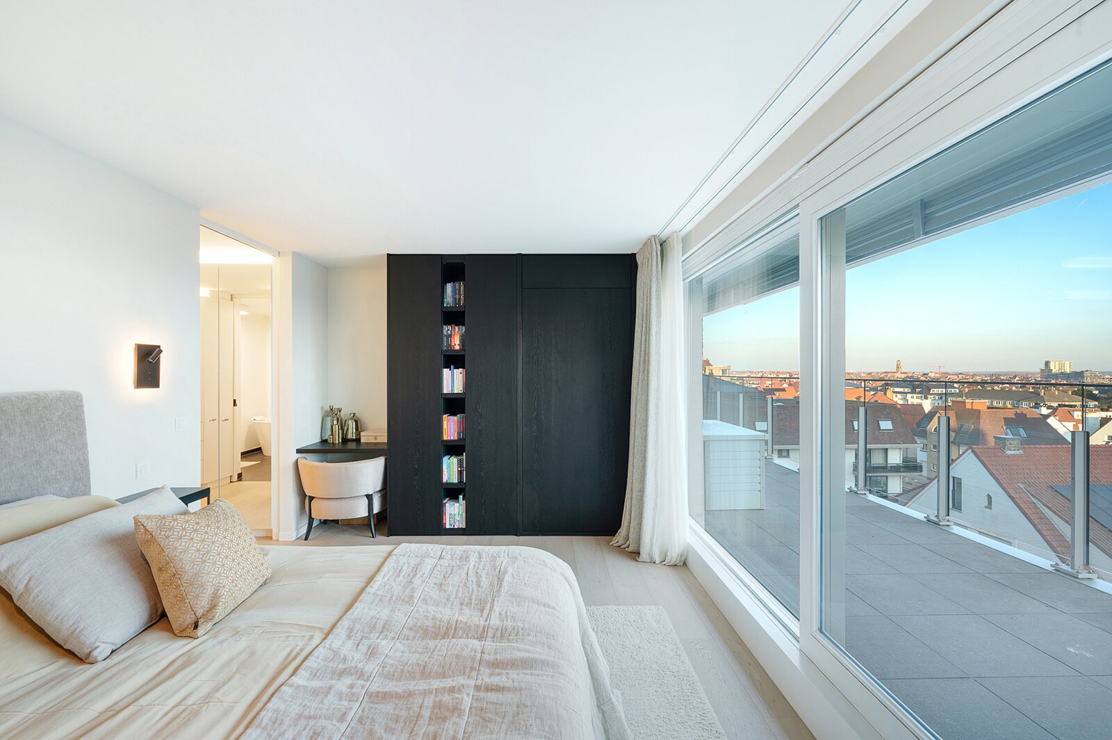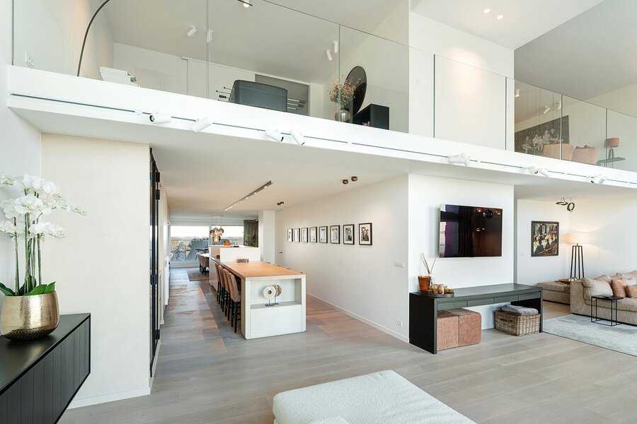 De indeling van het appartement is ideaal omwille van zijn comfort en functionaliteit. De living met gashaard is een prachtig centraal punt, terwijl de keuken en eetplaats uitnodigen tot gezellige momenten. Verder is er een berging, inkomhal met wc, en een ruime vestiaire. De master bedroom beschikt over een dressing en een ensuite badkamer. Daarnaast zijn er een bureel en een extra zithoek, evenals een slaapkamer met dressing en badkamer. Twee extra slaapkamers delen een douchekamer. Tot slot biedt de mezzanine twee ruime terrassen voor optimaal genot van de buitenlucht en het uitzicht.
