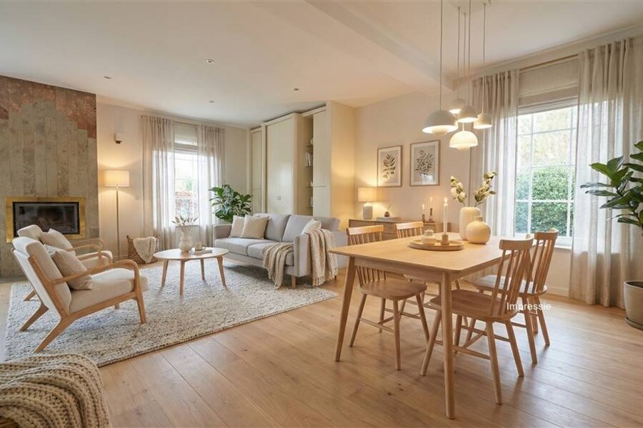 De ruime inkomhal met gastentoilet geeft toegang tot de woonkamer, de keuken en de bureelruimte. De woonkamer omvat een knusse zithoek, een eetplaats en een lichtrijke tuinkamer die uitkijkt over de prachtige tuin. Aansluitend bevindt zich de volledig ingerichte leefkeuken, die dankzij de praktische bijkeuken en wasplaats extra comfort biedt.
