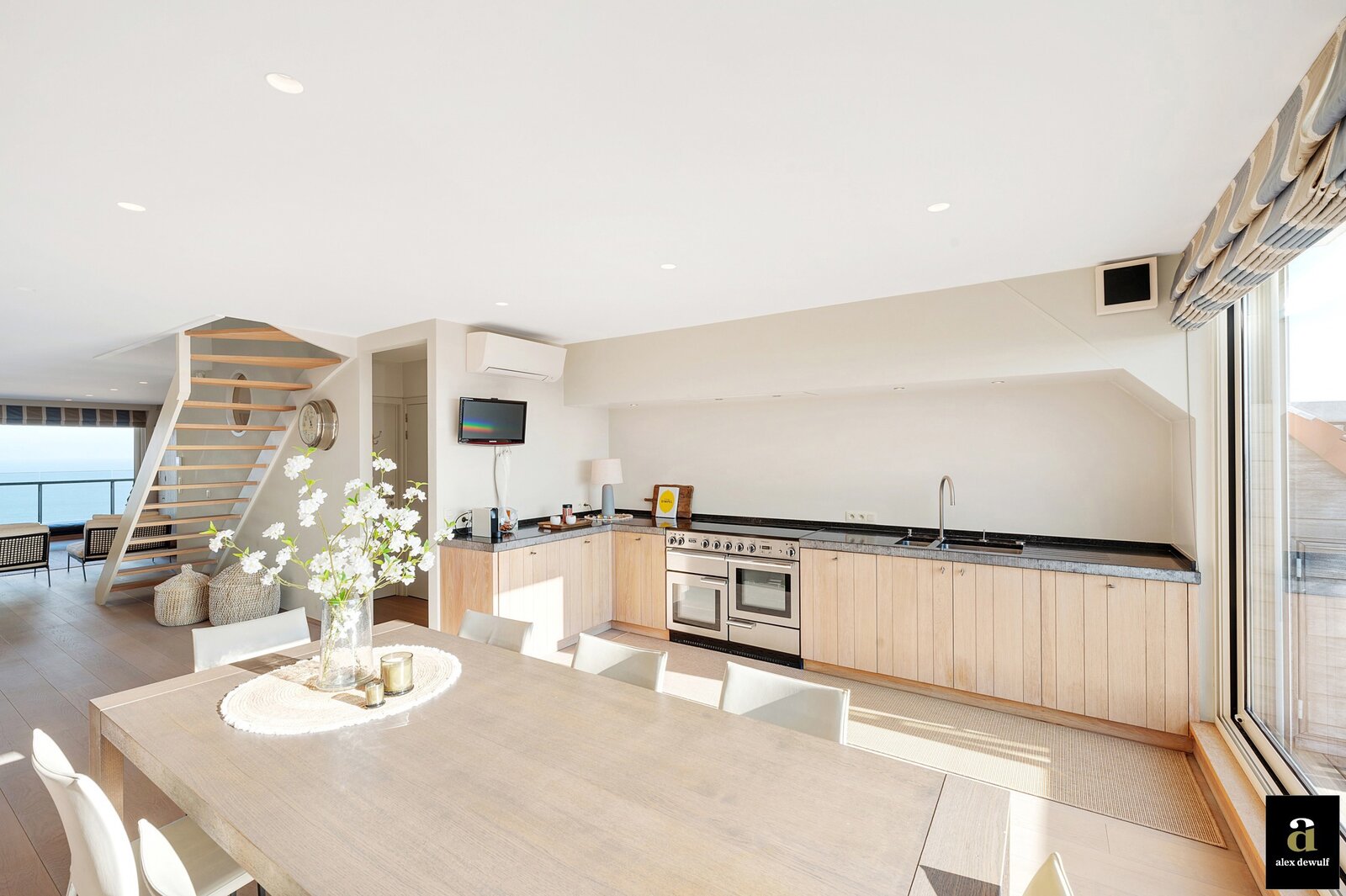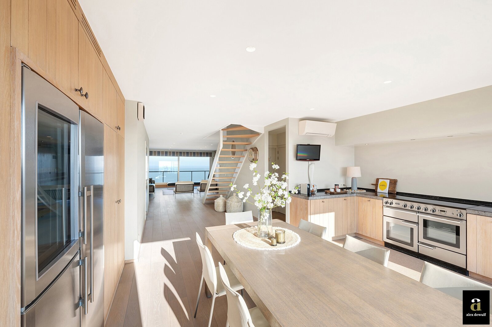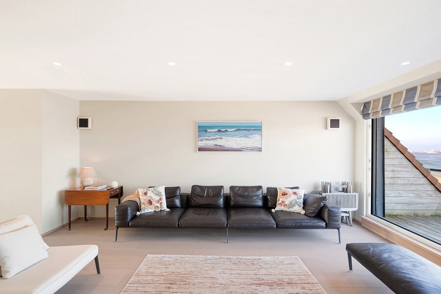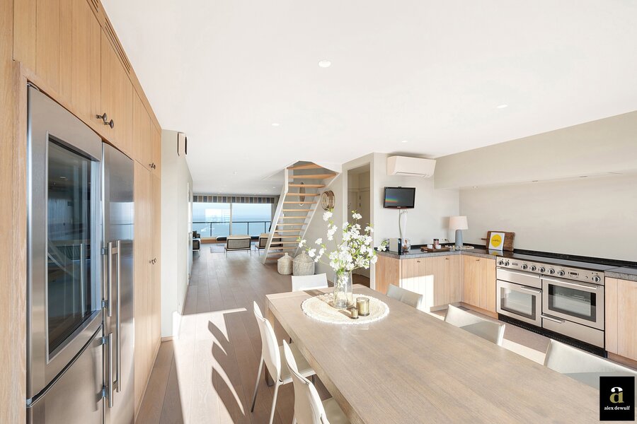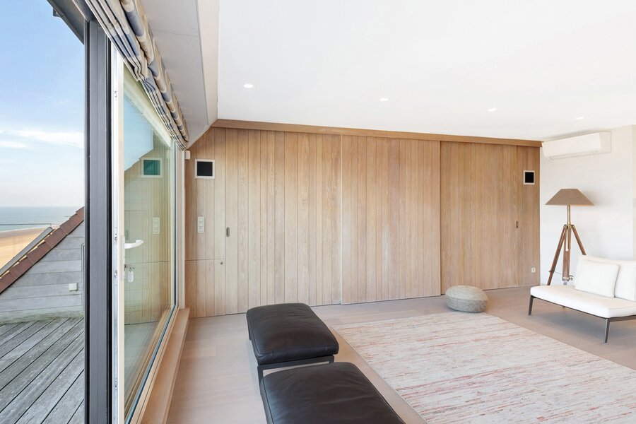 Vanuit de riante leefruimte met brede raampartijen geniet u van een panoramisch zeezicht. Groot terras vooraan met plaats voor een eettafel of ligstoelen. Aansluitend bevindt zich de volledig geïnstalleerde keuken in fineer eik en met natuurstenen werkblad. De keuken bevat alle klassieke keukentoestellen en is bovendien ook uitgerust met een wijnkoeler, een Amerikaanse frigo en aparte diepvries en een magnifieke inox kookfornuis welke alle comfort biedt voor gezellige diners met familie en vrienden. Living in parket met ingebouwde bureauhoek. In de aparte inkomhal is een dubbele vestiairekast, alsook een gastentoilet en ruime berging met wasmachine-aansluiting aanwezig.