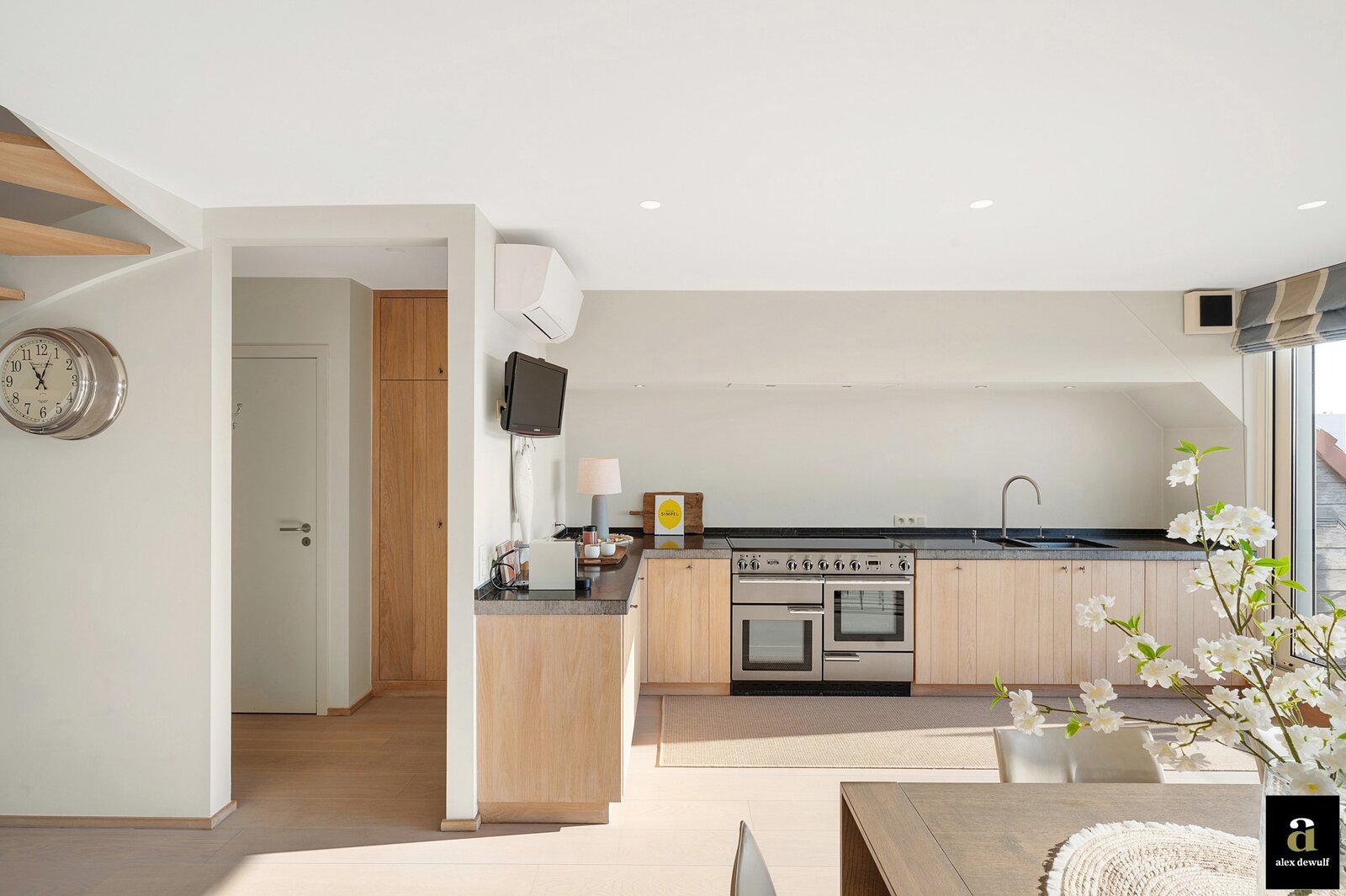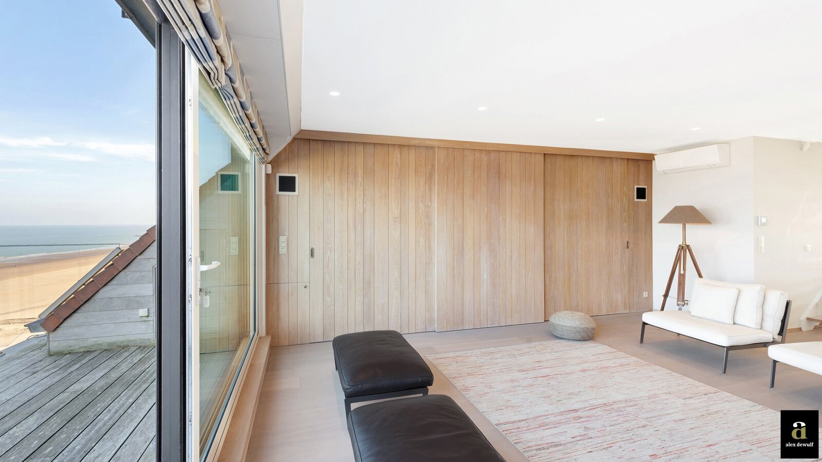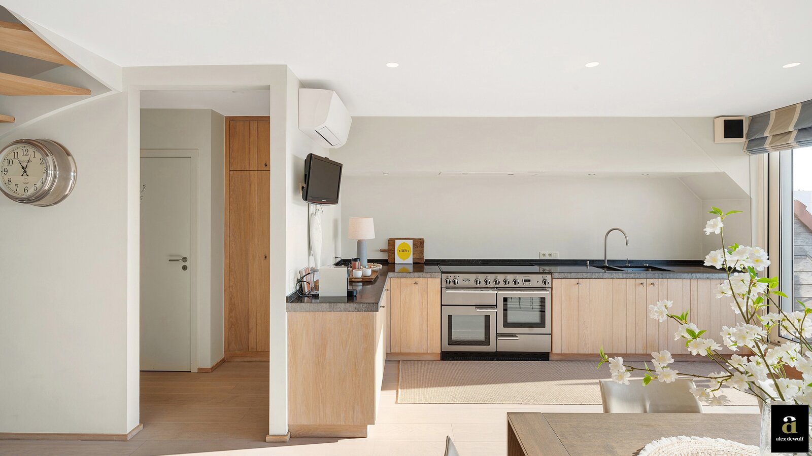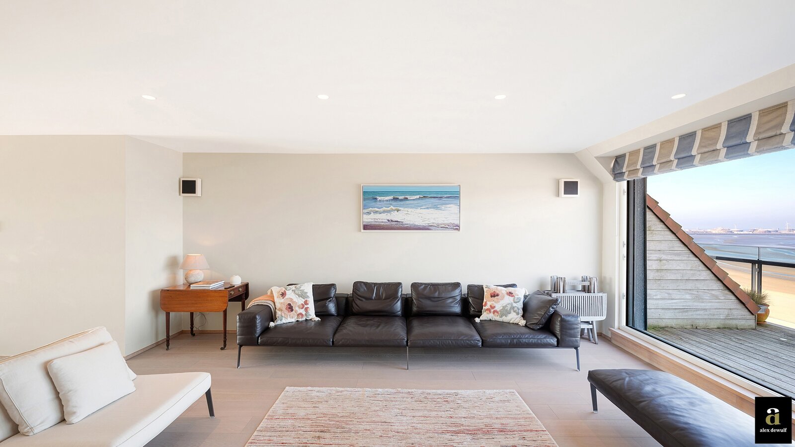Vanuit de riante leefruimte met brede raampartijen geniet u van een panoramisch zeezicht. Groot terras vooraan met plaats voor een eettafel of ligstoelen. Aansluitend bevindt zich de volledig geïnstalleerde keuken in fineer eik en met natuurstenen werkblad. De keuken bevat alle klassieke keukentoestellen en is bovendien ook uitgerust met een wijnkoeler, een Amerikaanse frigo en aparte diepvries en een magnifieke inox kookfornuis welke alle comfort biedt voor gezellige diners met familie en vrienden. Living in parket met ingebouwde bureauhoek. In de aparte inkomhal is een dubbele vestiairekast, alsook een gastentoilet en ruime berging met wasmachine-aansluiting aanwezig.