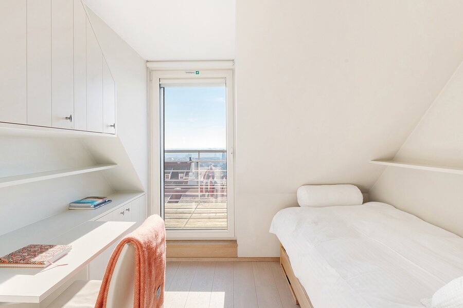 Op de achtergevel zijn er nog 2 slaapkamers, waaronder 1 voor een dubbel bed en met eigen douchekamer en één kamer voor een enkel bed. Beide kamers geven uit op het 3e zuidgerichte terras met zicht op het hinterland.
