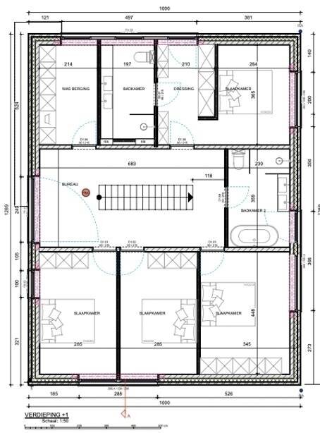 Op de eerste verdieping bevinden zich 4 ruime slaapkamers, een dressing en 2 badkamers, waarvan een ensuite badkamer bij de master bedroom.