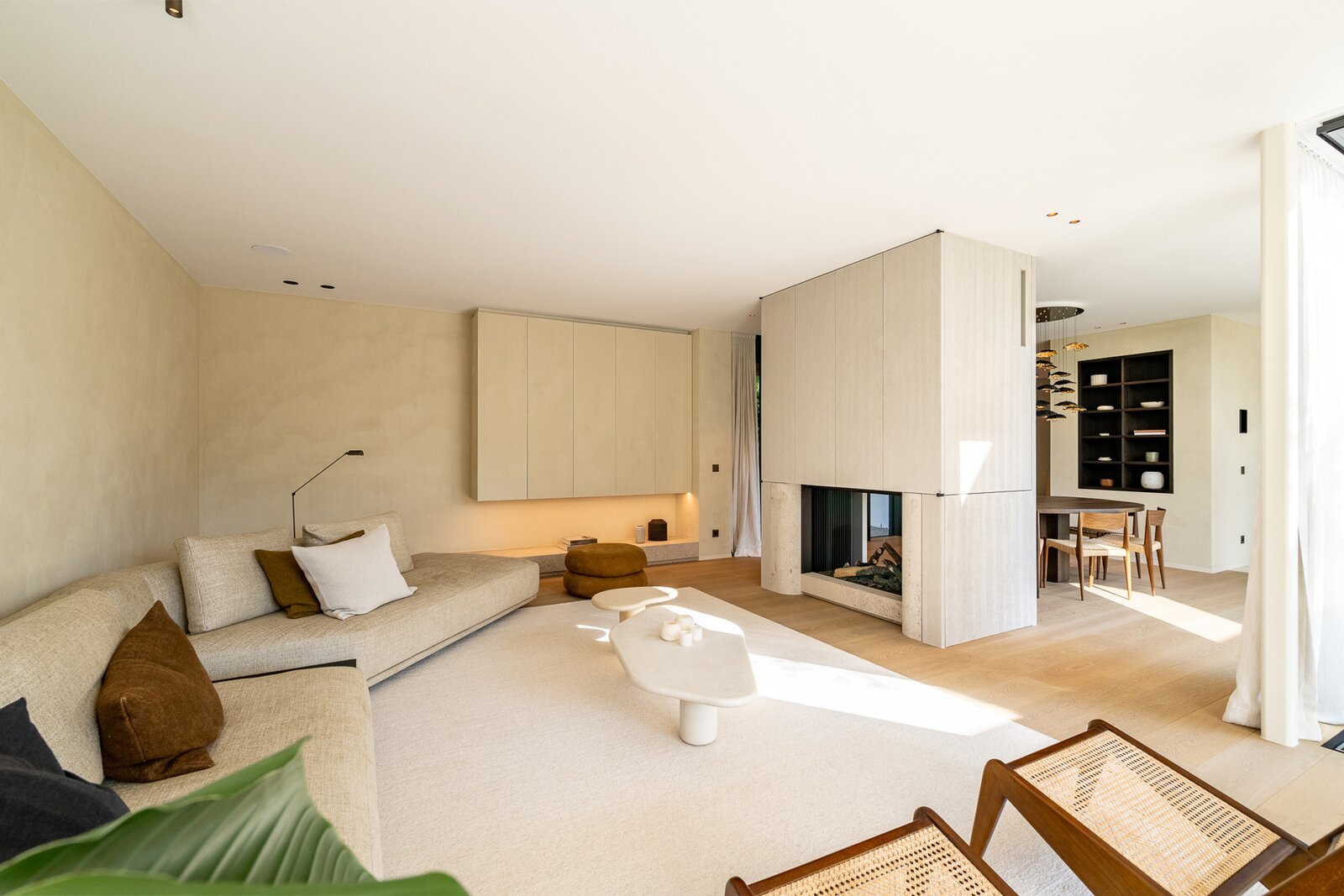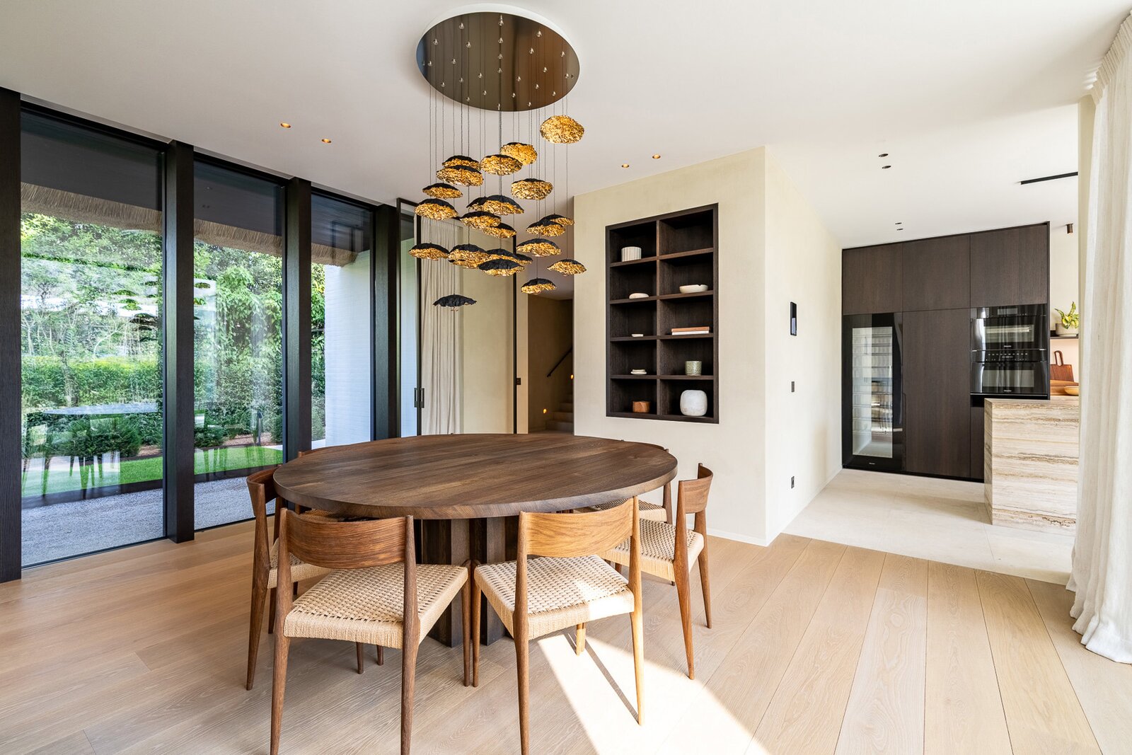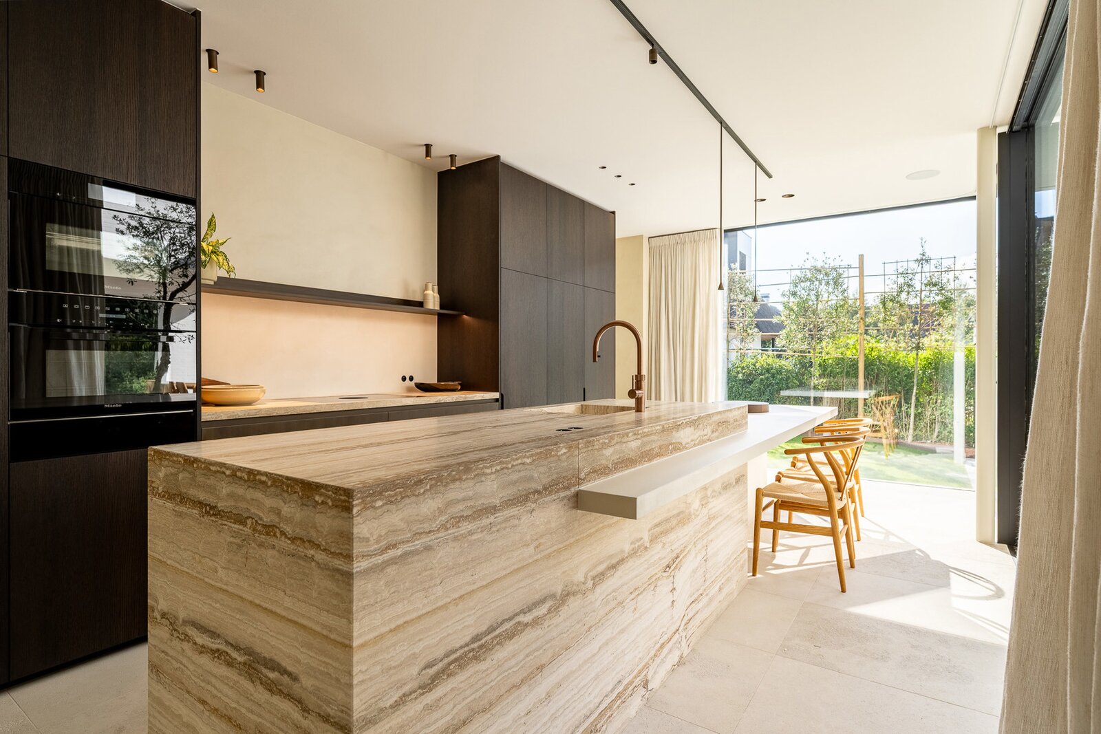Bij binnenkomst word je verwelkomd in een stijlvolle inkomhal met vestiaire en gastentoilet. De ruime eet- en leefruimte geniet van een overvloed aan natuurlijk licht en geeft uit op het prachtig aangelegde terras. de open keuken is volledig uitgerust met kwalitatieve toestellen en biedt alle comfort.