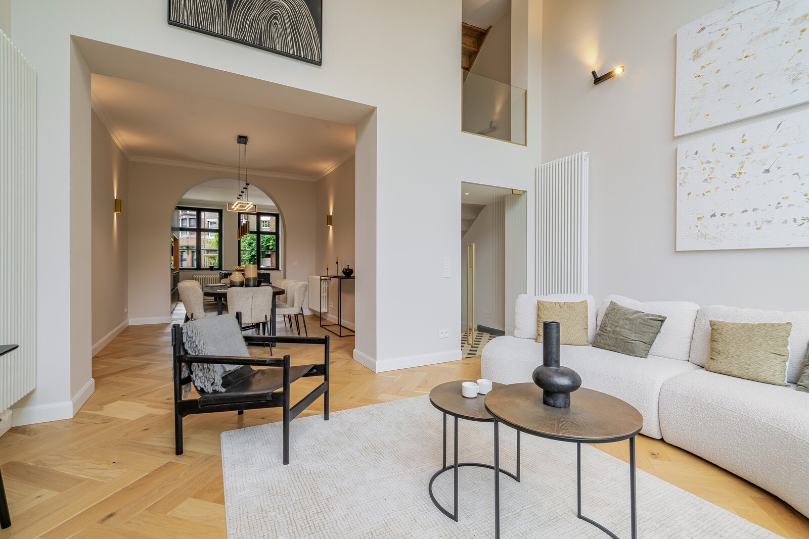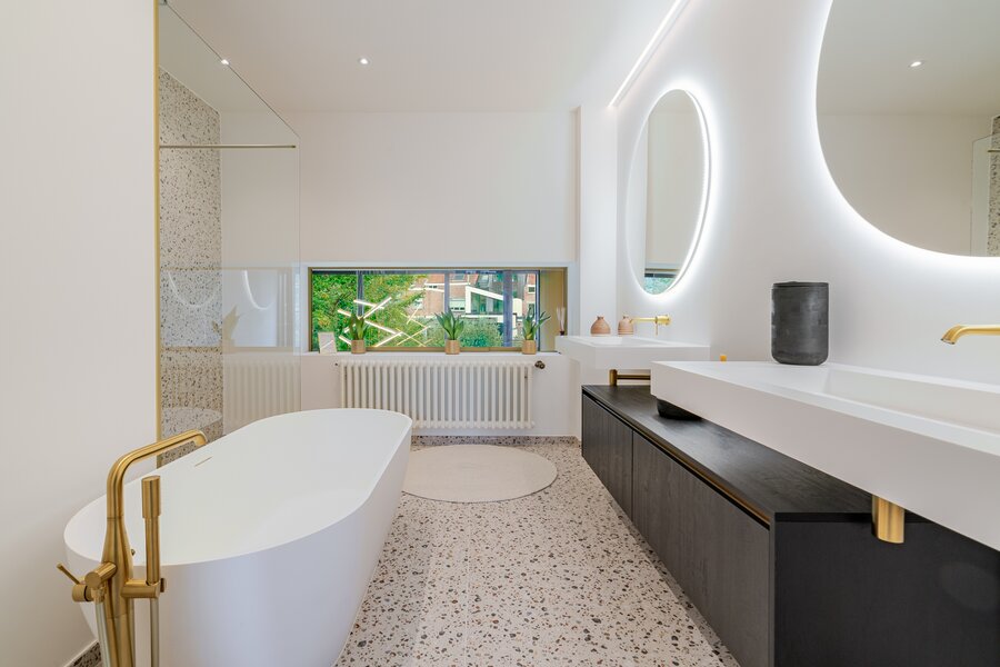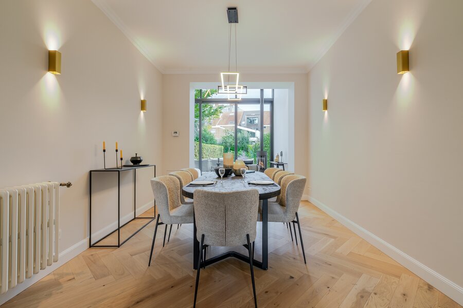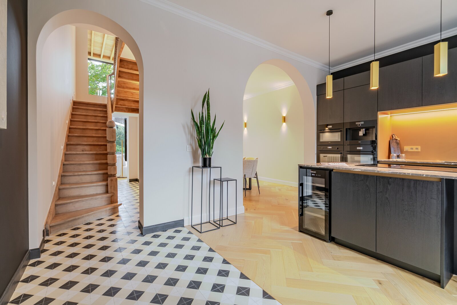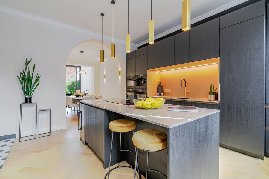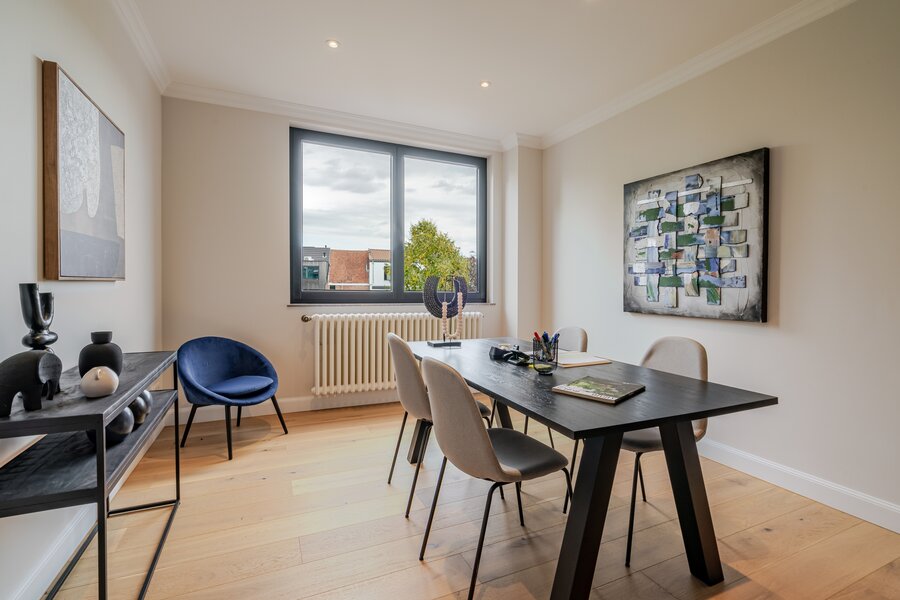 Deze architectenwoning uit 1939 onderging een totaalrenovatie met respect voor de orignele elementen in combinatie met eigentijds design. Het resultaat is een parel met alle comfort en perfecte afwerking. Verlichting van Wever&Ducré, Niko Home Control, Kraanwerk van Grohe Essence, Kroonlijst is artisanaal maatwerk, Keuken en vensterbanken in Italiaanse marmer, Visgraat parket, Blauwe hardsteen en eenheid van topmaterialen en kleurcode brengen doorheen de ganse woning sfeer en rust.