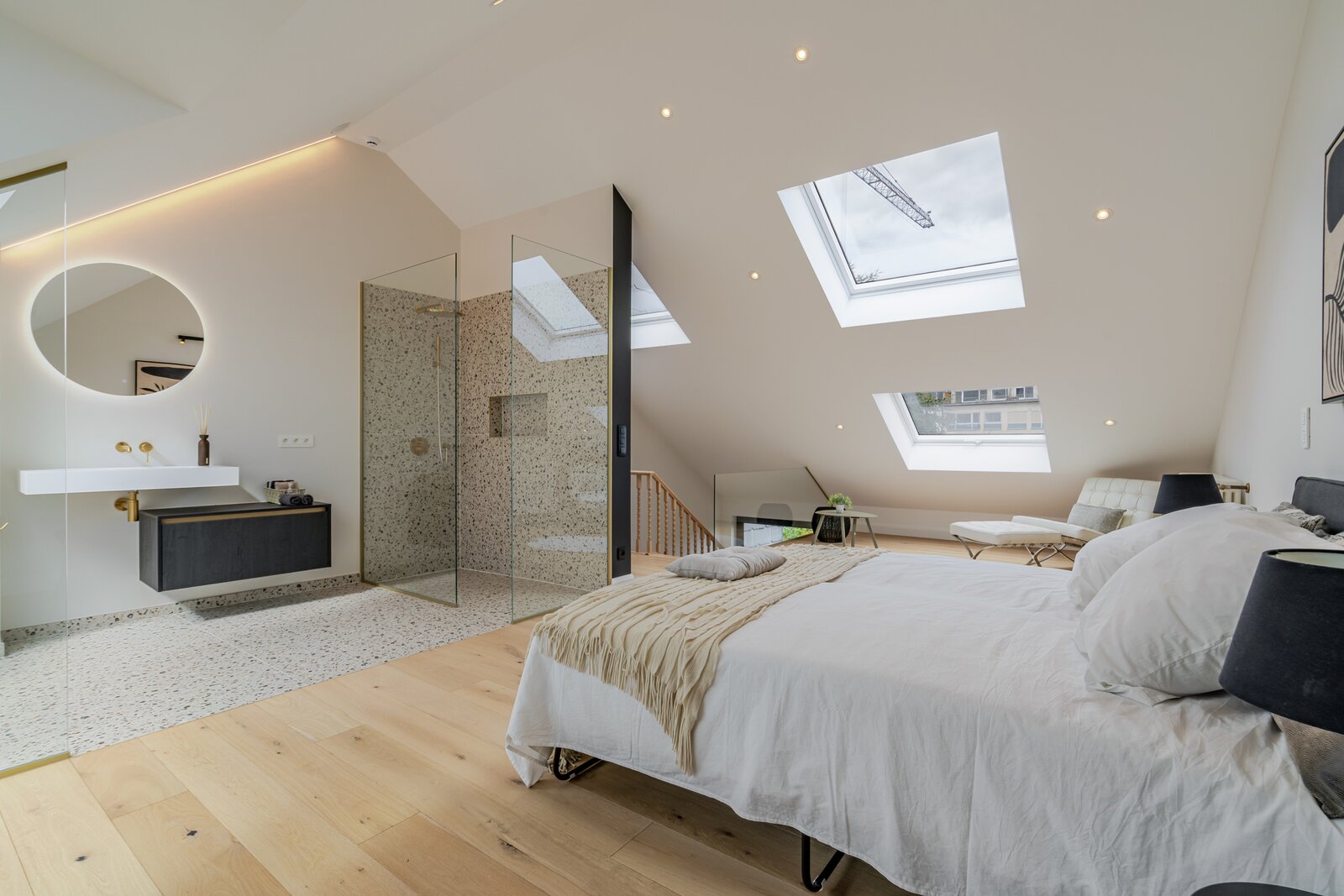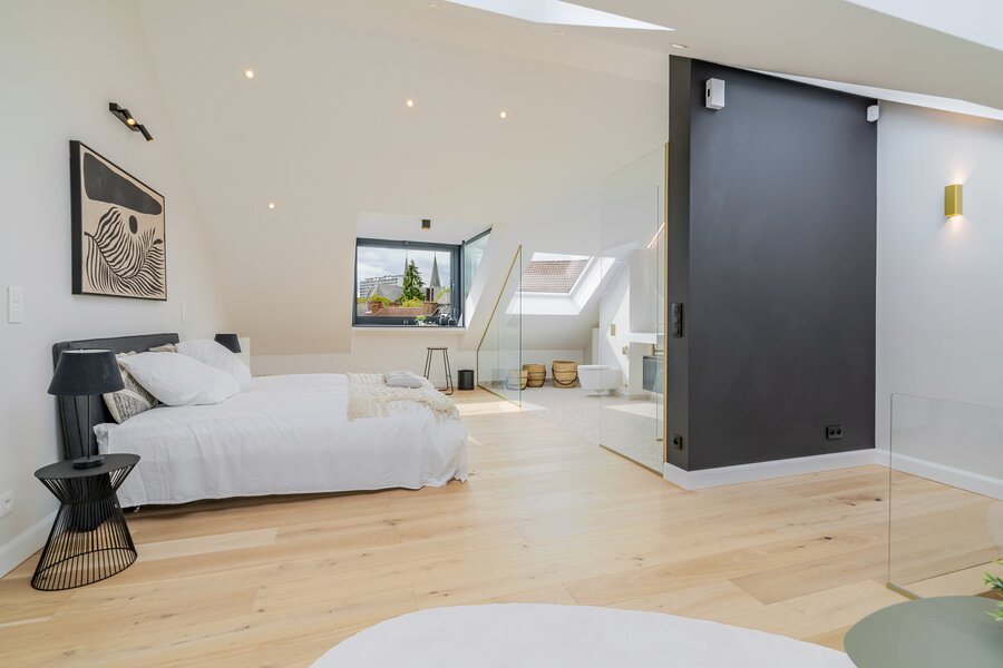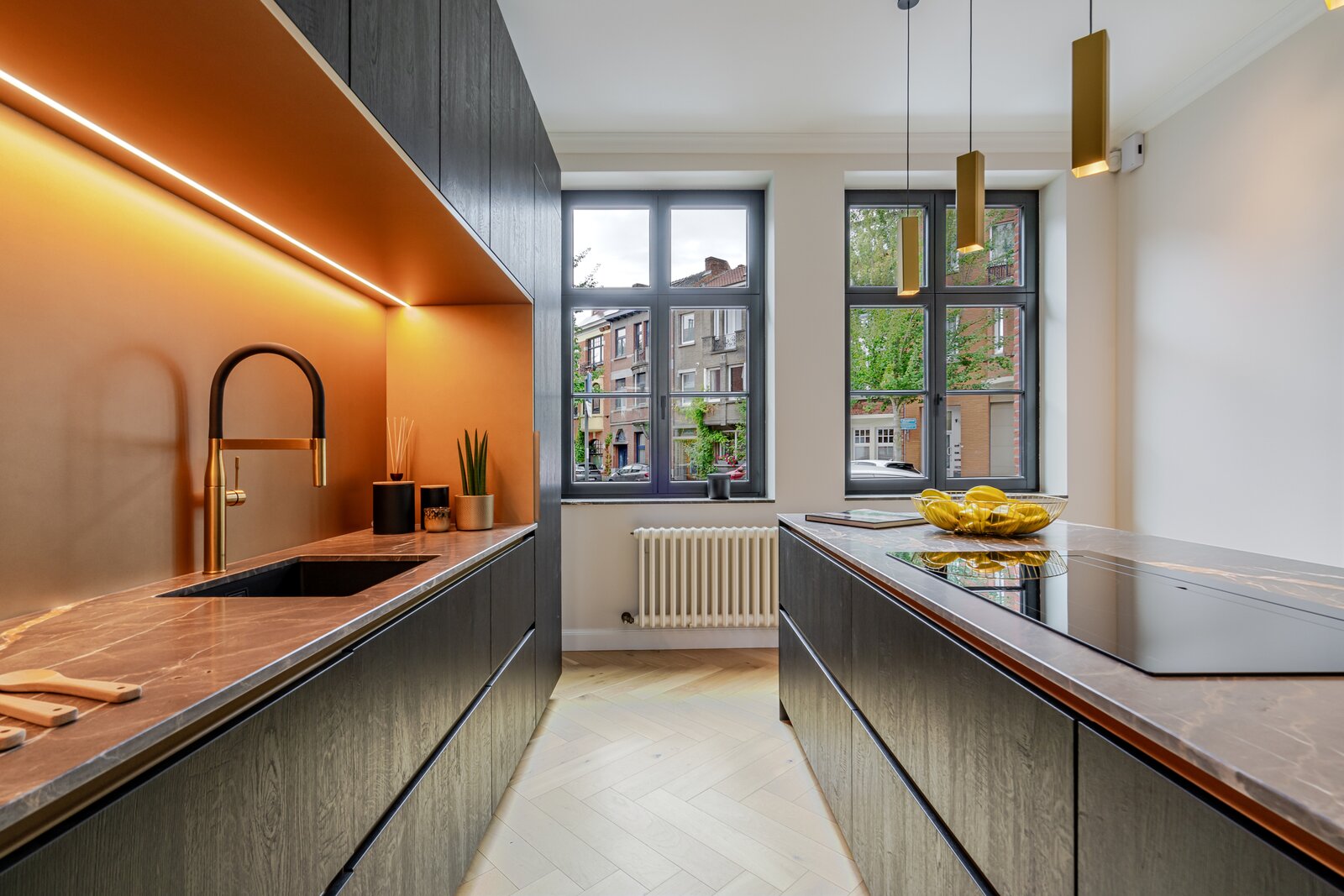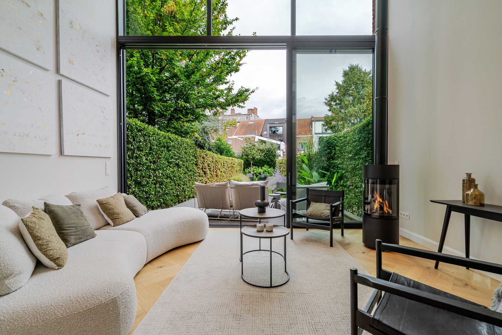 Deze architectenwoning uit 1939 onderging een totaalrenovatie met respect voor de orignele elementen in combinatie met eigentijds design. Het resultaat is een parel met alle comfort en perfecte afwerking. Verlichting van Wever&Ducré, Niko Home Control, Kraanwerk van Grohe Essence, Kroonlijst is artisanaal maatwerk, Keuken en vensterbanken in Italiaanse marmer, Visgraat parket, Blauwe hardsteen en eenheid van topmaterialen en kleurcode brengen doorheen de ganse woning sfeer en rust.