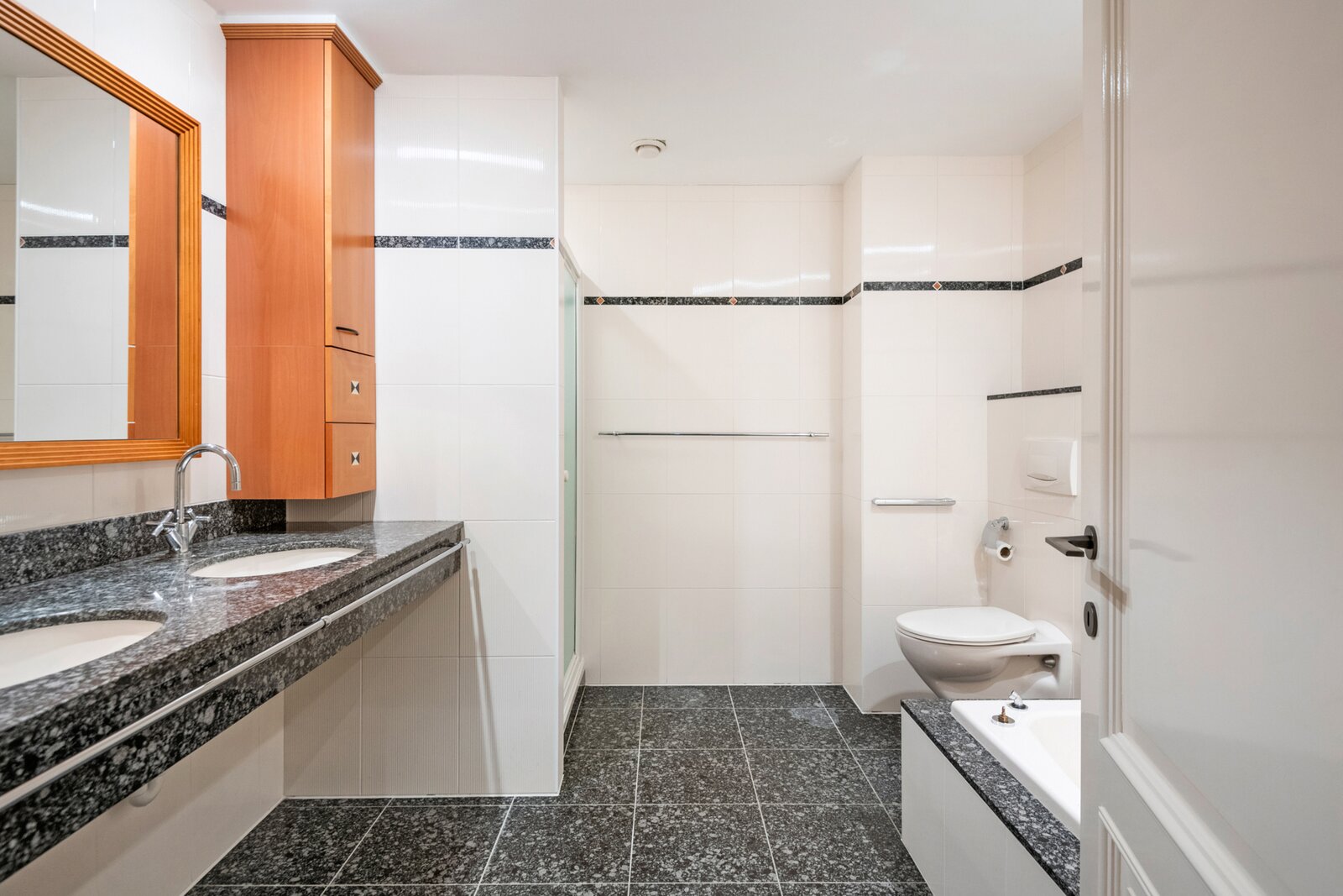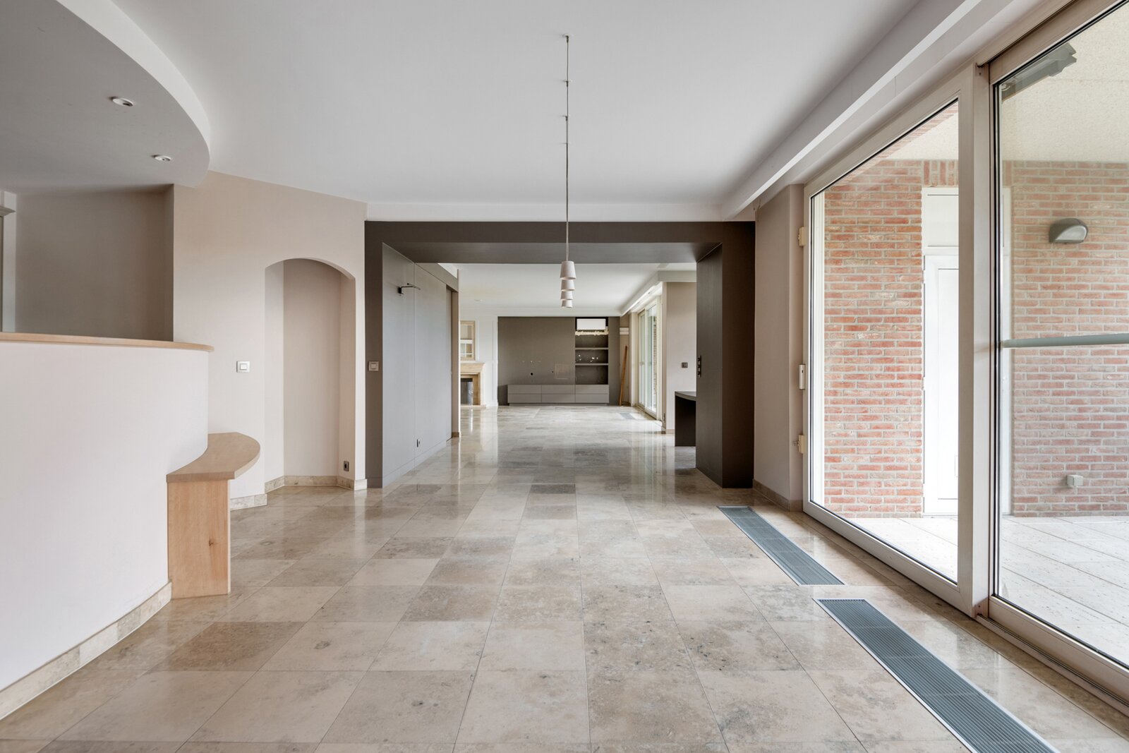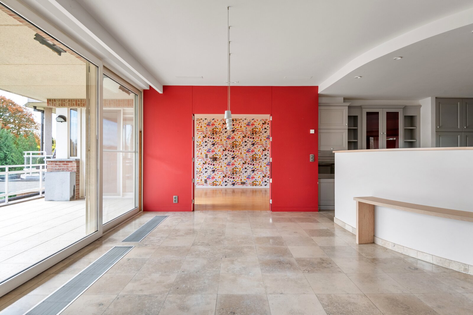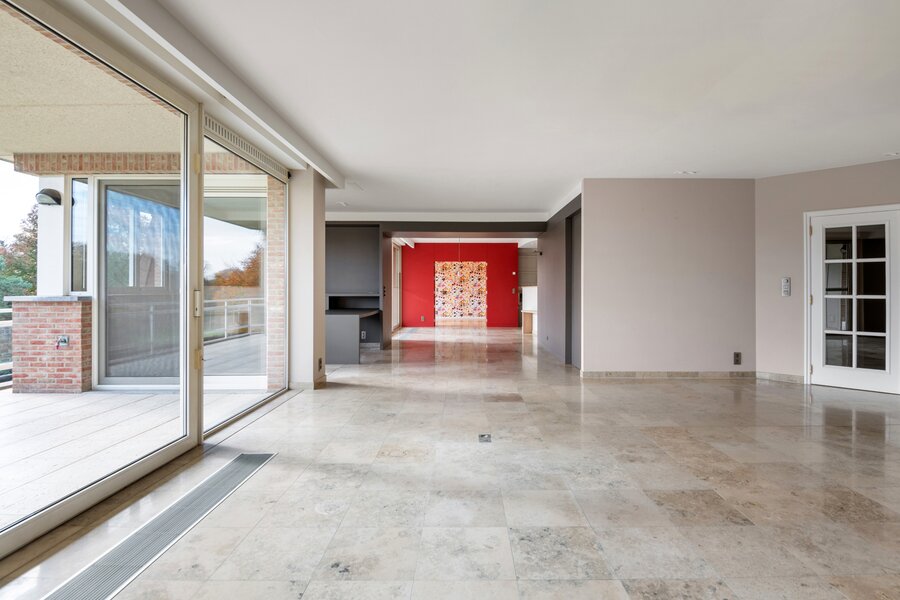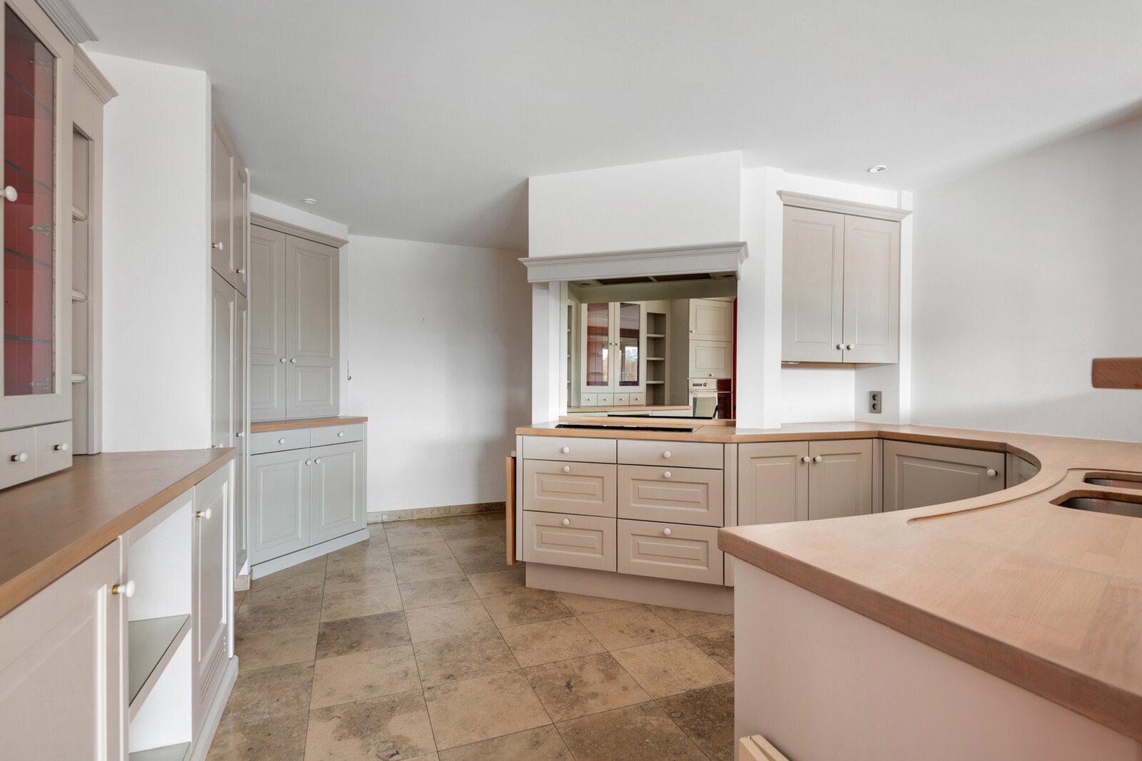 Prinsendreef 15 - 2950 Kapellen Dit prachtige en ruime appartement is gelegen in het meest recente gebouw van domein Willaard, met inrit langs de Prinsendreef. Het maakt deel uit van een prachtig parkdomein van ca 12ha en geniet een unieke rust en adembenemende zichten op het park en de vijvers. We betreden het appartement rechtstreeks met de lift in de ruime inkomhal op travertin tegelvloer. Hier bevindt zich het gastentoilet met handenwasser en een praktische ingemaakte vestiairekast. Verder door betreden we de ruime open leefruimte op dezelfde vloer. Deze omvat een zithoek met open haard en toegang tot het ruim overdekt terras (25m²) met zicht op het park. Hiernaast bevindt zich een open bureauruimte met ingemaakt meubel en kasten. Tevens een praktische ingemaakte bergkast met schuifdeur. Aansluitend komen we in de open eetkamer met toegang tot het tweede terras (25m²) met zicht op het park. De zithoek en eetkamer connecteren over de hele breedte van het appartement, wat een zeer open en ruimtelijk gevoel geeft. Naast de eetkamer bevindt zich de half op en keuken die voorzien is van alle toestellen, veel opbergruimte en een zeer praktische indeling. Aan de parkzijde bevindt zich ook de hoofdslaapkamer met rechtstreekse toegang tot het terras. Deze is voorzien van ingemaakte dressingkasten en extra opbergruimte. Ensuite treffen we de hoofd badkamer met ligbad, dubbele lavabo, wc en inloopdouche. Deze badkamer werd reeds vernieuwd. Aan de achterzijde van het appartement bevindt zich de nachthal, die toegang geeft tot een 2e slaapkamer op parket met eigen balkon op de noordzijde, tevens voorzien van eigen badkamer met ligbad, douche, dubbele lavabo en wc. Tenslotte is er nog de derde slaapkamer op parket met eigen balkon. Hiernaast is ook een praktische wasplaats/berging ondergebracht met aansluitingen wasmachine en droogkast. De beide terrassen aan de zuid-west georiënteerde parkzijde van het domein zijn overdekt en voorzien van een extra berging. Hier geniet u heel de dag door van het prachtige zicht en de aangename ochtend en middagzon. Eén van de terrassen is voorzien van terrasverwarmers. In de ondergrondse garage zijn nog een autostaanplaats met berging en afgesloten garagebox inbegrepen in de prijs.