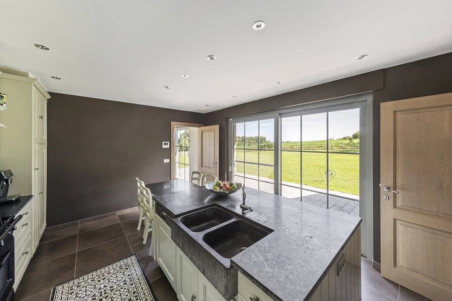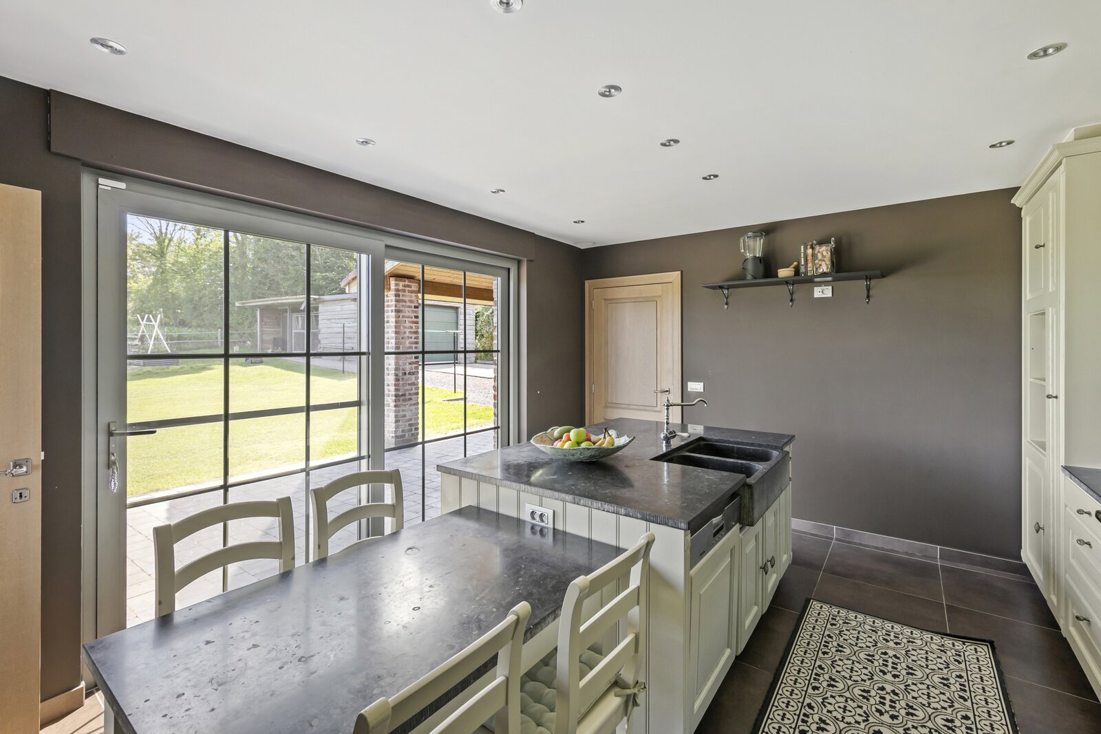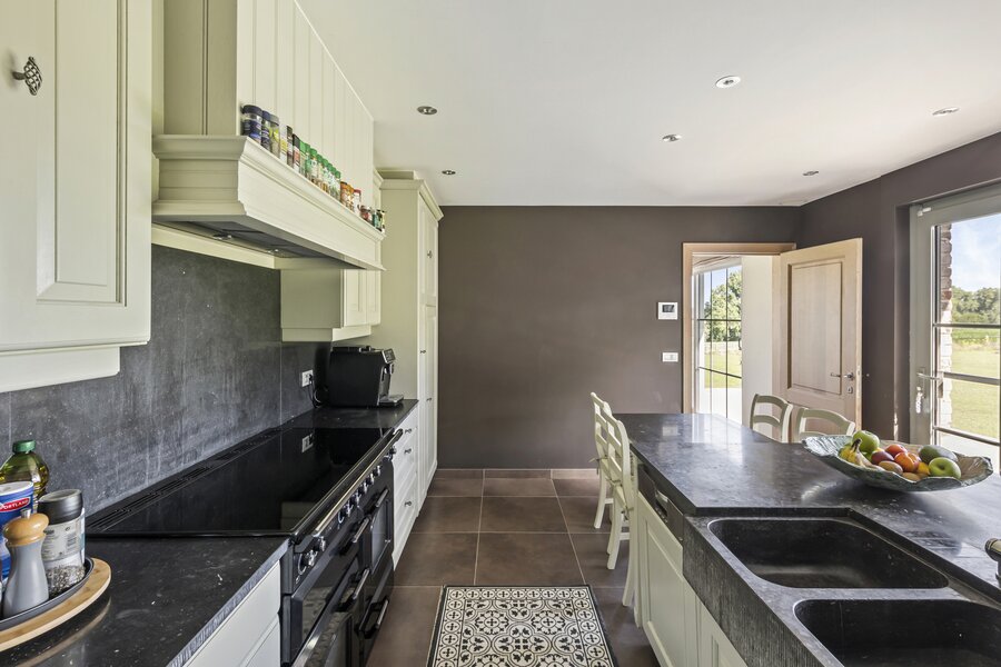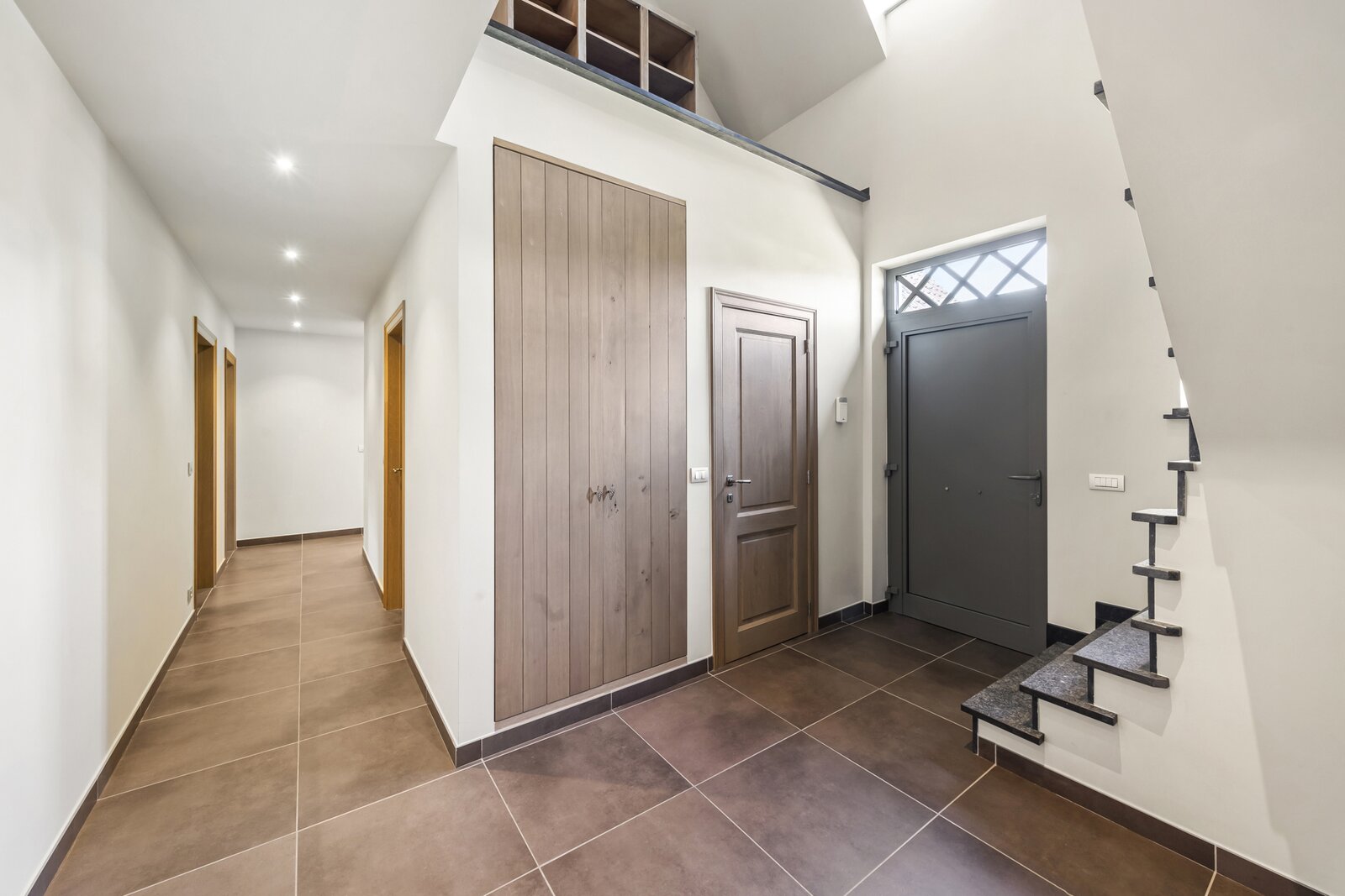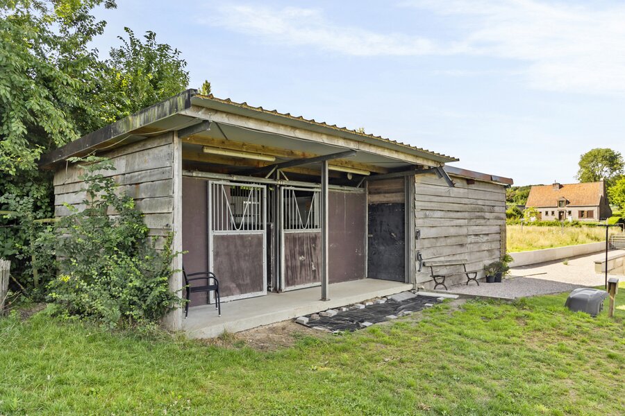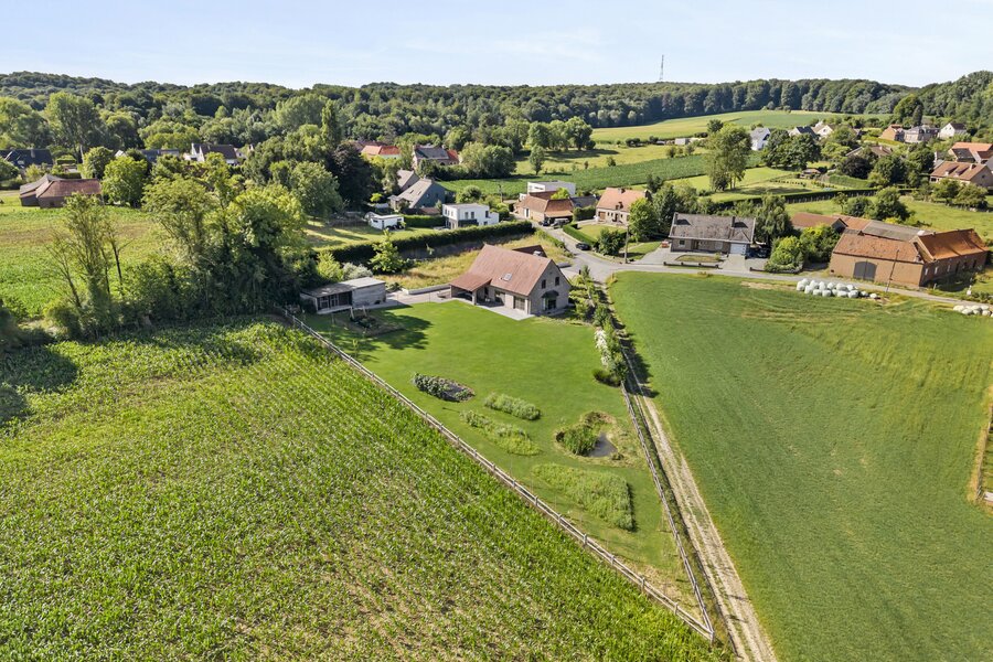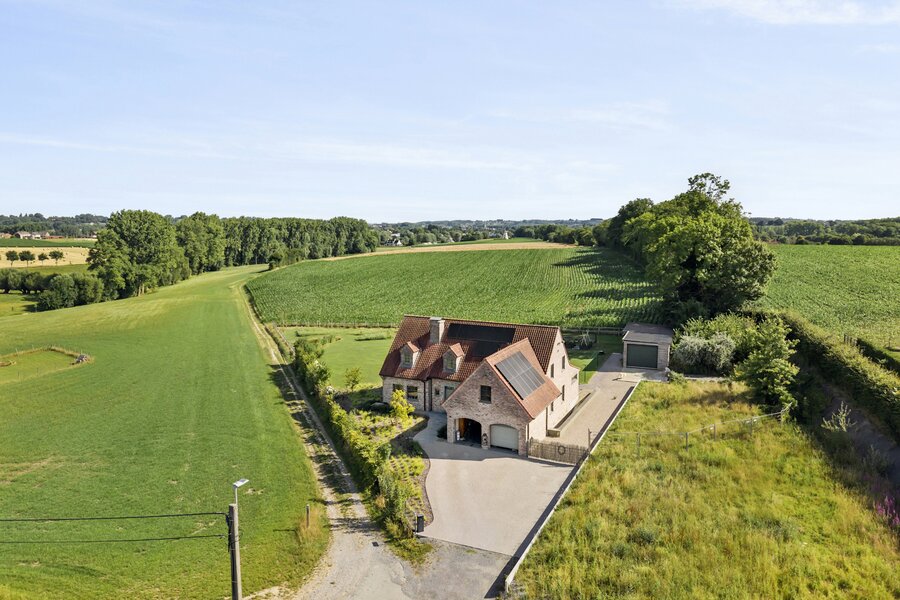 Unieke eigendom op 3.000 m² met 6 slaapkamers waarvan 2 met dressing, 2 badkamers, bureauruimtes en volledig onderkelderd (2,6 m hoog). Ingerichte keuken, vloerverwarming via warmtepomp, zonnepanelen (7.000 kWh), regenwateropvang (70.000 L met UV-filter). Dubbele garage, overdekt terras, aangelegde tuin met waterpartij, 2 paardenboxen. 2 laadpunten, B&B- of kangoeroewoning mogelijk.