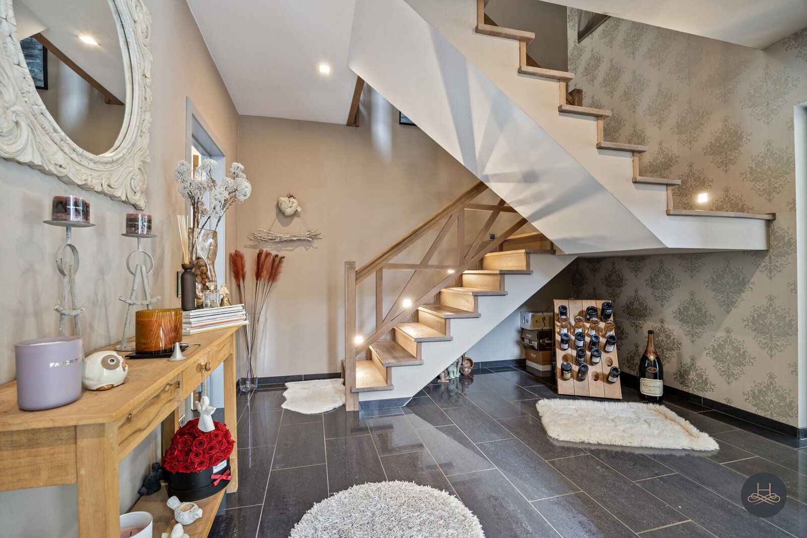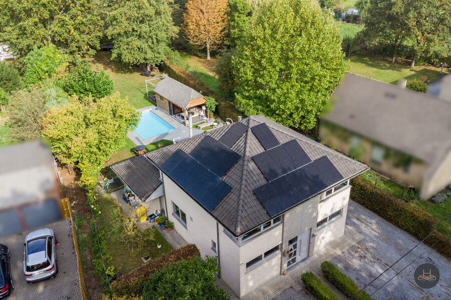 Hierboven beschikt de woning over 18 zonnepanelen van 2023 met een vermogen van 6.000 Wp, waardoor u kunt genieten van een lager energieverbruik en een gunstig energiepeil.
