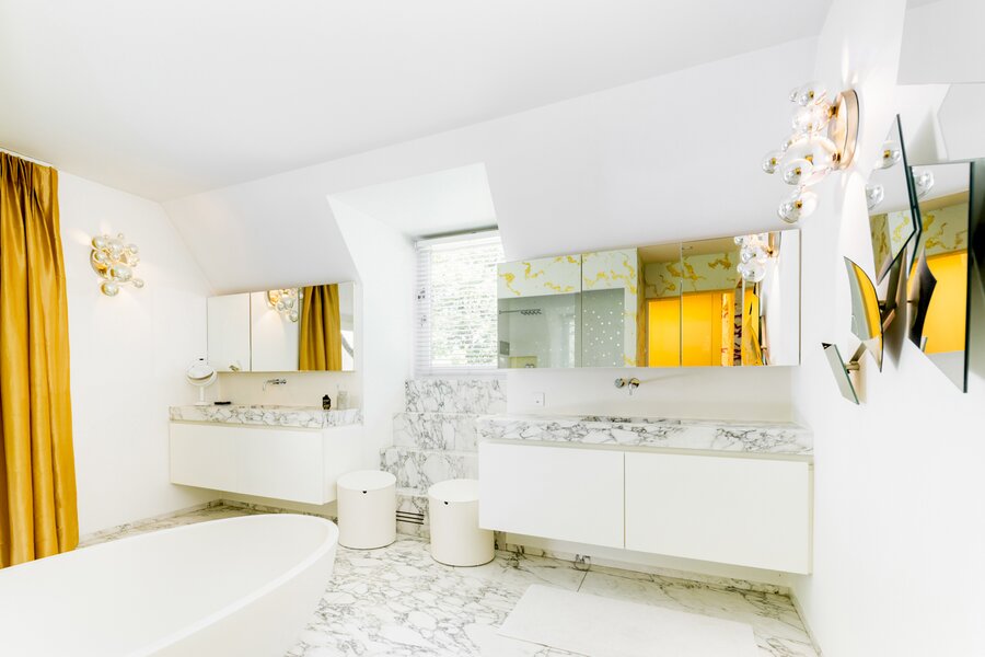 Op +1 ligt een eerste slaapkamer met badkamer en dressing (nu wasplaats) en super-de-luxe master met dressing, badkamer en tweede dressingkamer met ingemaakte kasten. Übercoole bonus: je eigen bar met home cinema of ontspanningsruimte.