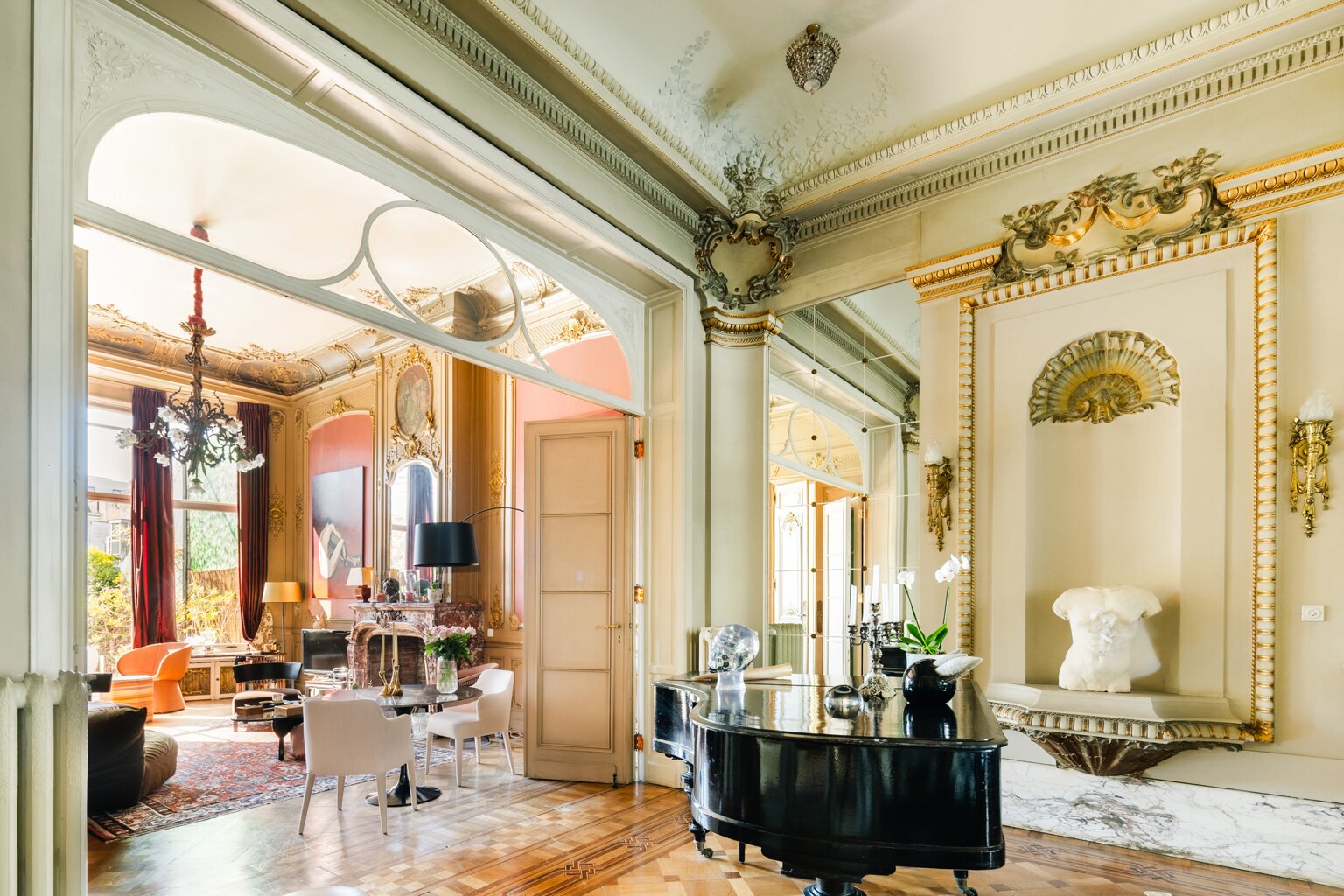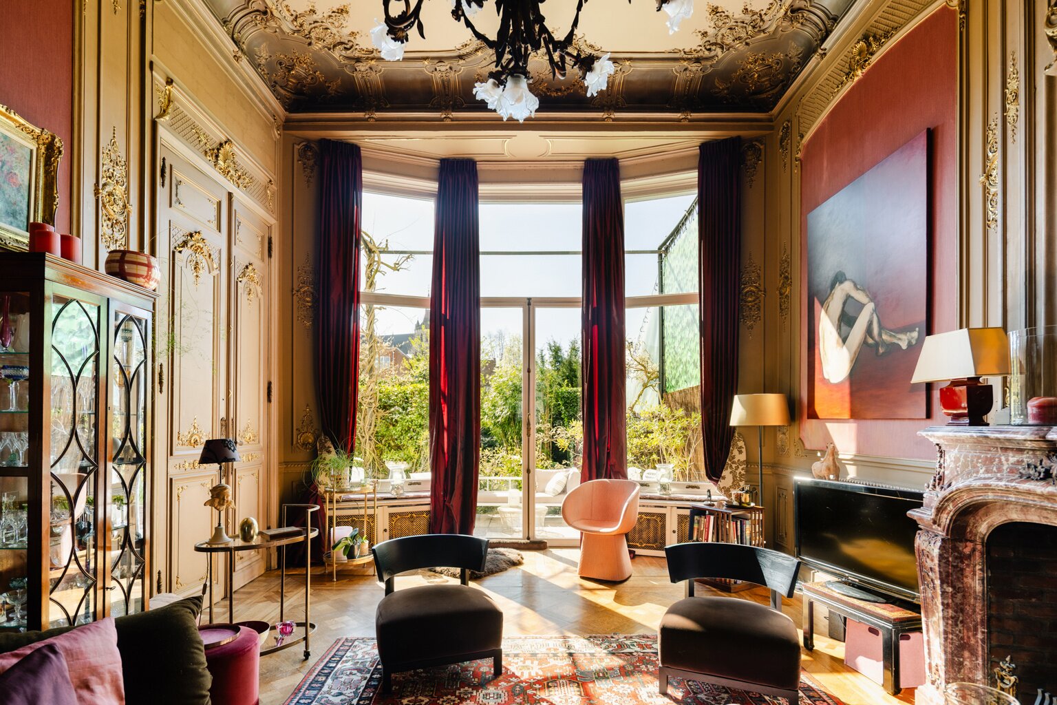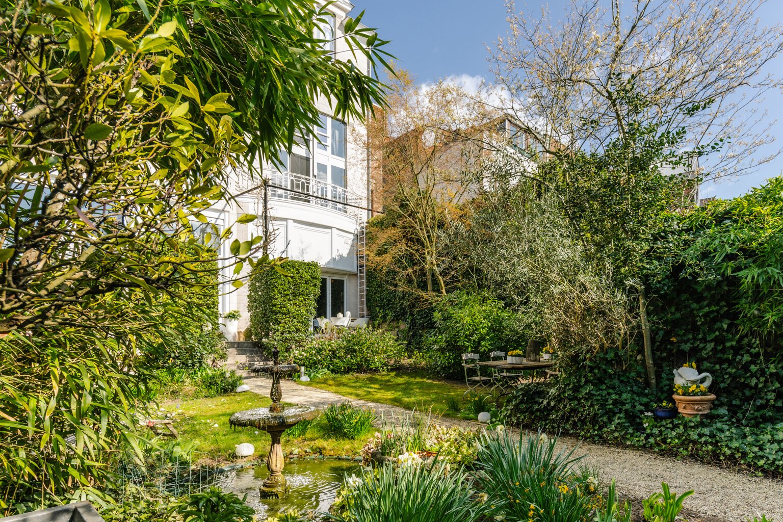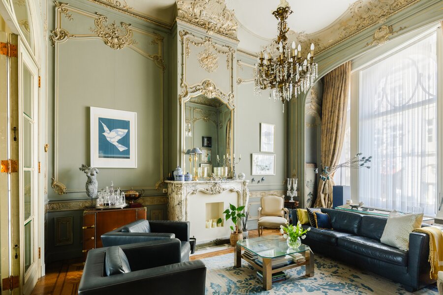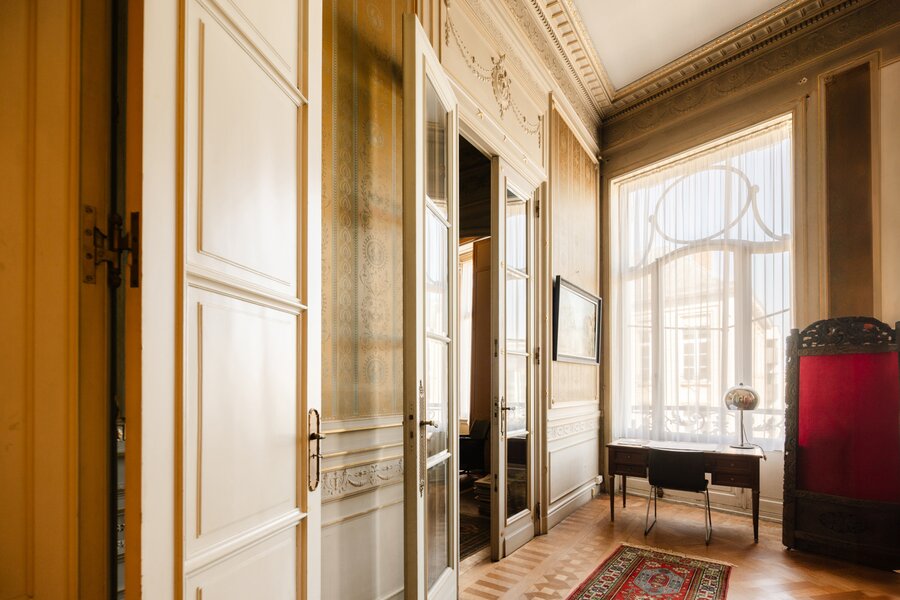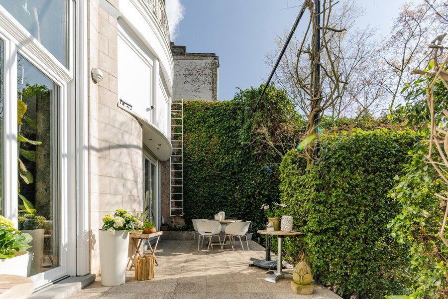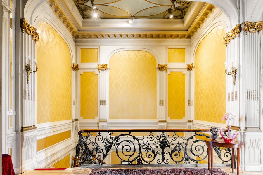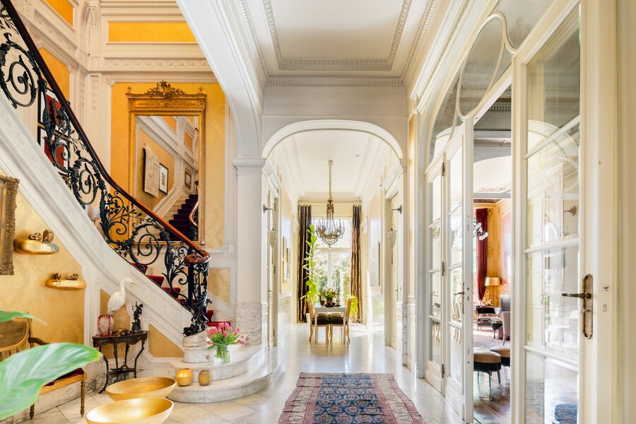 Binnenin wachten meerdere weelderige salons, een eetkamer, bibliotheek, bureau, pianokamer, dressing, diverse slaapkamers en badkamers. De keuken opent via een harmonicadeur naar een zalig terras en zonnige tuin. Helemaal boven wacht nog een riante zolderverdieping met een uniek uitzichtspunt over de stad.