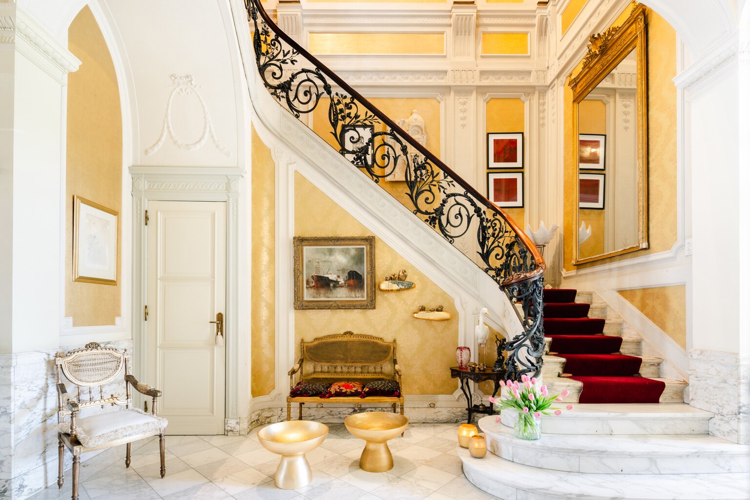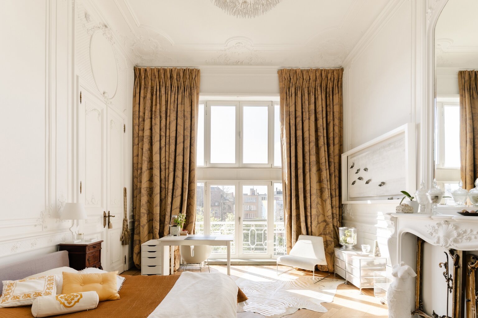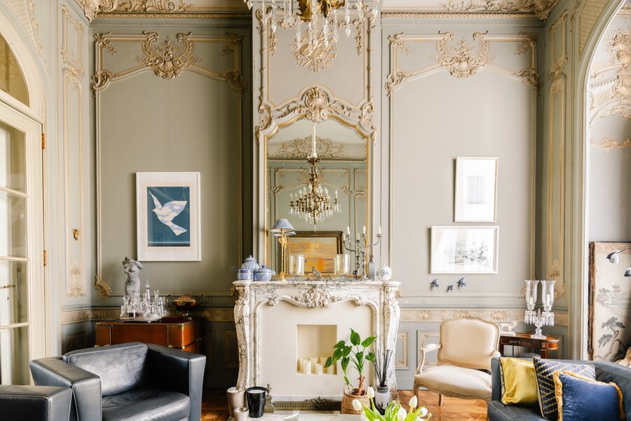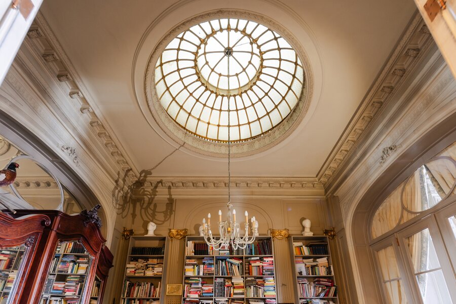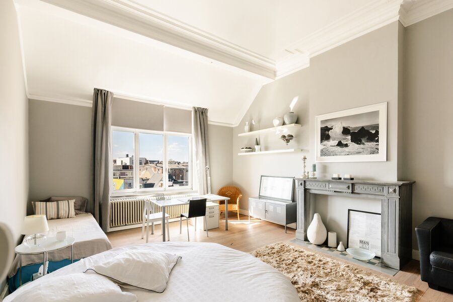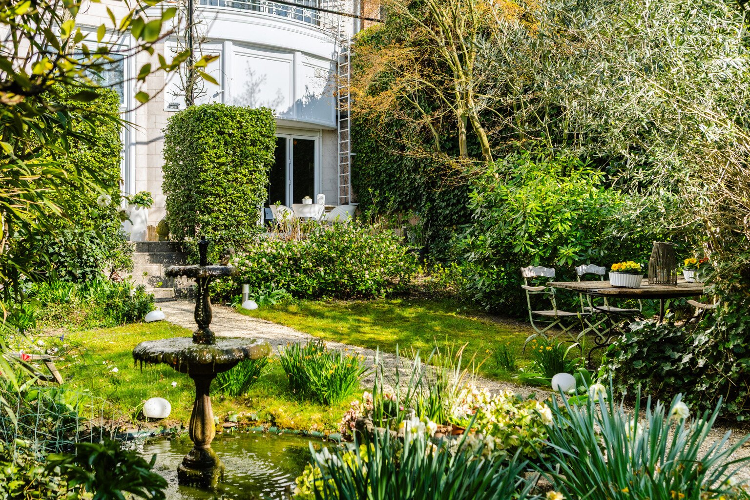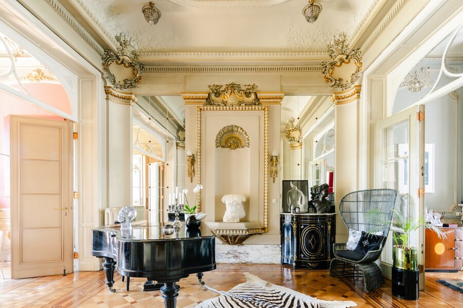 Binnenin wachten meerdere weelderige salons, een eetkamer, bibliotheek, bureau, pianokamer, dressing, diverse slaapkamers en badkamers. De keuken opent via een harmonicadeur naar een zalig terras en zonnige tuin. Helemaal boven wacht nog een riante zolderverdieping met een uniek uitzichtspunt over de stad.