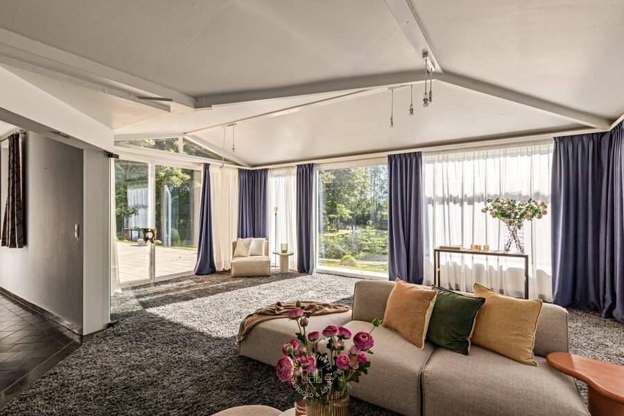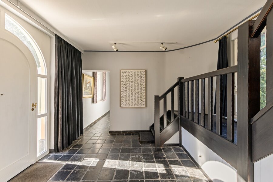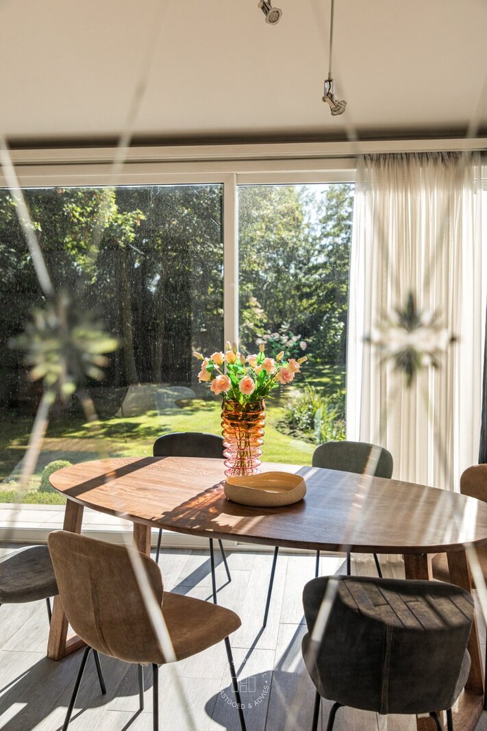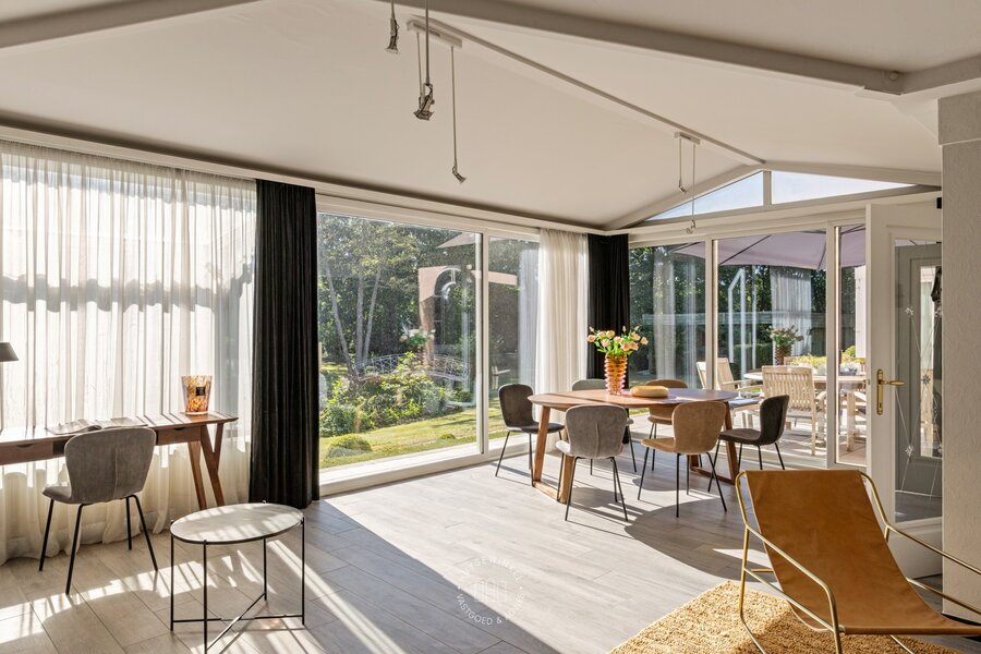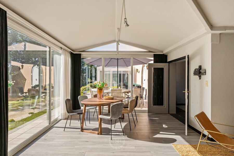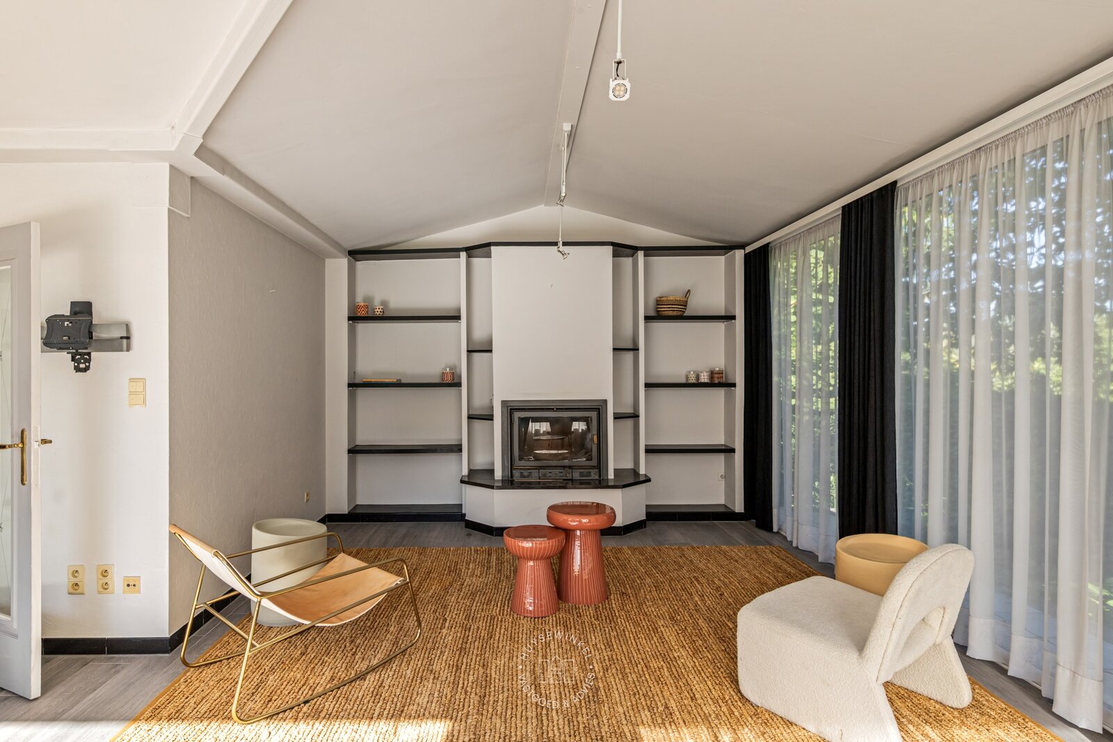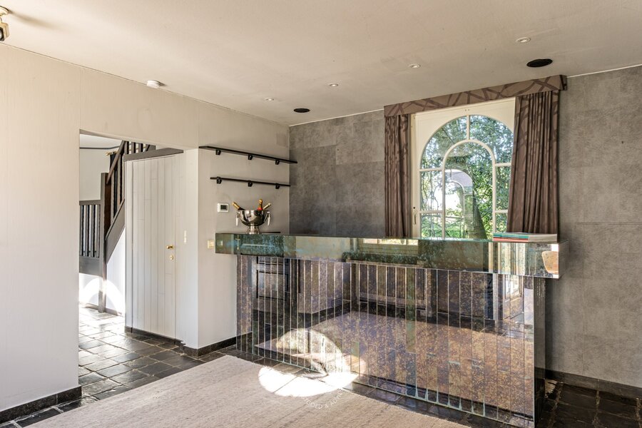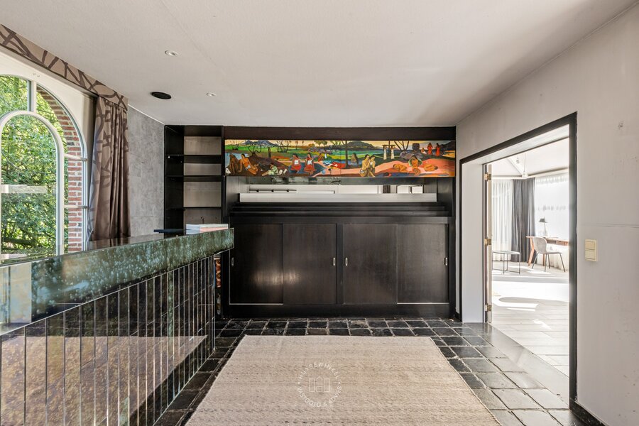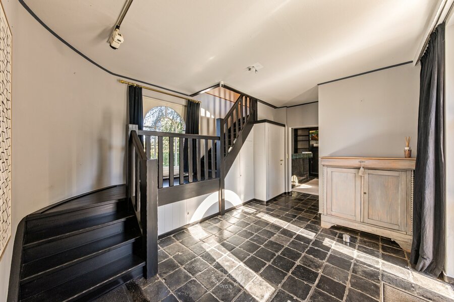 U betreedt de woning via de rijkelijke trap aan de achterzijde en komt binnen in de centrale inkomhal met gastentoilet. Aan de rechterkant bevindt zich een sfeervolle retrobar — perfect om gasten te ontvangen. Deze ruimte loopt door naar de eerste aanbouw: een gezellige leefruimte met houthaard en een prachtig zicht op de tuin. Aan de andere kant van de woning leidt een gang naar de keuken en de tweede aanbouw, momenteel ingericht als eetkamer, eveneens met houthaard en tuinzicht.