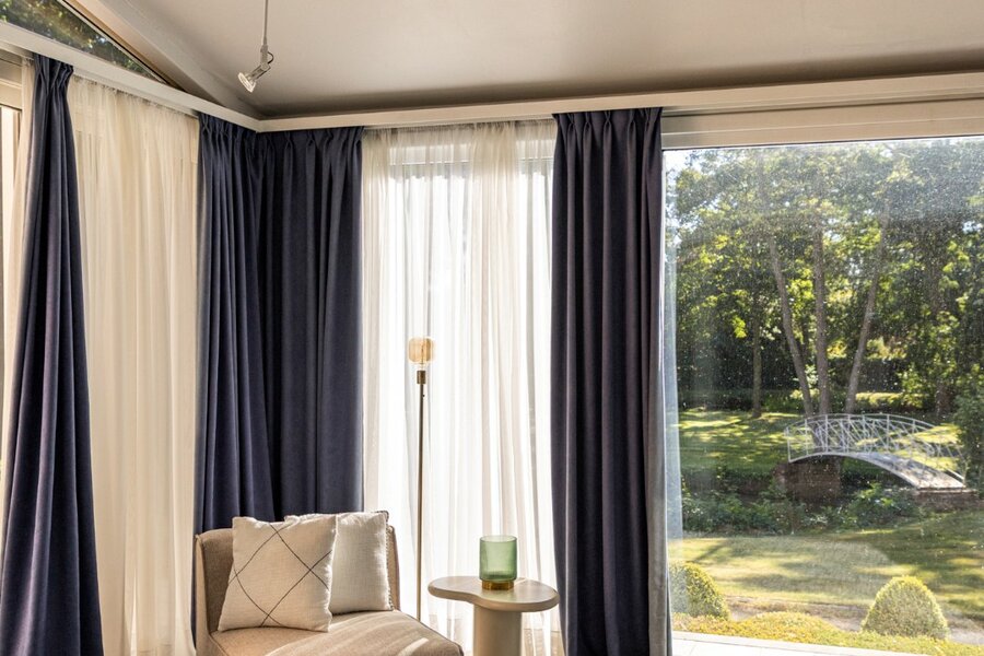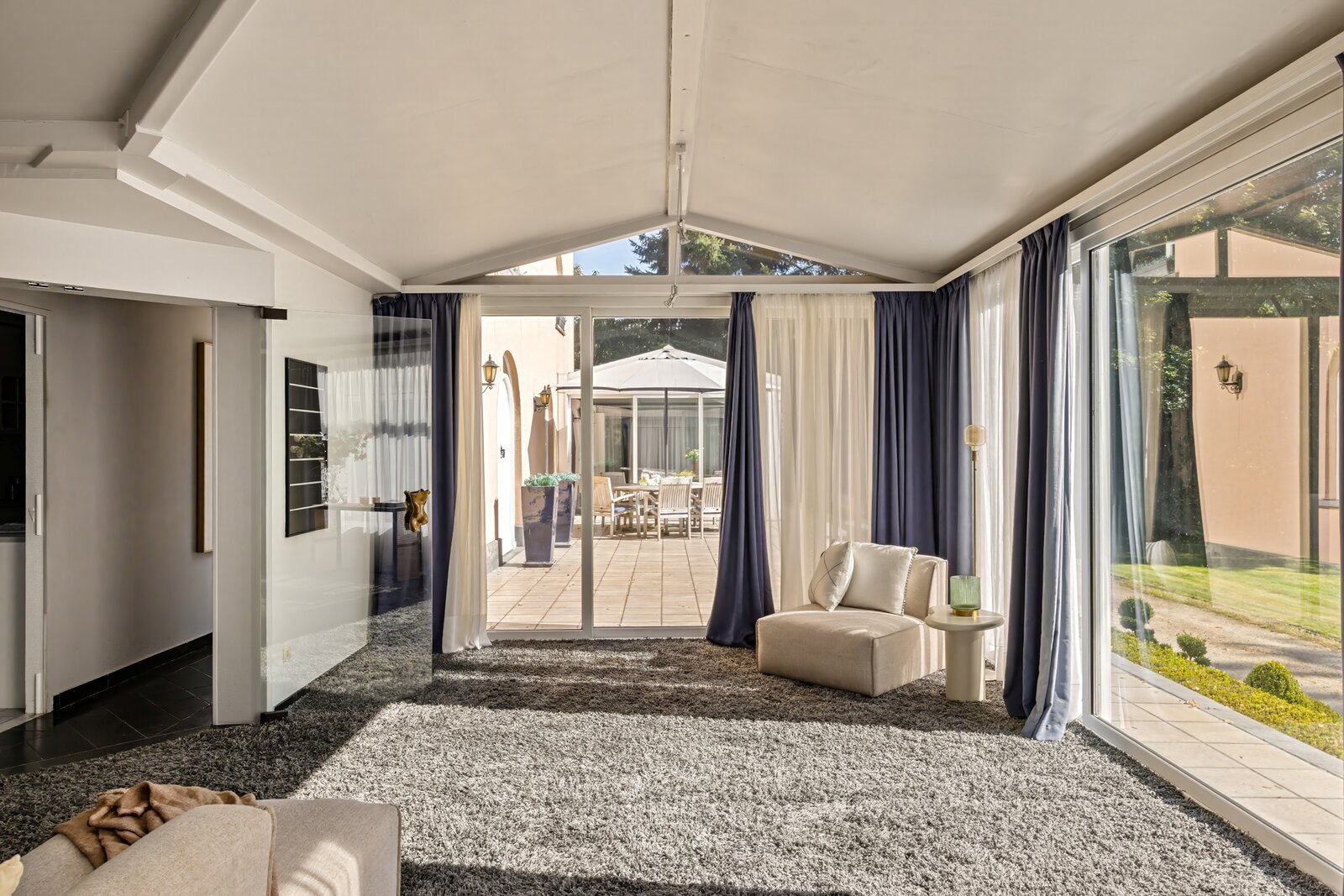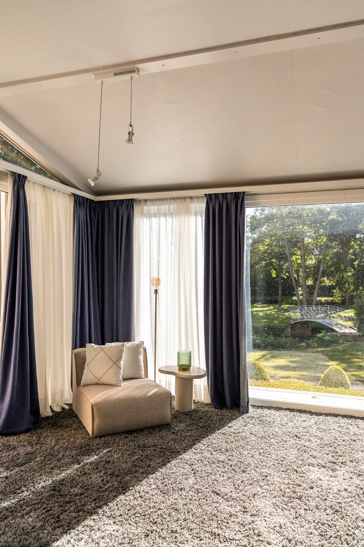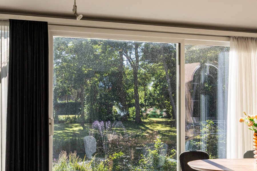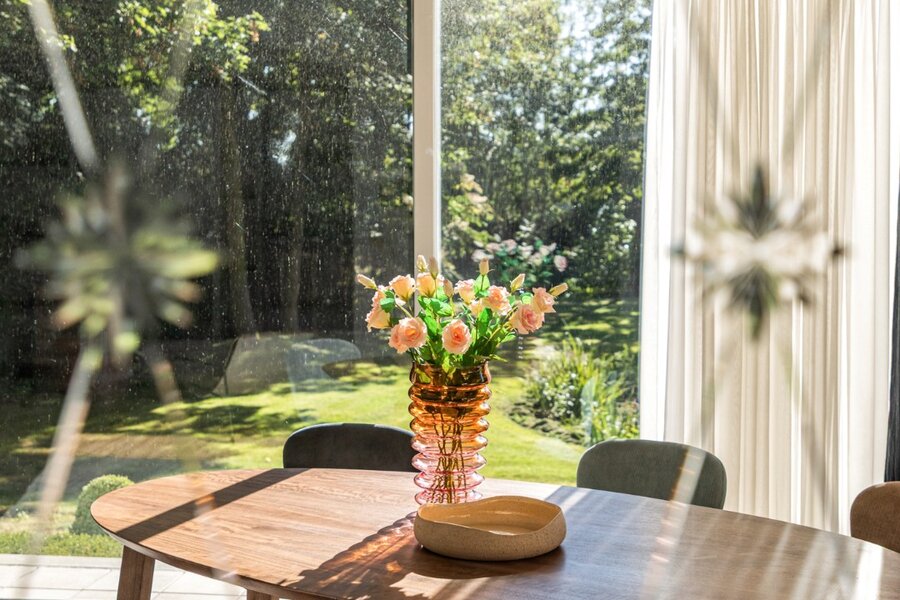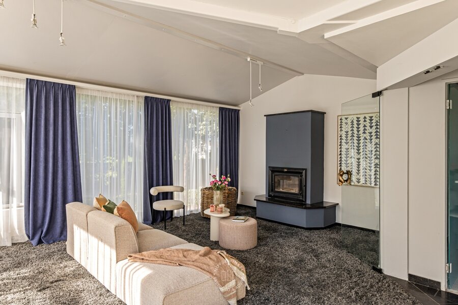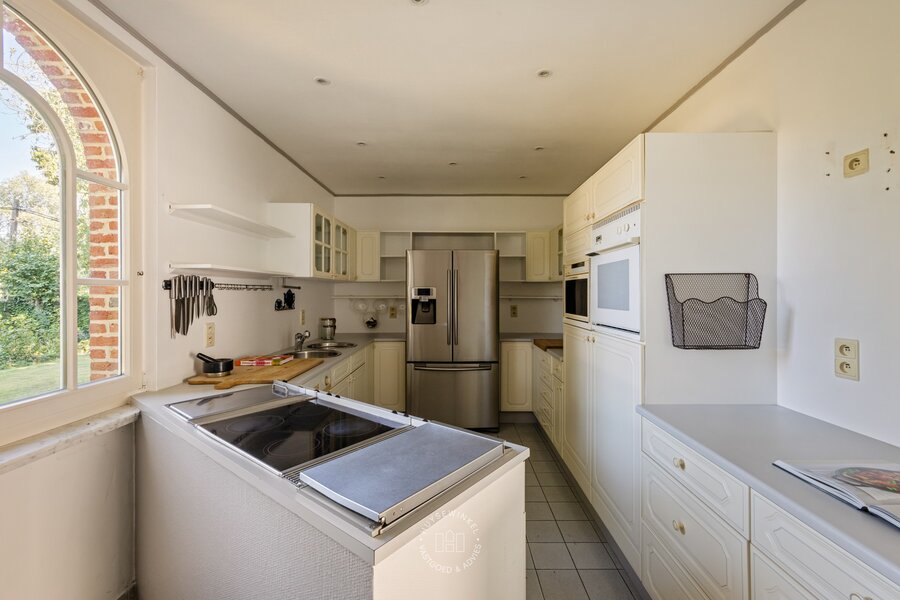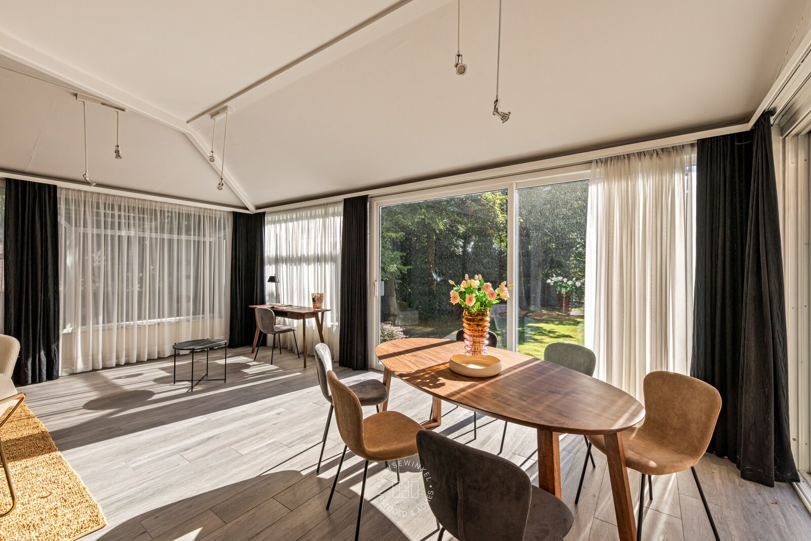U betreedt de woning via de rijkelijke trap aan de achterzijde en komt binnen in de centrale inkomhal met gastentoilet. Aan de rechterkant bevindt zich een sfeervolle retrobar — perfect om gasten te ontvangen. Deze ruimte loopt door naar de eerste aanbouw: een gezellige leefruimte met houthaard en een prachtig zicht op de tuin. Aan de andere kant van de woning leidt een gang naar de keuken en de tweede aanbouw, momenteel ingericht als eetkamer, eveneens met houthaard en tuinzicht.