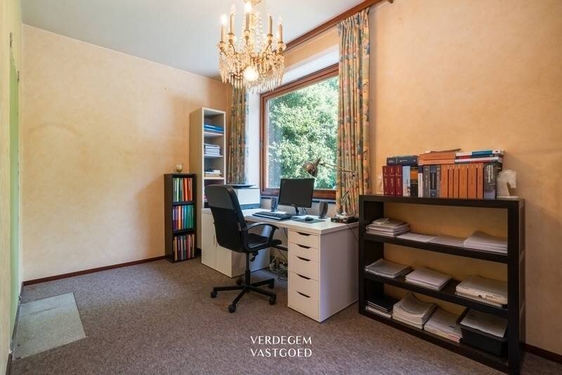 De leefruimte ontvouwt zich in verschillende zones die vloeiend in elkaar overlopen: een eethoek, een gezellige zithoek met zicht op de tuin, een aparte hobbykamer en een bureau.