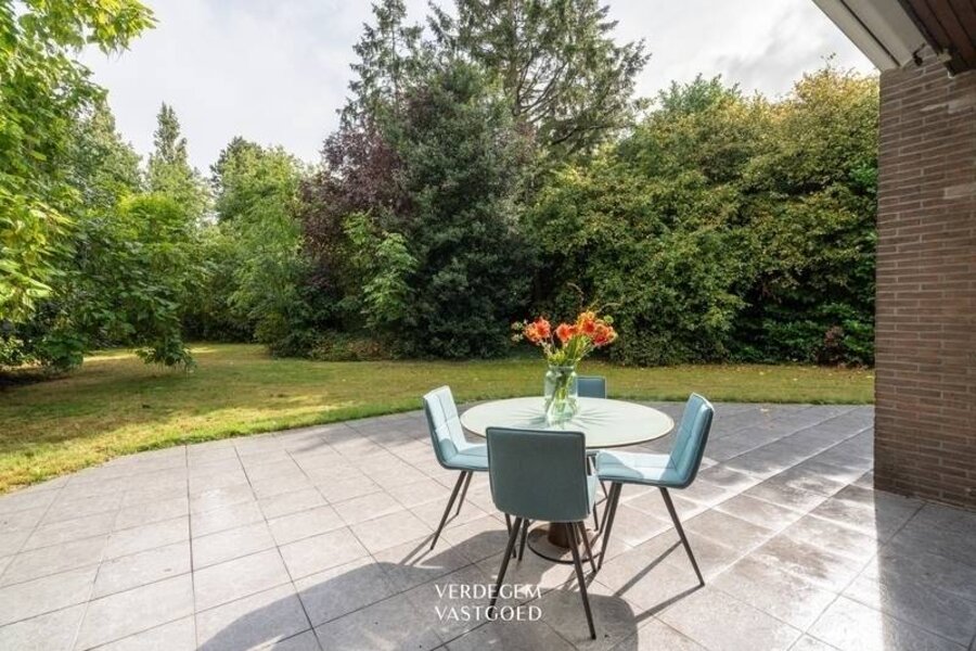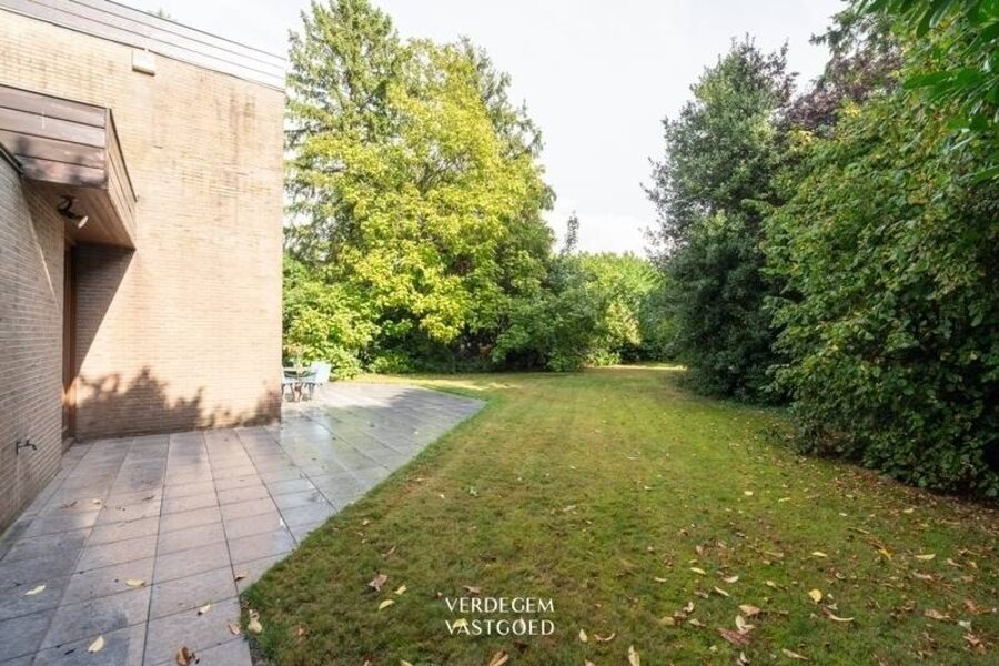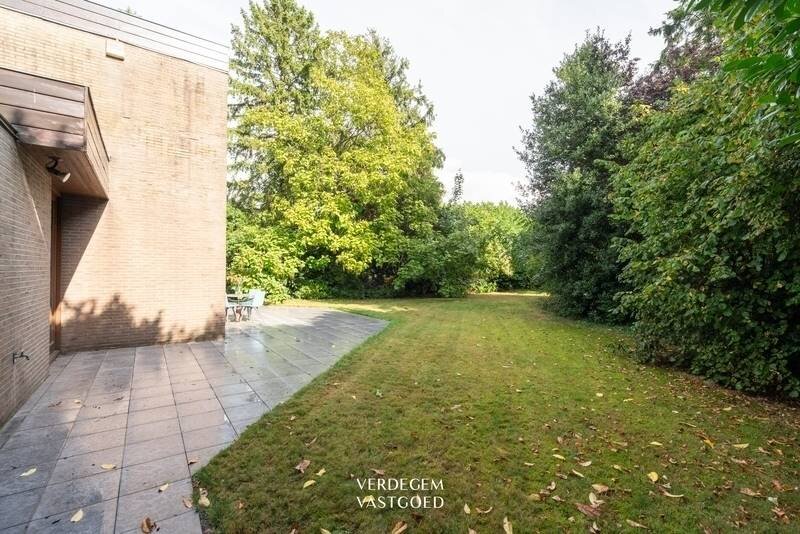De grote tuin, omringd door volwassen bomen, creëert een oase van rust en privacy.