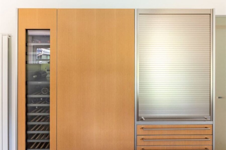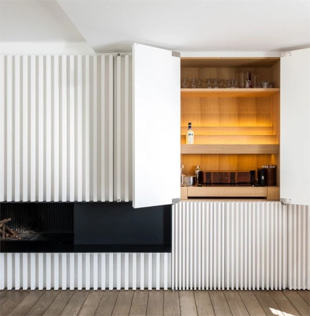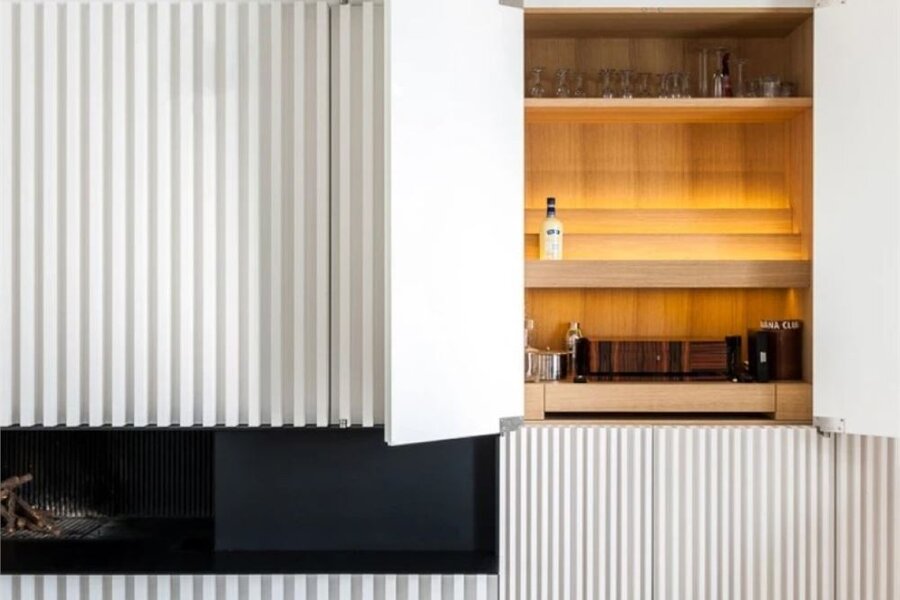 Horizontale lijnen en maatkasten creëren een uniforme, serene stijl.